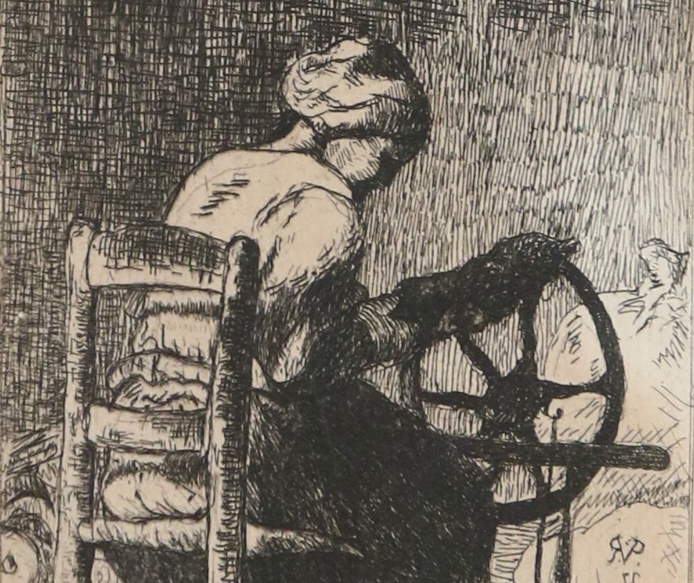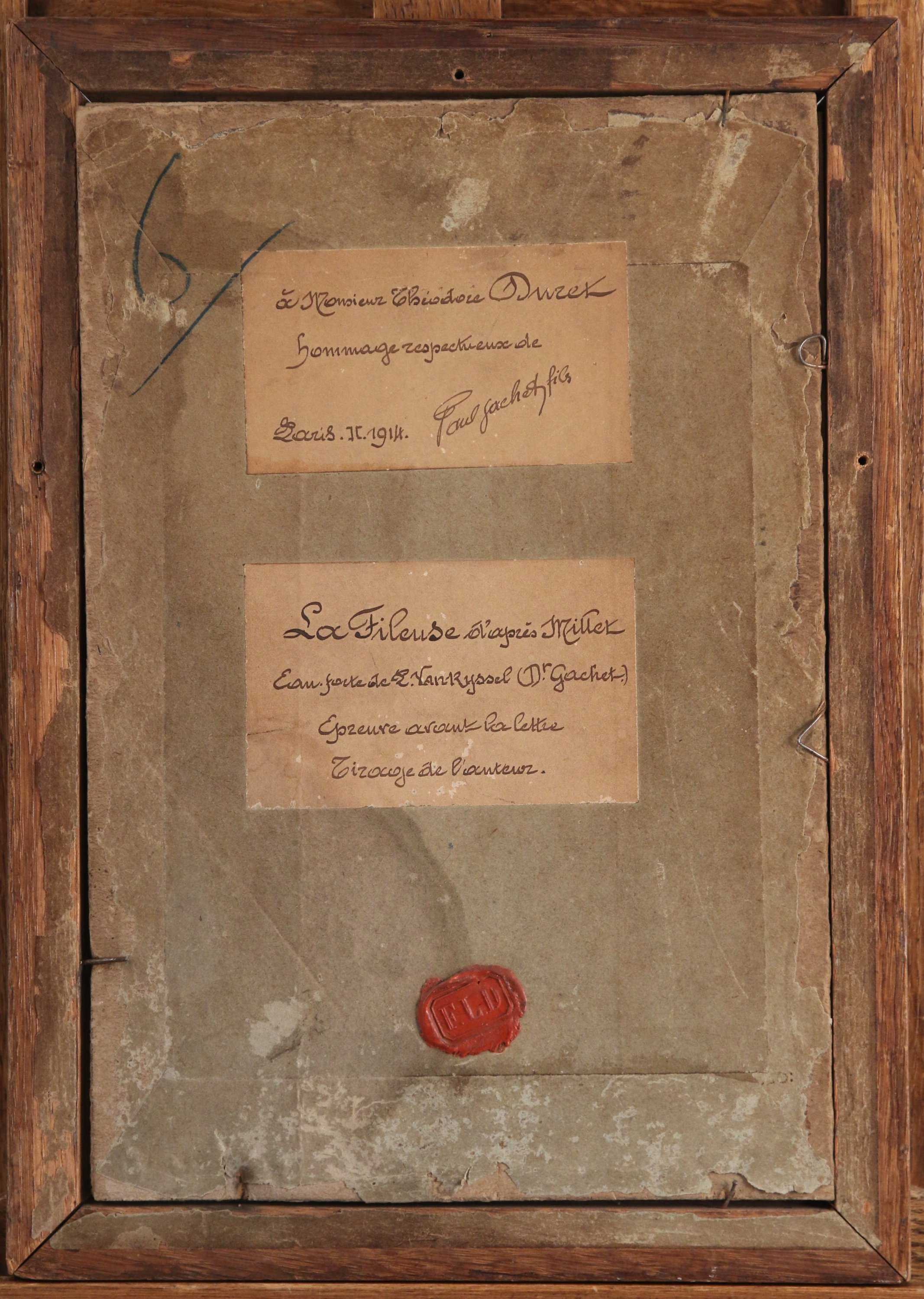 Envoi au dos : "à Monsieur Théodore Duret Hommages respectueux de Paul Gachet Fils" daté Paris 1914" et légendé "La Frileuse d'après Millet / Eau forte de P Van Ryssel (Dr Gachet) Épreuve avant la lettre. Tirage de l'auteur".