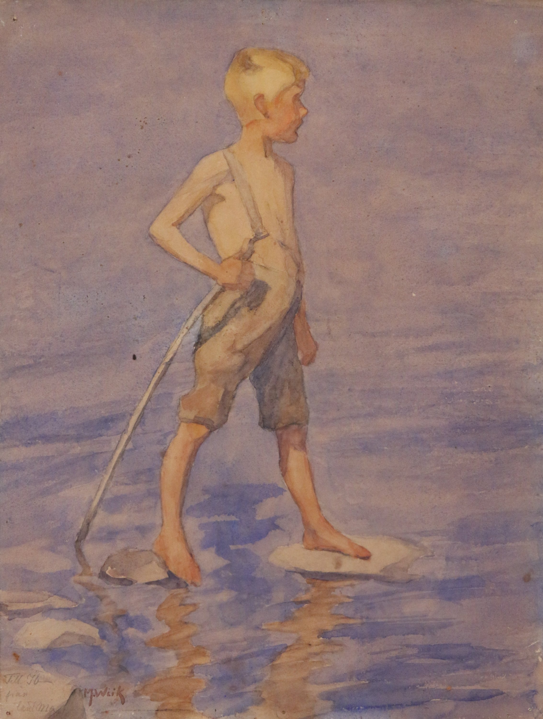 Cette aquarelle pourrait être une étude préparatoire pour l'huile sur toile présentée en vente publique le 11 décembre 2004 sous le titre "Pojke på stranden" et datée de 1901. (Jubileumsauktion, 11 décembre 2004, n°137, p. 80). Le catalogue raisonné précise le prénom de cet enfant : Kalle, qui est l'un des diminutif de Karl.