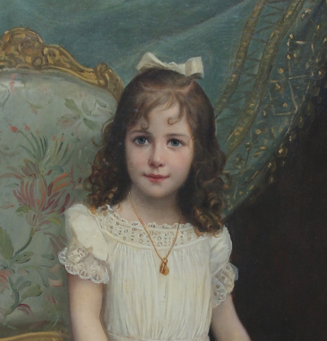 Portrait de Gabrielle Dauvilliers (1888-1891) ?, en robe de mousseline blanche, assise sur une chaise en bois sculpté et doré.