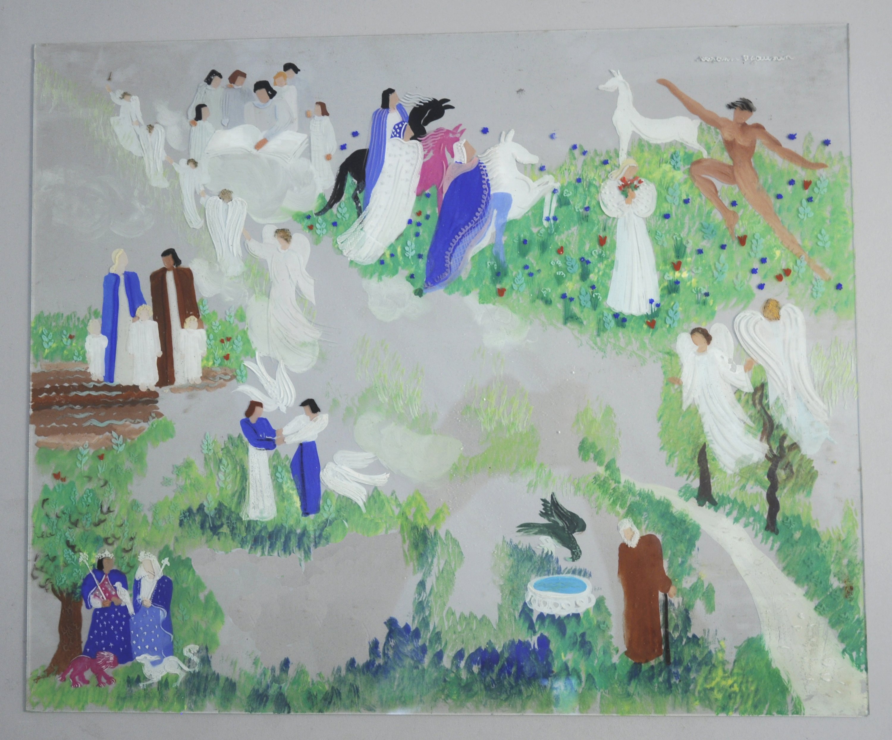 Ensemble de deux PEINTURES sur VERRE, titrées en bas à gauche et en bas à droite et signées en haut à droite.