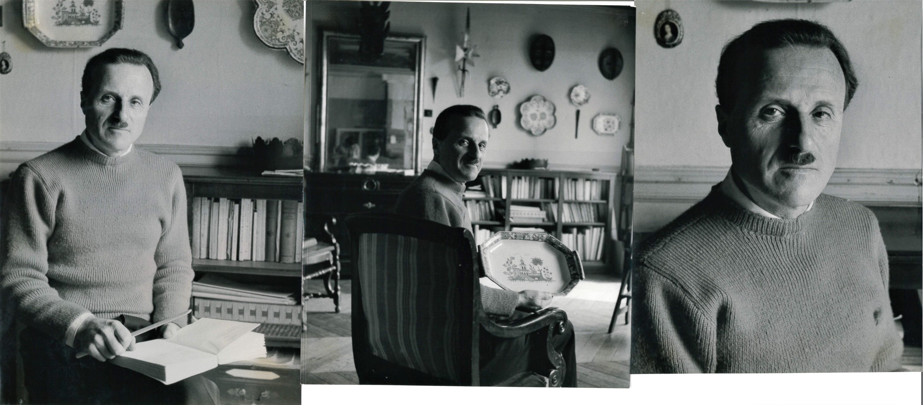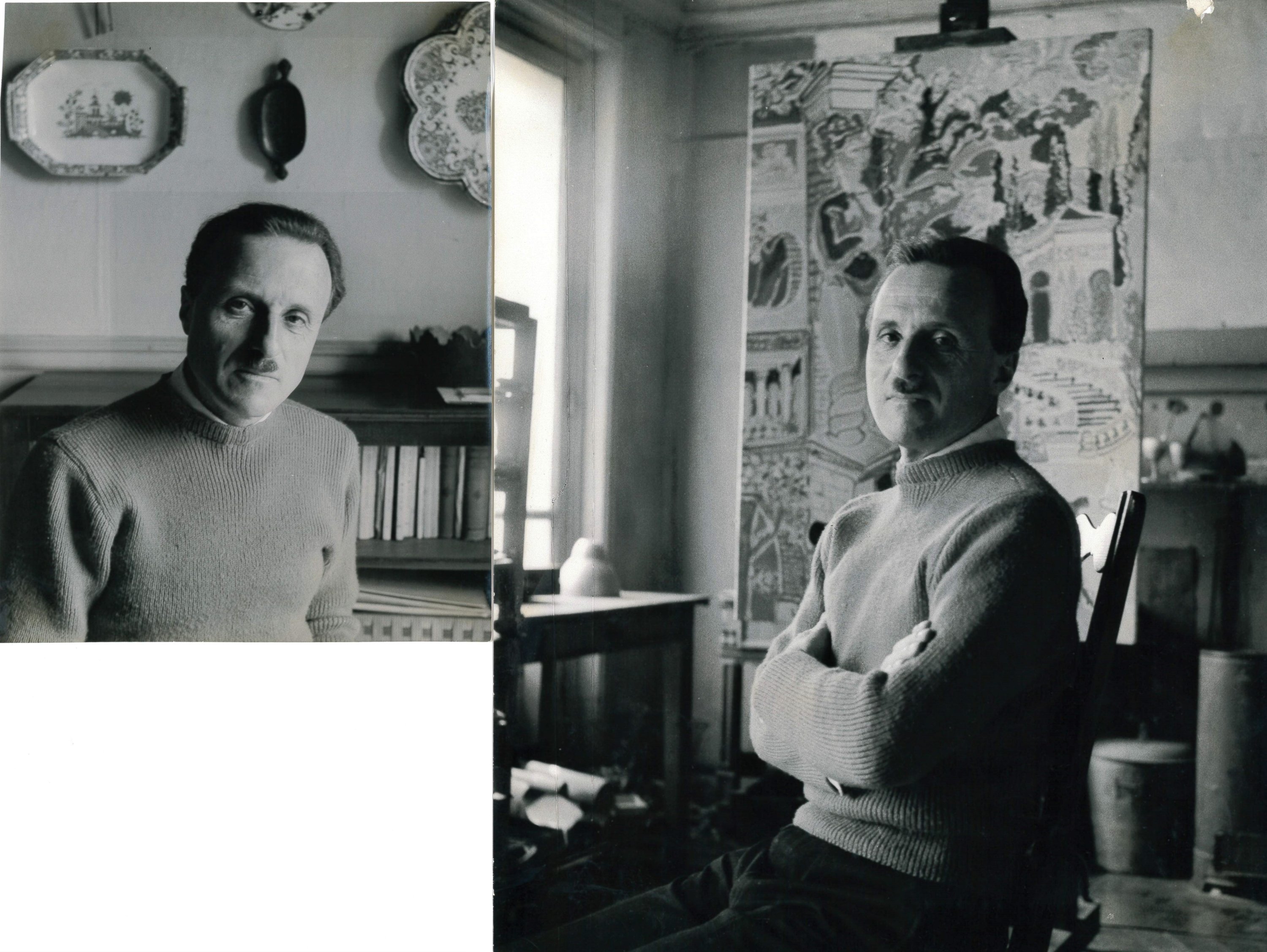atelier, notamment devant la grande huile sur toile " Jardin Baroque " datée de 1954.