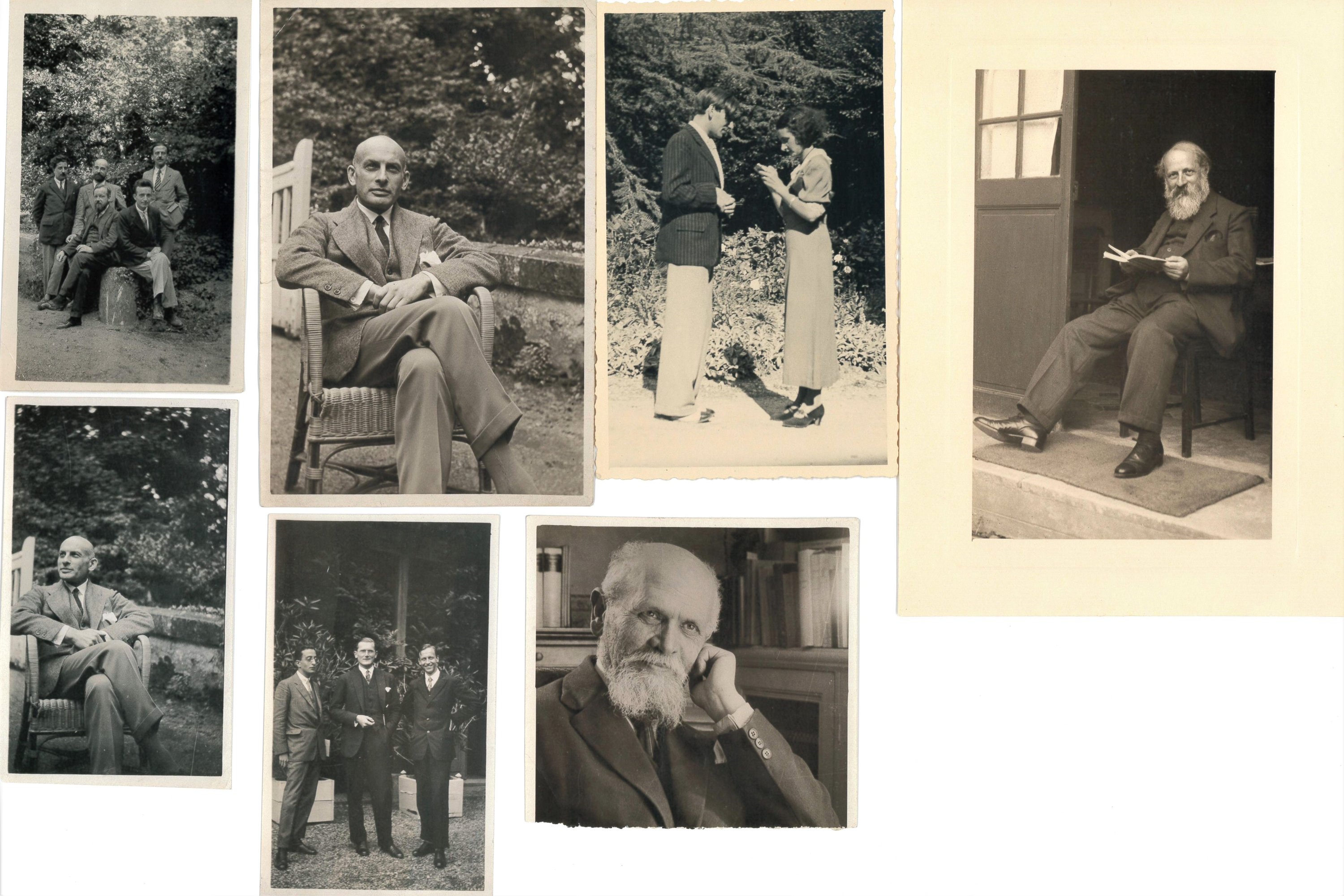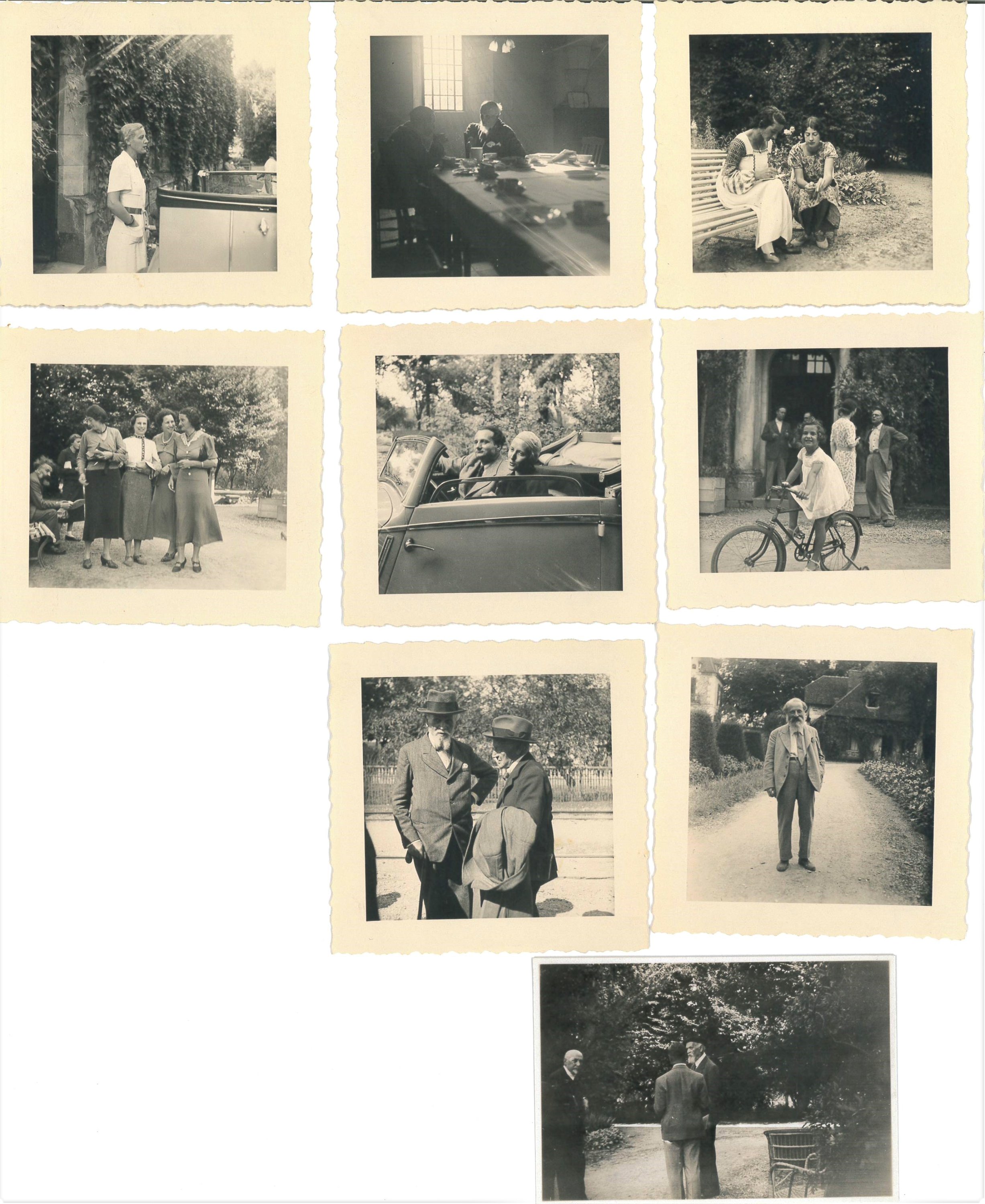 Rare réunion de 27 clichés photographiques, formats divers, pris aux cours des colloques philosophiques et littéraires, organisés à l'initiative de Paul Desjardins, à l'abbaye cistercienne de Pontigny en Bourgogne, auxquels participent depuis les années 1920 Elmina Régert épouse Auger. Prises de vues des nombreux participants tels que Paul Desjardins, Vladimir Jankélévitch, d'Alberto Moravia, Anne Heurgon fille de Paul Desjardins, Martin Buber, Rolph Nordling, Wilhelm Haas, Léon Brunschvicg, Jean Wahl, Gaston Bachelard, etc.