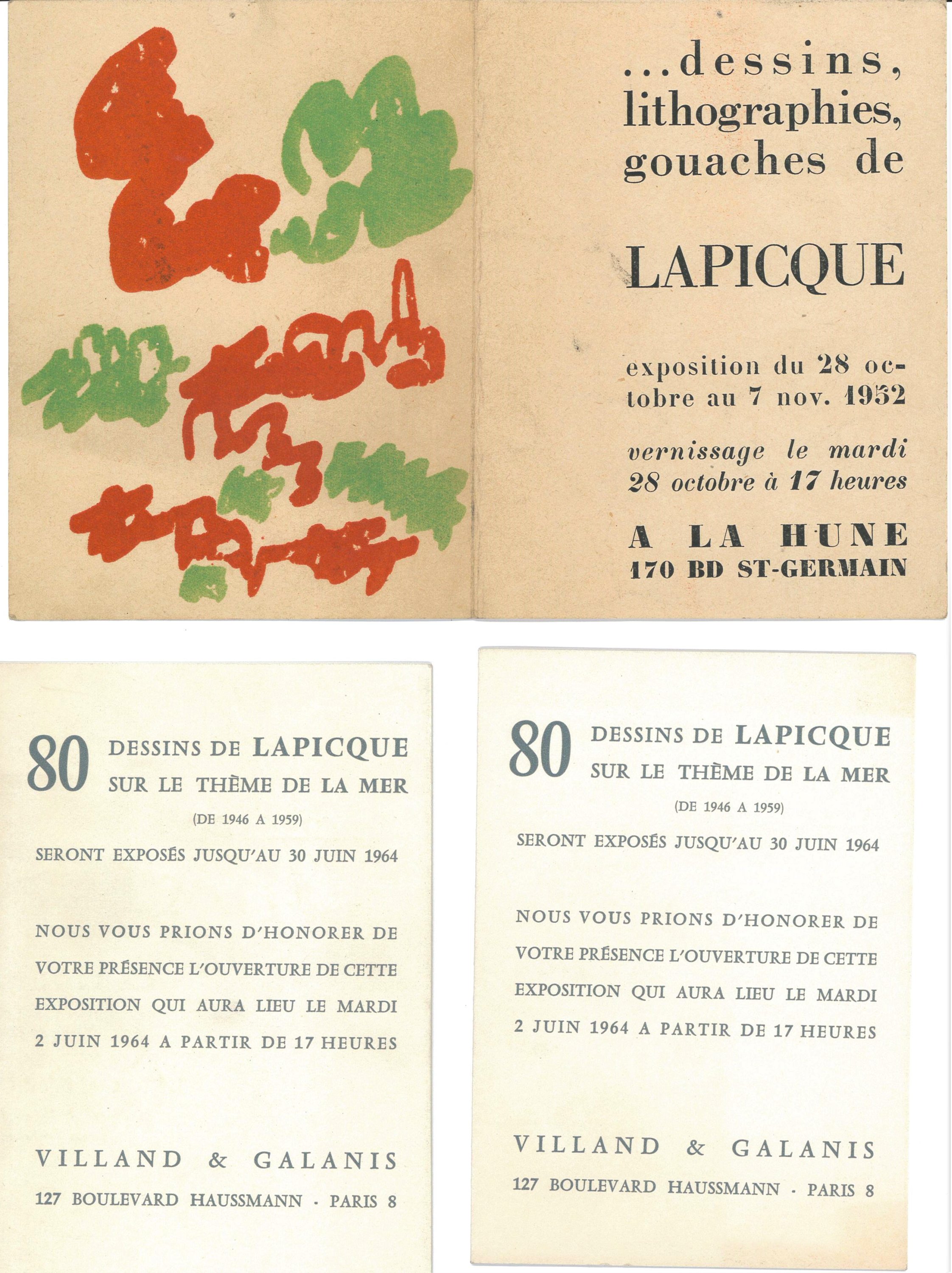 - Catalogues ou plaquettes d'expositions : Vestart à New York, avec envoi autographe de Lapicque ; Kunsthalle Bern, 1962 ; Kunstverein à Hambourg, 1964 ; Musée d'art national moderne, Paris, 1967, avec envoi autographe de Lapicque ; Musée de Brest, 1969 ; Galerie Verrière à Lyon, 1970 ; Centre Georges Pompidou, Paris, 1978 ; Galerie Messine, Paris, 1983 ; ASB Galerie, 1987.