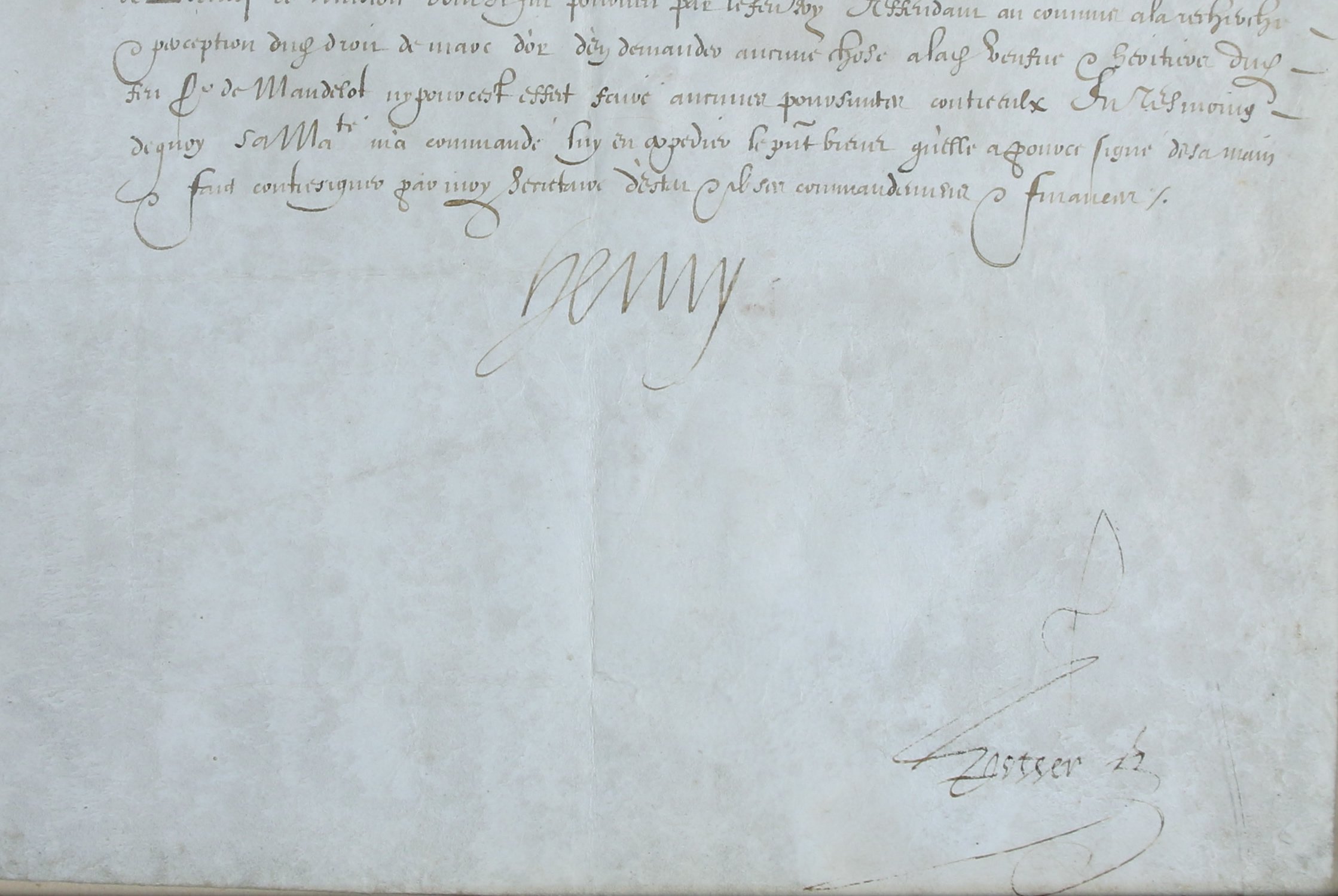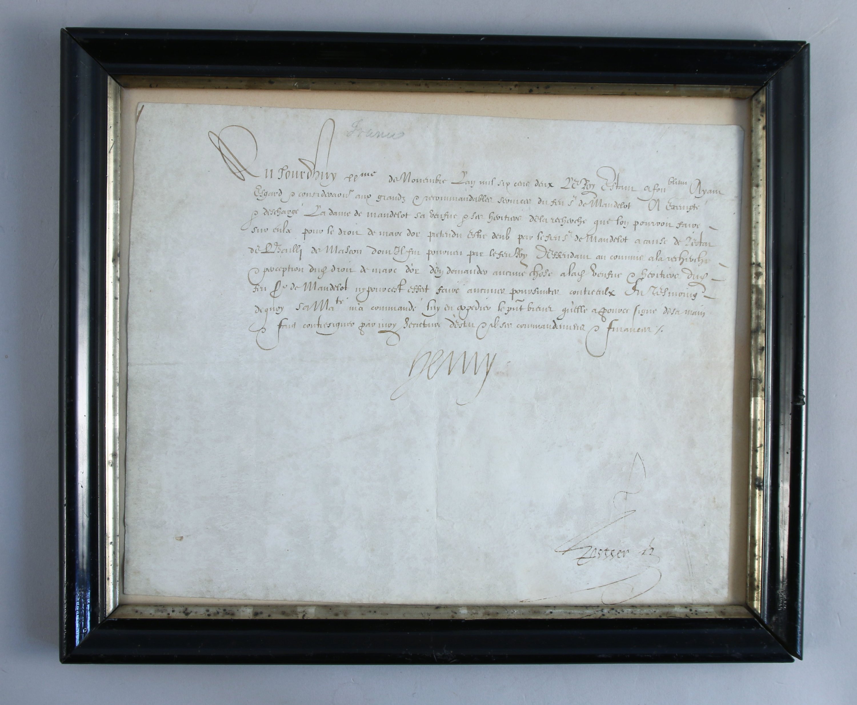 Brevet par lequel le roi de France exempte la veuve de François de Mandelot (1529-1588), gouverneur de Lyon (1571 à 1588) et bailli de Mâcon, du droit du marc d'or ou droit de serment, c'est-à-dire de payer la taxe lors de l'acquisition d'une charge vénale.