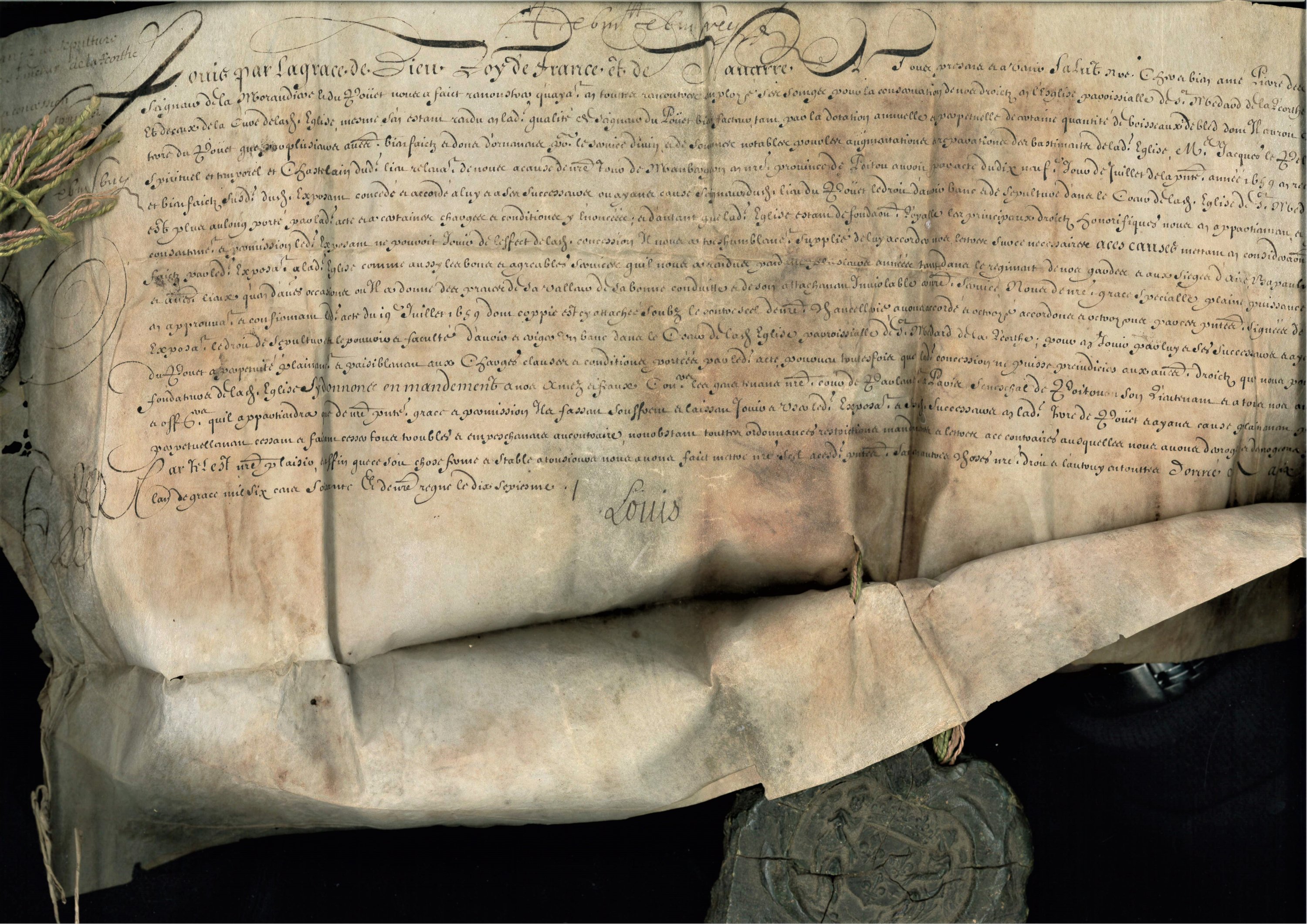 Lettres patentes du roi de France accordant à Pierre des Herbiers de l'Etenduère, sieur de la Morandière et du Pouët, d'avoir banc et droit de sépulture dans le chur de l'église paroissiale de Saint Médard à Saint Mars la Réorthe, de fondation royale, " en récompense des bons et agréables services qu'il nous a rendu pendant plusieurs années, tant dans le régiment de nos gardes et aux sièges d'Aire, Bapaume, Lens, L'Isle Lerel et autres lieux quand 'autres occasions il a donné des preuves de sa vaillance de sa bonne conduite et de son attachement inviolable à notre service "