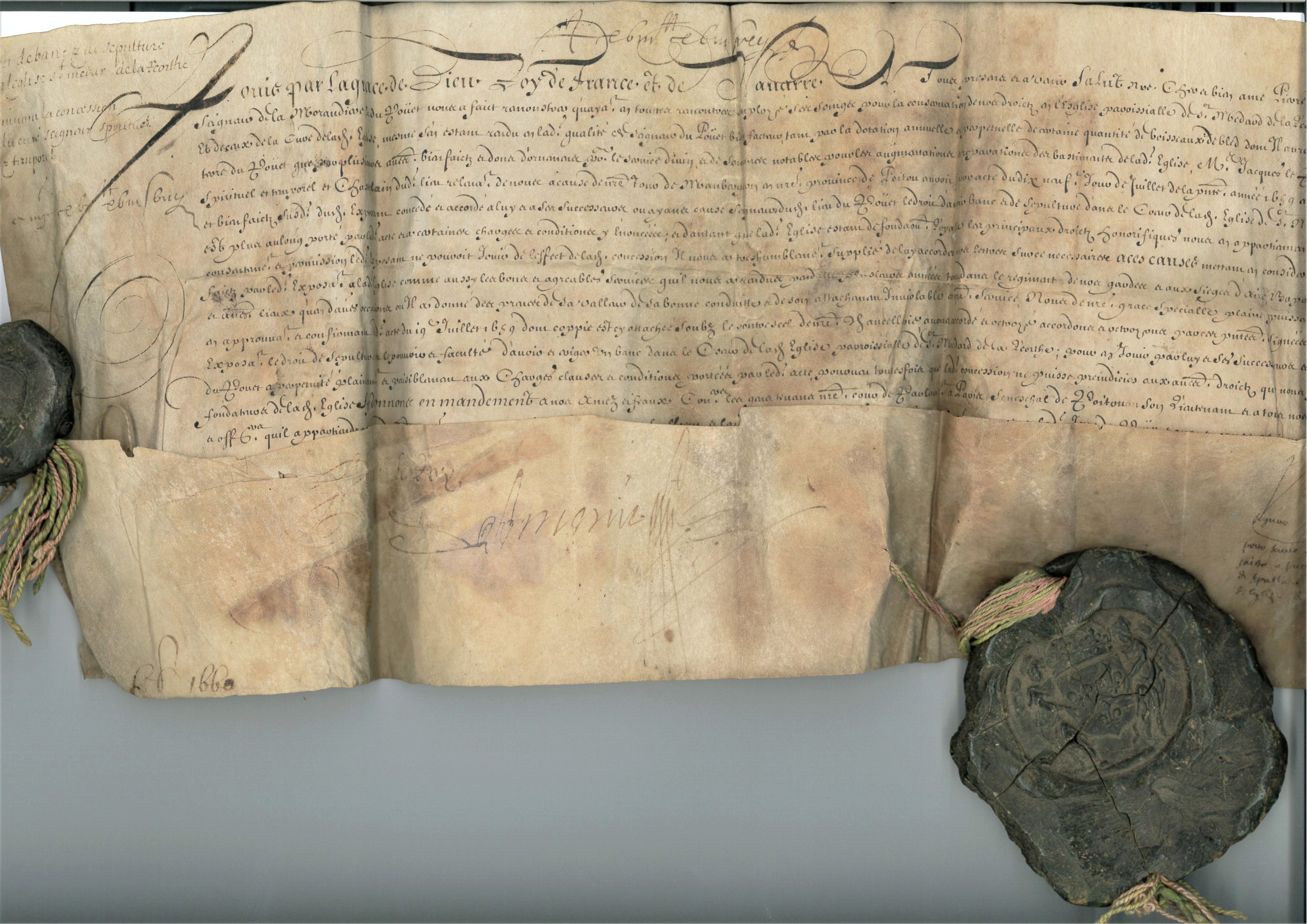 Pièce signée " Louis ", Aix, février 1660, contresignée par Henri-Auguste de Loménie, secrétaire d'état aux Affaires étrangères, vélin oblong, portant le grand sceau de Majesté de cire verte pendant par des lacs en soie rouge et verte, et contrescel aux armes de France, et le petit sceau aux armes de France de cire verte pendant par les lacs identiques et contrescel à l'empreinte de doigt.