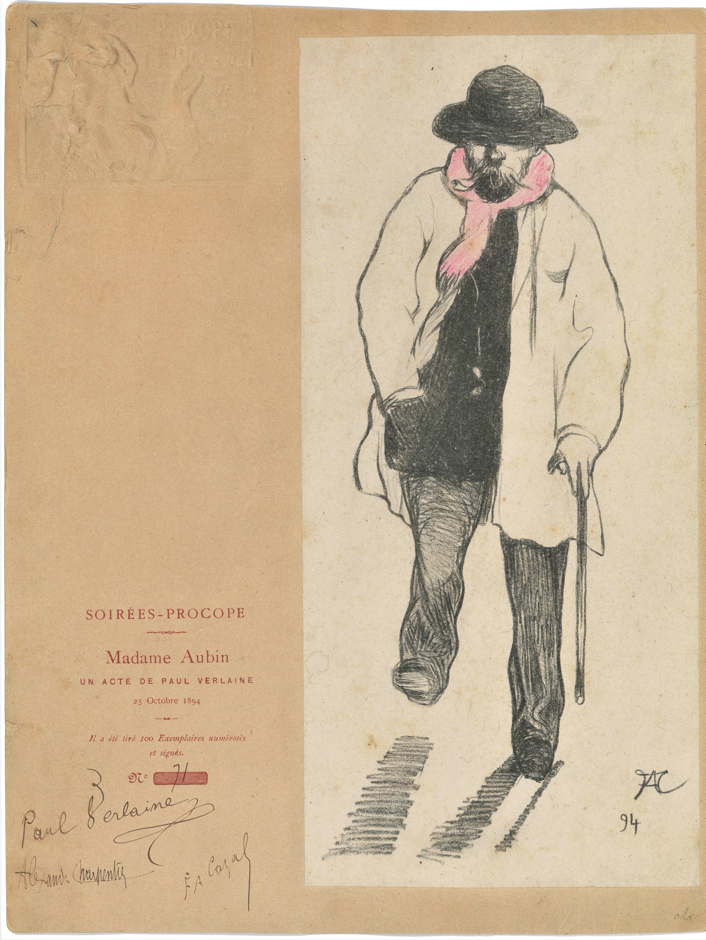 Rare programme cartonné au décor estampé en haut à gauche " Café Procope, Théo succ., rue de l'ancienne comédie ", réalisé par Alexandre Charpentier, et contrecollée sur une demie-page, une lithographie en couleurs tirée sur Chine, conçue par Frédéric-Auguste Cazals, représentant Paul Verlaine marchant avec canne, coiffé d'un chapeau noir et fumant la pipe.