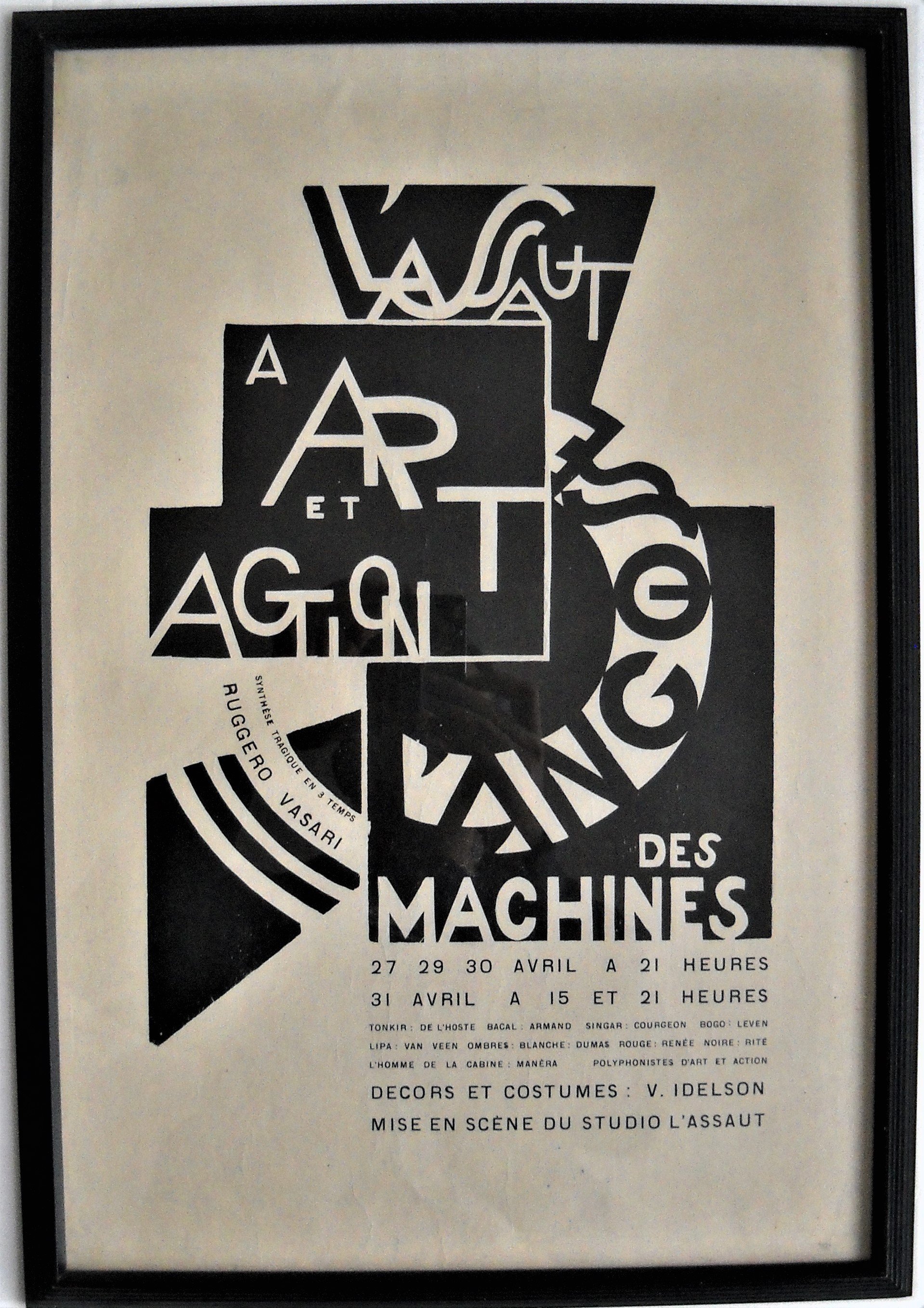 - affiche-programme de la pièce " L'assaut, l'angoisse des machines " de Ruggero Vasari, créée par le groupe L'Assault de M.L. Van Veen et interprétée dans la salle du grenier jaune, du 27 au 30 avril 1927, fond bruitiste par les Autant-Lara. Bois gravé par Vera IDELSON, 55 x 37 cm, sous cadre (58 x 40 cm).