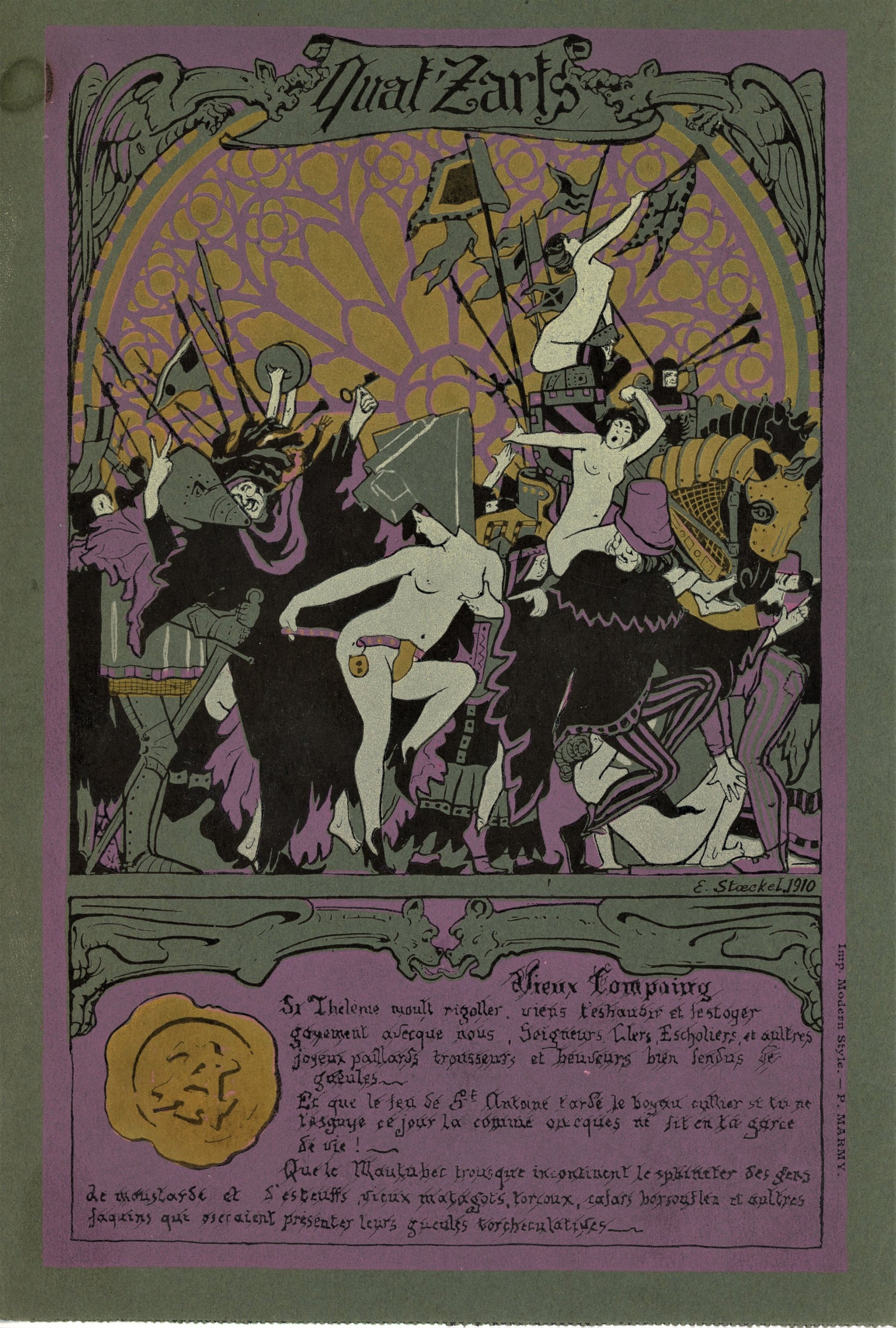 - " Le Moyen Age ", 6 juin 1910, Skating-Palace rue d'Amsterdam, carte d'entrée pour homme (sans le talon), illustrée par " E. Stoeckel ", 29 x 20 cm (petite tache) ;