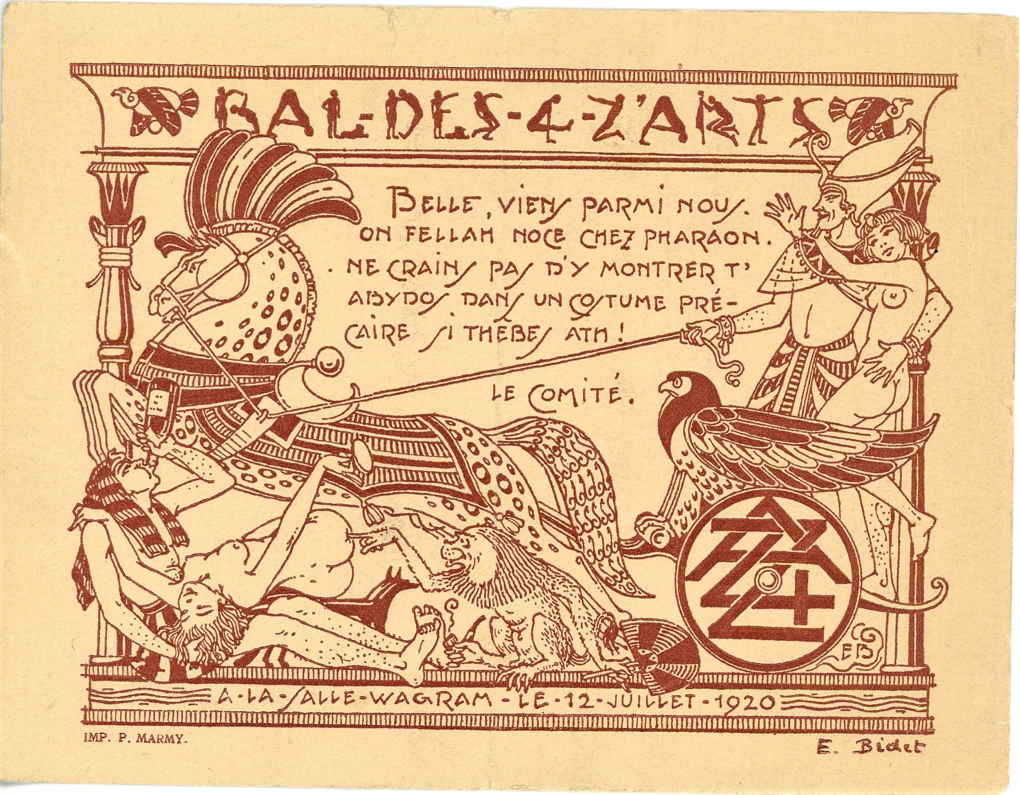 - " L'Egypte ", 12 juillet 1920, Salle Wagram, carte d'entrée pour femme, illustrée par Eugène Bidet, 13 x 17 cm (petits accdts, pliure) ;