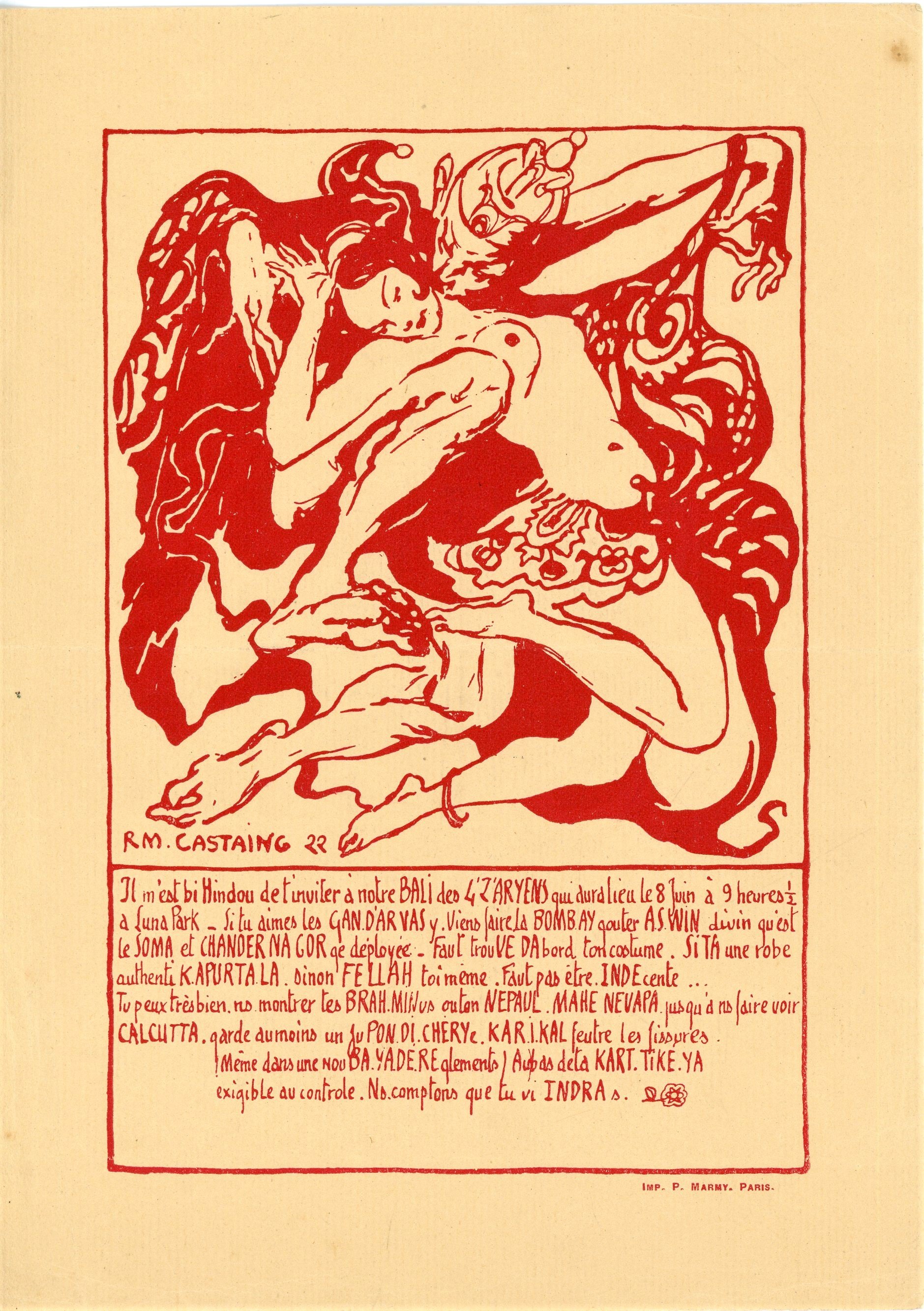 - " L'Inde Antique ", 8 juin 1922, Luna Park porte Maillot, carte d'entrée pour femme, illustrée par René-Marie Castaing, 22,5 x 16 cm (pliure) ;