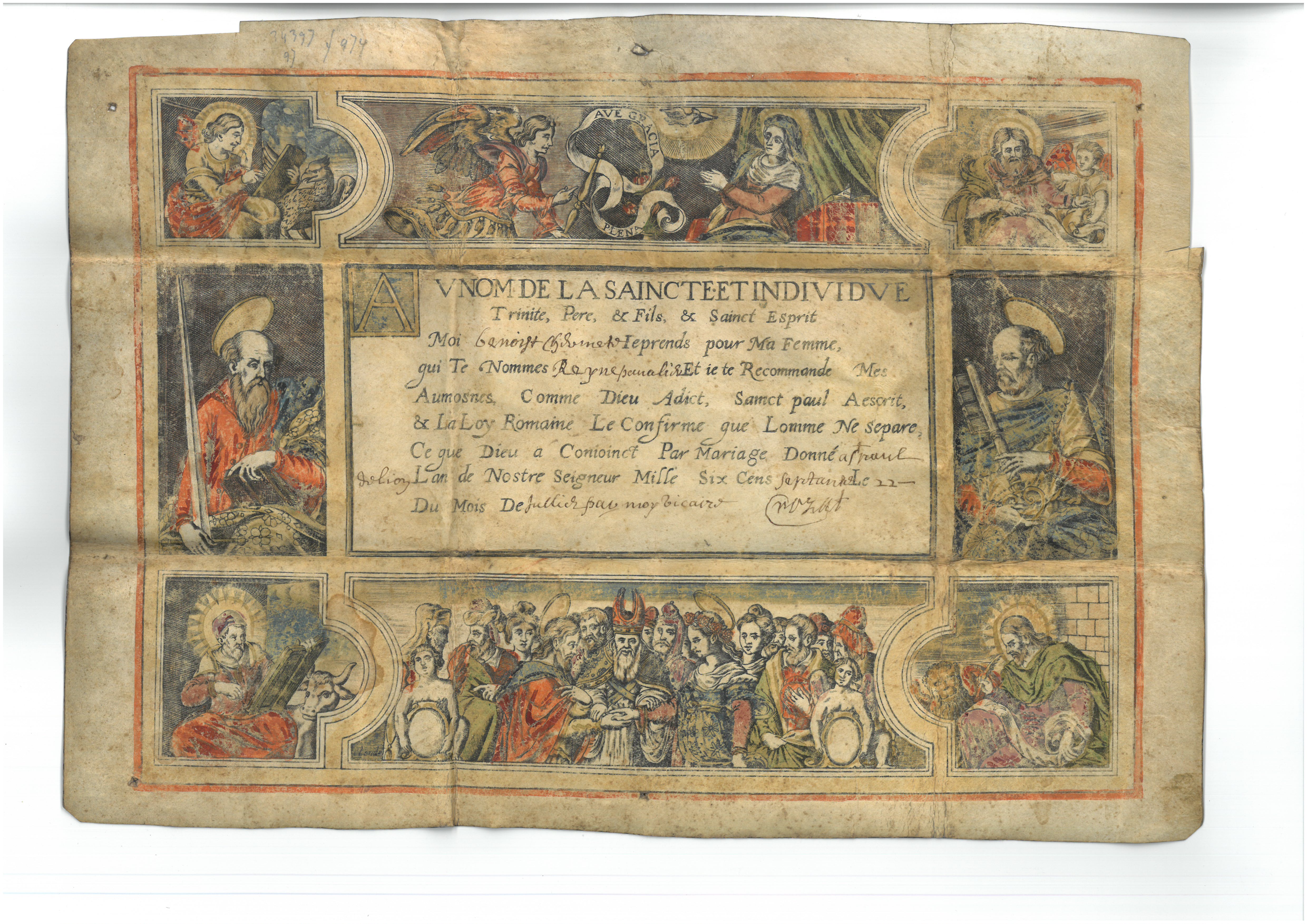 ACTE DE MARIAGE, impression sur parchemin gouachée datée du 22 juillet 1670. Le texte encadré de huit cartouches figurant les quatre Évangélistes, l'Annonciation, saint Paul et saint Pierre et le mariage de la Vierge.