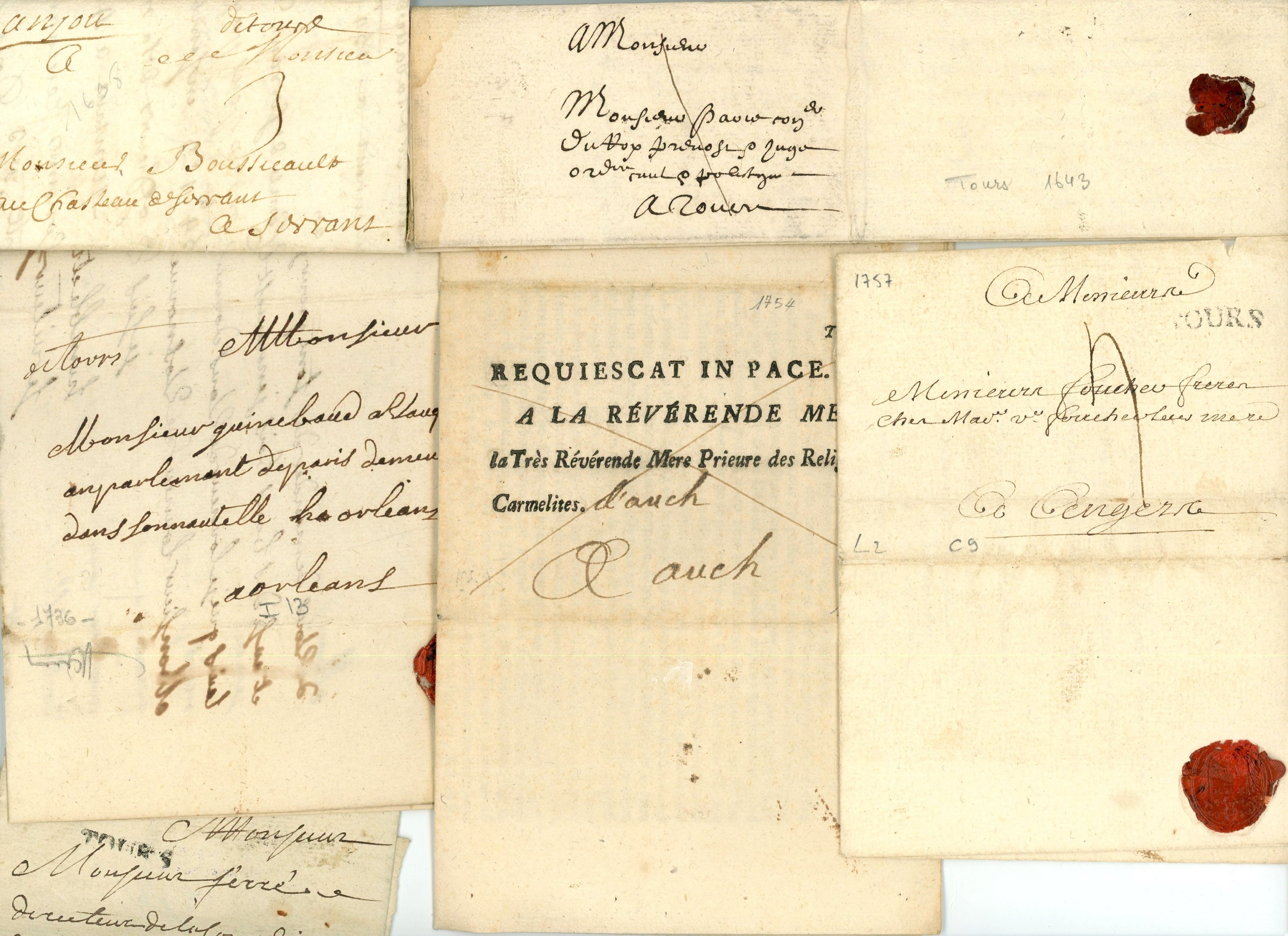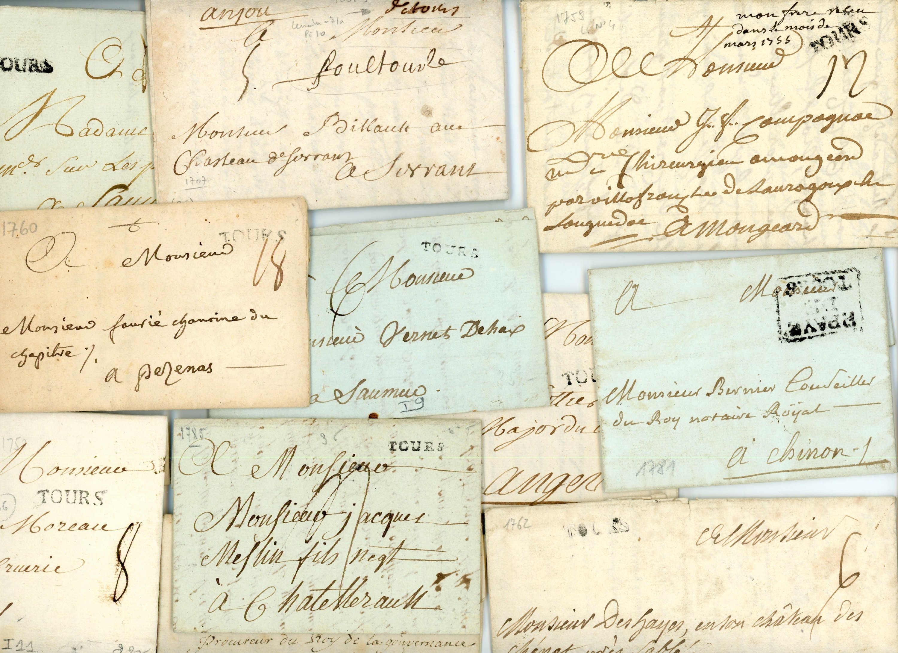 Réunion de 34 pièces, marques postales de la ville de Tours, fin du XVIIe et XVIIIe siècles, dont missive de janvier 1643 postée de Tours à Tours et taxée à 1 sol (ancienne collection musée de la Poste à Amboise).