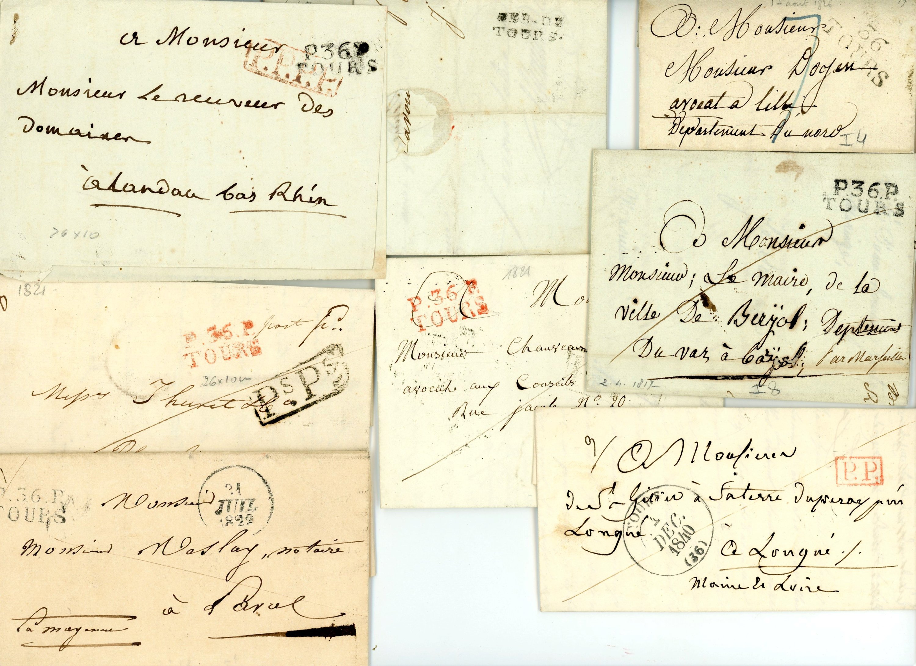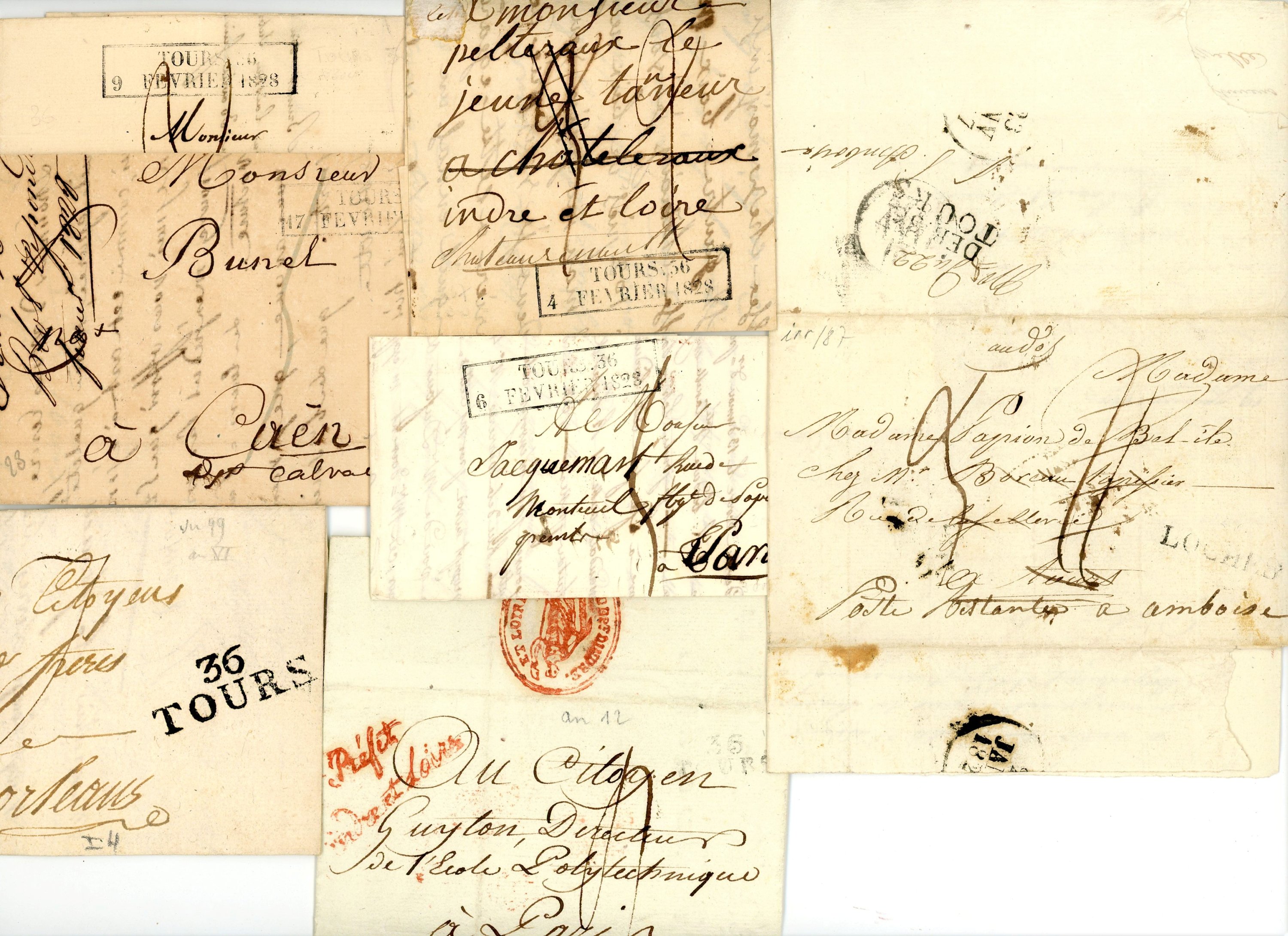 Réunion de + de 100 missives, marques et cachets postaux de la ville de Tours, fin du XVIIIe et 1ère moitié du XIXe siècle, dont déboursés et cachets provisoires dits d'essai de février 1828.