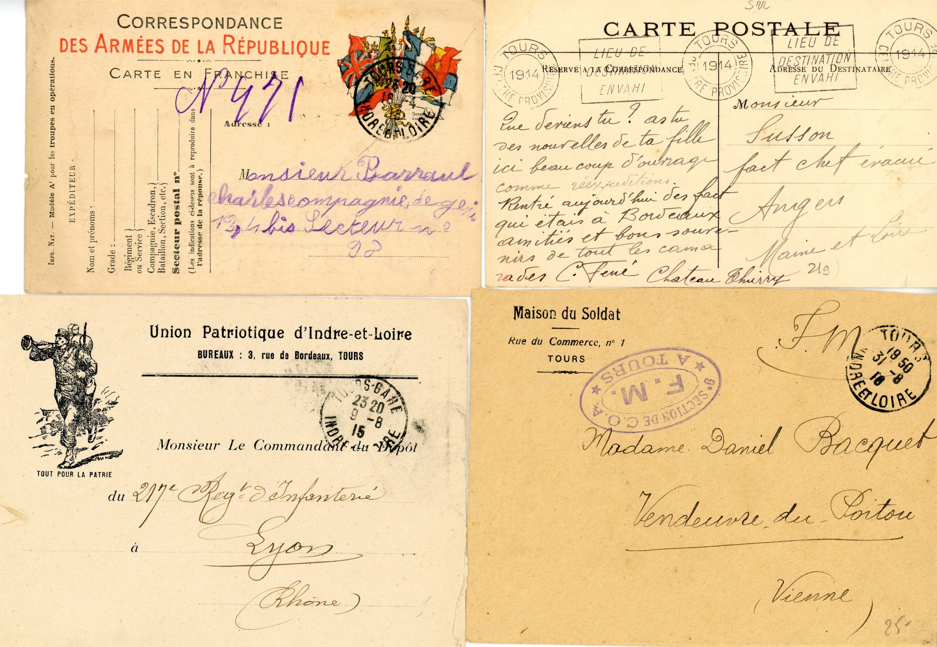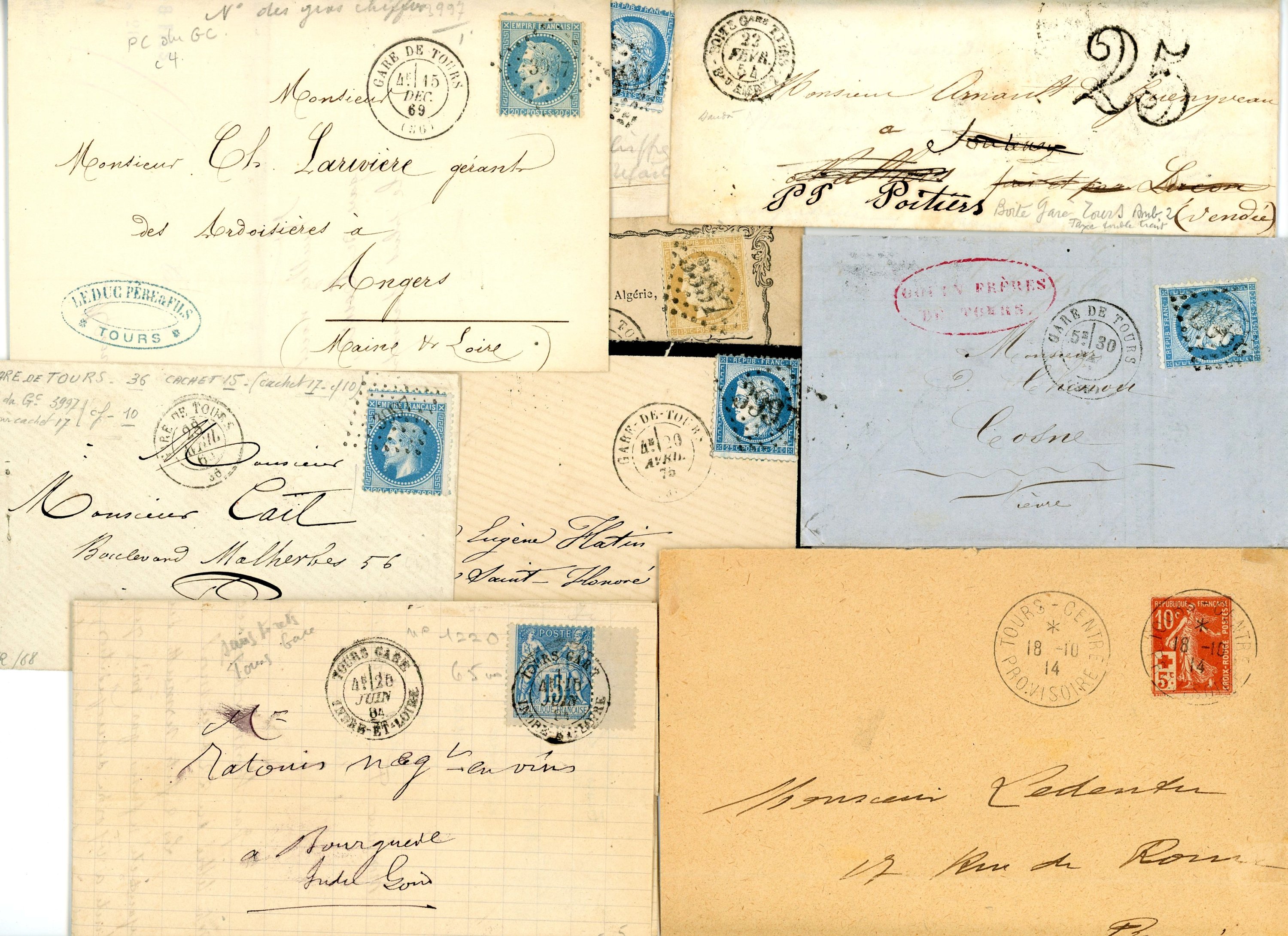 Lot de + de 60 pièces, cachets à date et bureau ambulant de la gare de Tours, franchises militaires, cachets du centre provisoire 1914, cachets de la grande semaine de Tours. Joint 2 cartes postales.