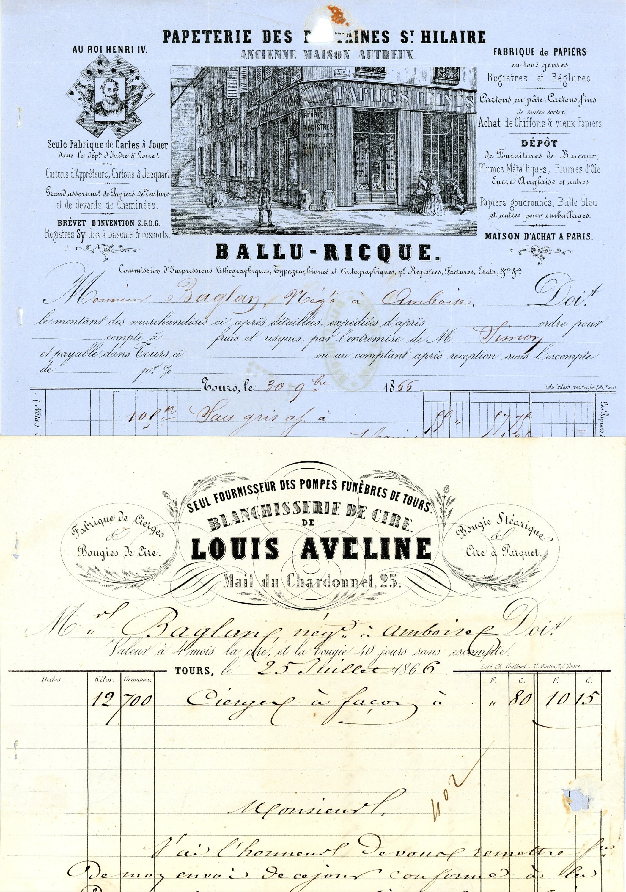 Lot de + de 40 pièces, en majorité écrites de la ville de Tours, fin du XVIIIe et XIXe siècles. Dont lettres à entêtes et vignettes - Correspondance de commissionnaires en vins de Vouvray dont L.A.S. de Prudent-Jean BRUSLEY (1759-1847), ancien maire de Tours et député : " 30 mai 1841, à l'exposition brillante qui vient d'avoir lieu à Tours de nos produits industriels et de ceux des départements limitrophes, il a été présenté par M. Benoît mécanicien un petit modèle d'un pressoir à engrainage de son invention. Suivant le prospectus qu'il a répandu, il paraît que ce pressoir a été adopté avec succès dans un certain nombre de départements et notamment par vous dans l'Ardèche. M. Benoît, instruit, je ne sais par qui, que je possède un grand vignoble et que je suis ami des arts, a pris la peine de venir à ma campagne pour me donner connaissance de son modèle. Le système de nos pressoirs en bois est si grossier, si inintelligent et d'un entretien dispendieux que je me déciderais de suite en faveur du nouveau système si j'avais la certitude que lui-même ne comporte pas des inconvénients plus graves