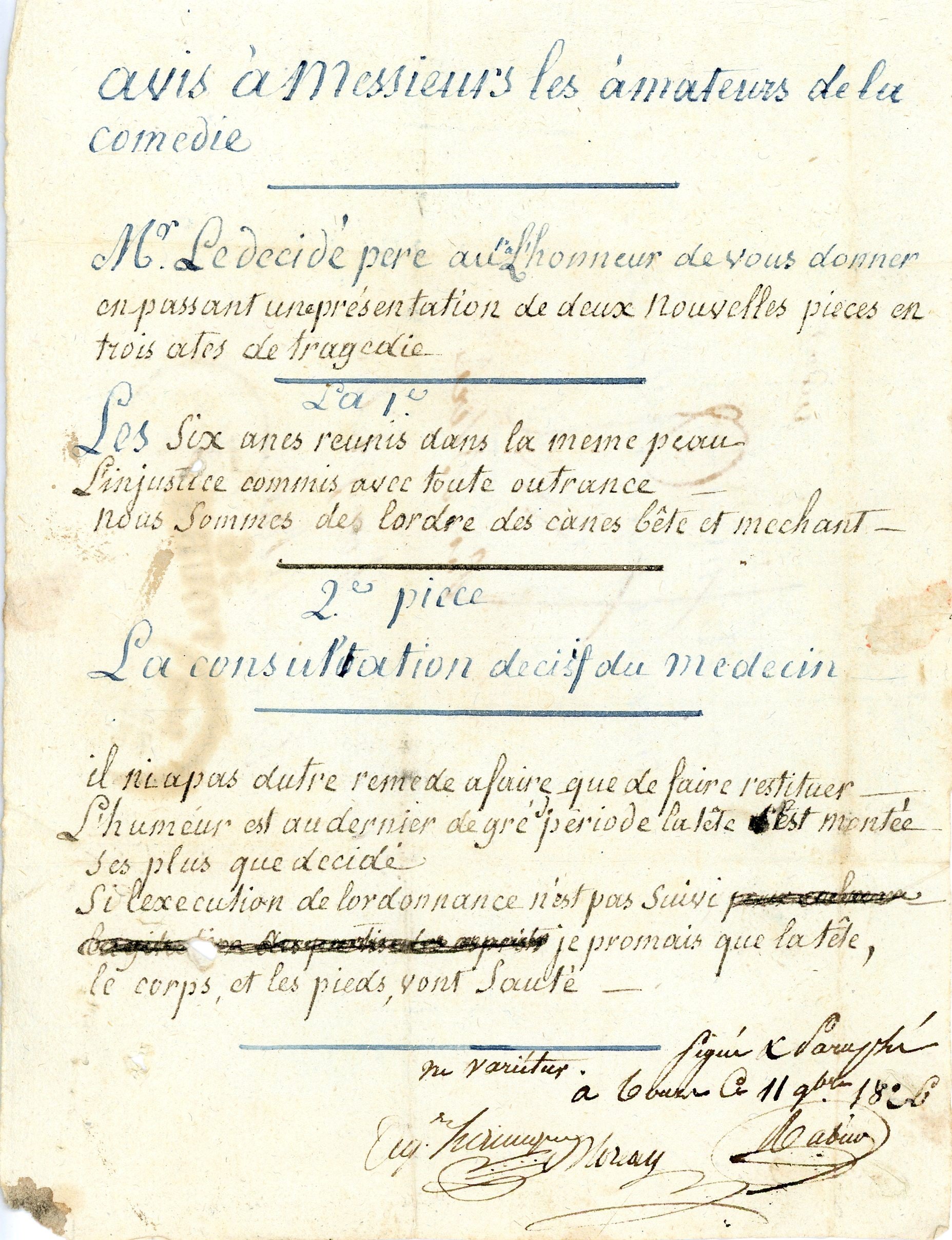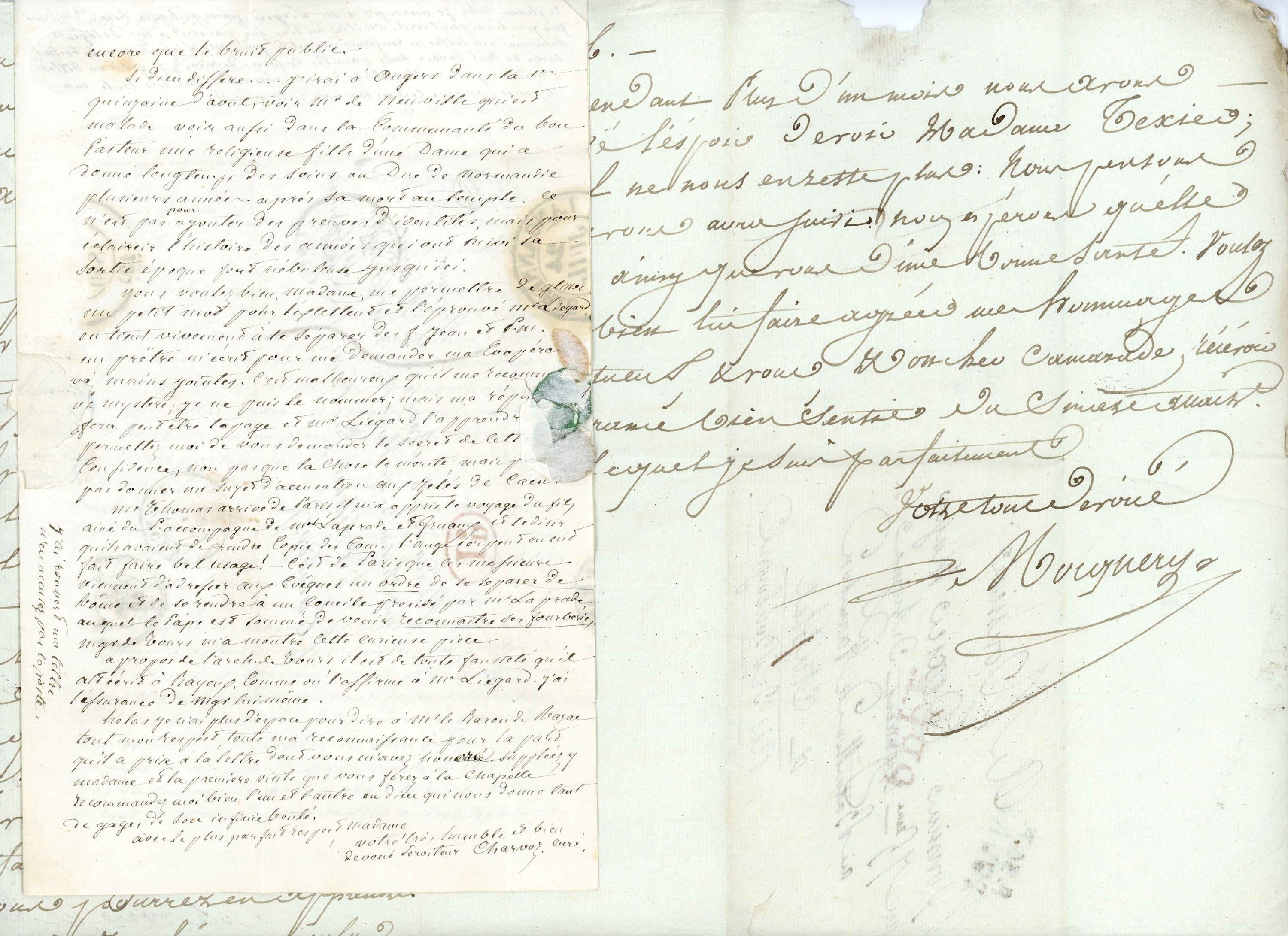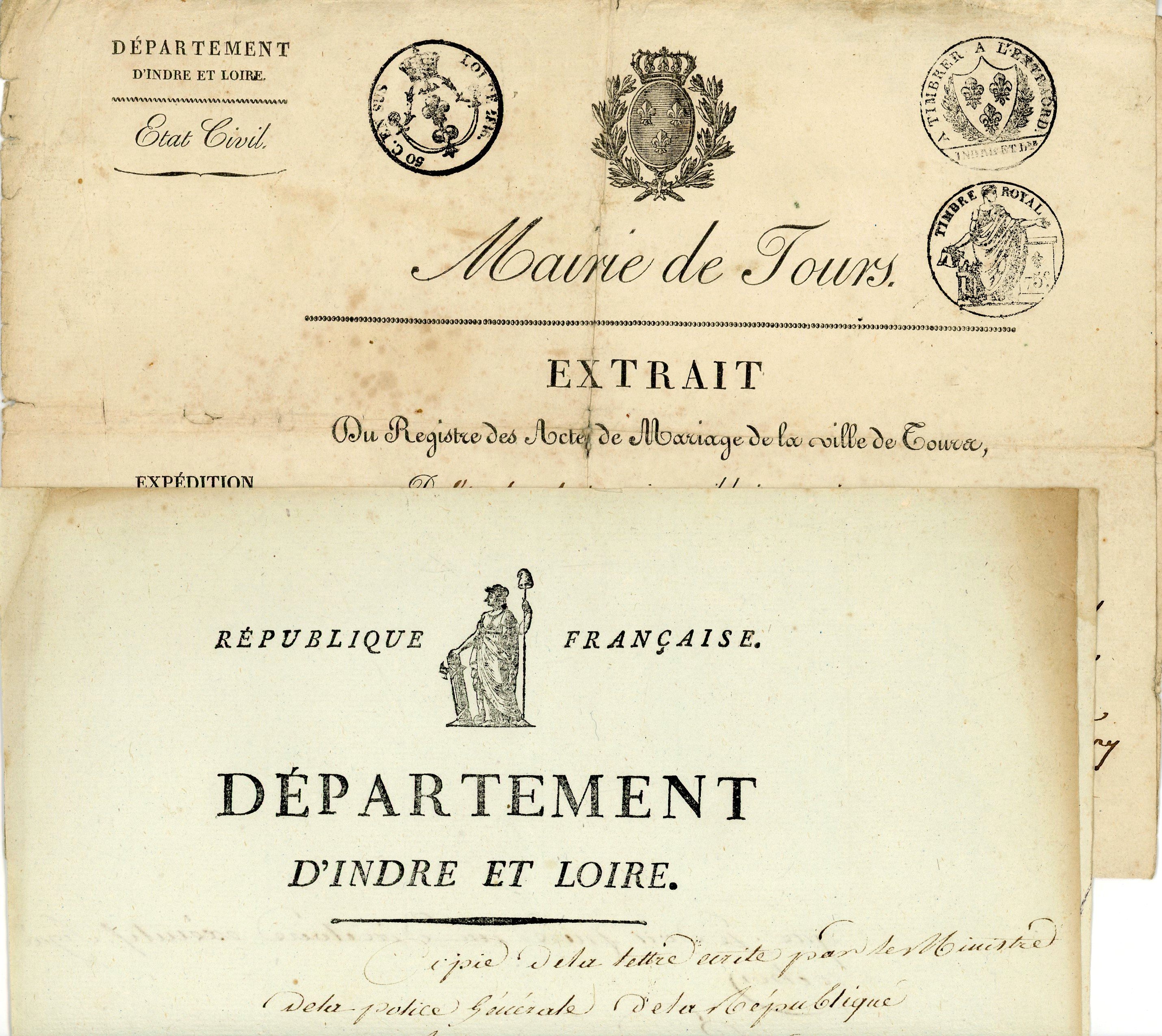 " - L.A.S., 4 mai 1807, Georges Alexis MOCQUERY (1772-1847), général de l'Empire - Correspondance d'Anglais vivant à Tours, 1826-1827 - L.A.S., 29 avril 1837, André JEUFFRAIN, numismate - 2 L.A.S. Dominique DUFÊTRE vicaire général à Tours de 1824 à 1842 - 2 L.A.S., 1840, Alexandre CHARVOZ dit La Paraz (1797-1853), prêtre curé de Montlouis, obligé de démissionner en 1843 en raison de ses publications prophétiques et illuminations délirantes, rejoignit en septembre 1843 à Londres Naundorf le prétendant " Louis XVII " pour le convertir ; relate des miracles et prophéties qui se sont déroulé dans la campagne tourangelle - Commission d'appointements au service des fourrages avec une superbe vignette " Equipages militaires " - Lettre imprimée de l'an II du général Descloseaux - Menu servi lors de l'inauguration de la statue Jeanne d'Arc à Chinon, 13 août 1893 - etc.