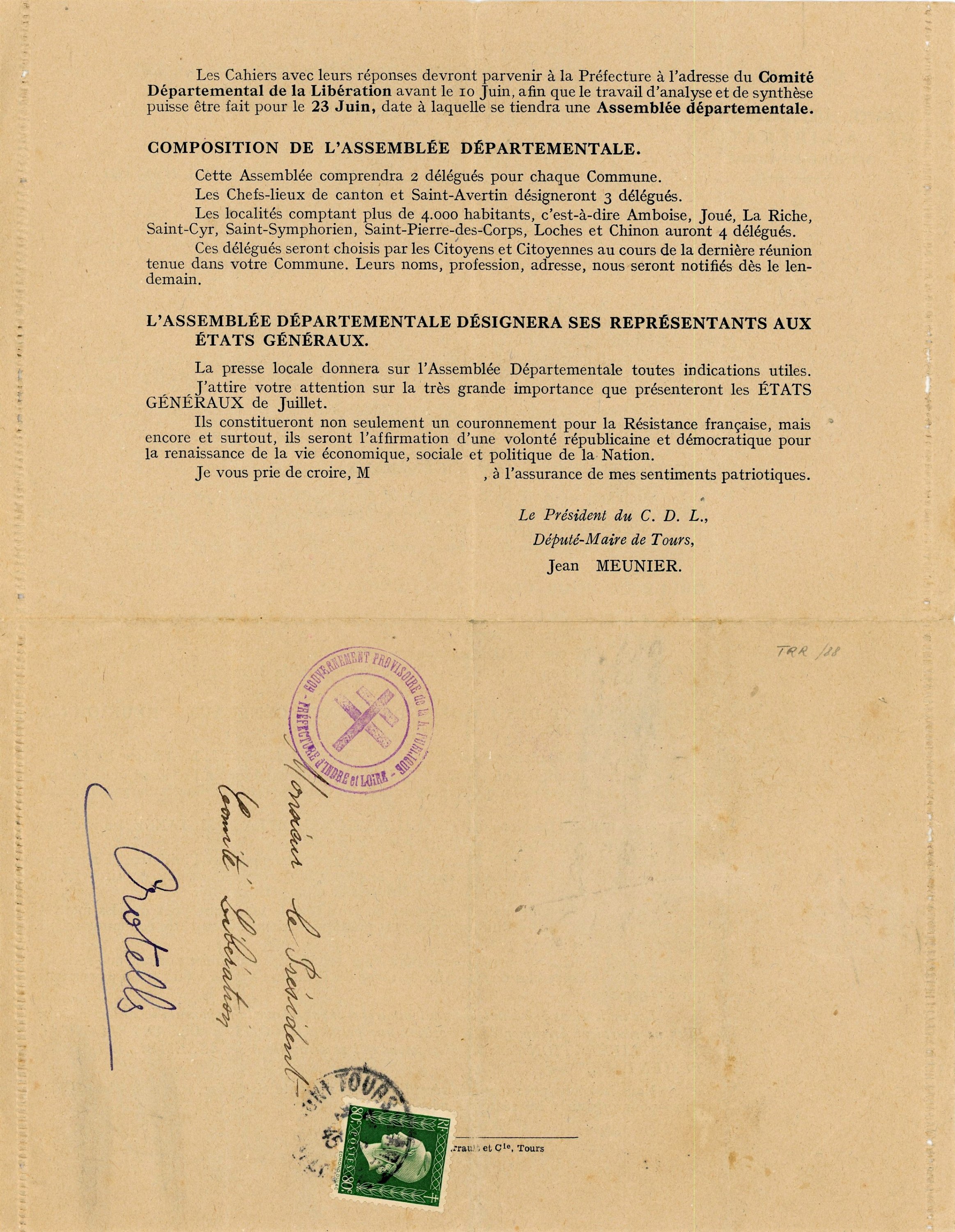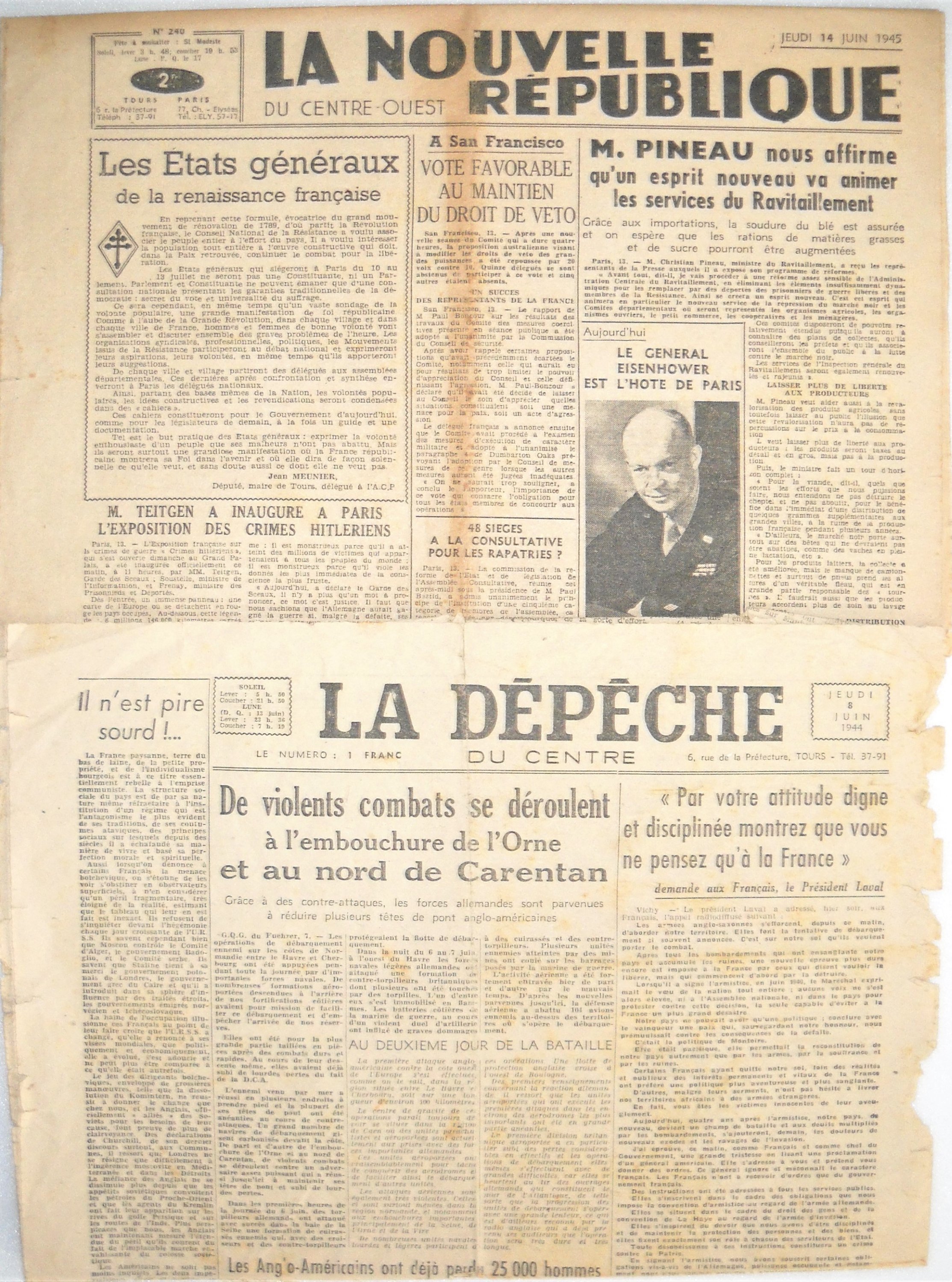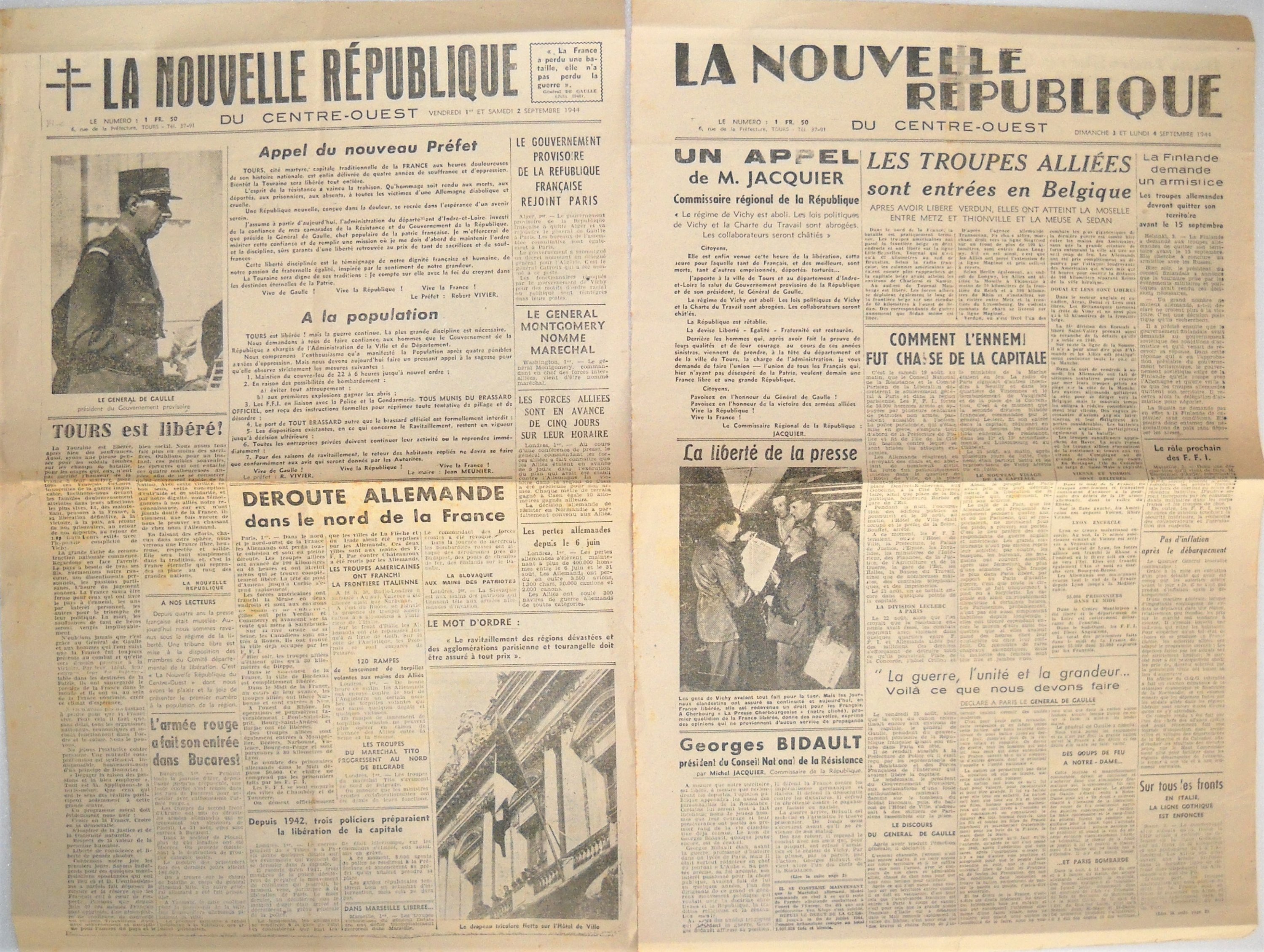 3 numéros de la Nouvelle-République du Centre-Ouest, dont les 2 premiers numéros édités au lendemain du jour de la libération de Tours, le 1er septembre 1944. Très rare. [Quotidien issu de la Résistance et fondé sous la forme d'une société anonyme à participation ouvrière, créé par Pierre Archambault, Jean Meunier, Emile Brèche, Marcel Mallet et Paul Racault, le premier numéro est édité à 33 725 exemplaires.] - Exemplaire du 8 juin 1944 du journal " La Dépêche du Centre ". - Communiqué du comité départemental de la libération d'Indre-et-Loire par Jean Meunier, député maire de Tours, 24 mai 1945.