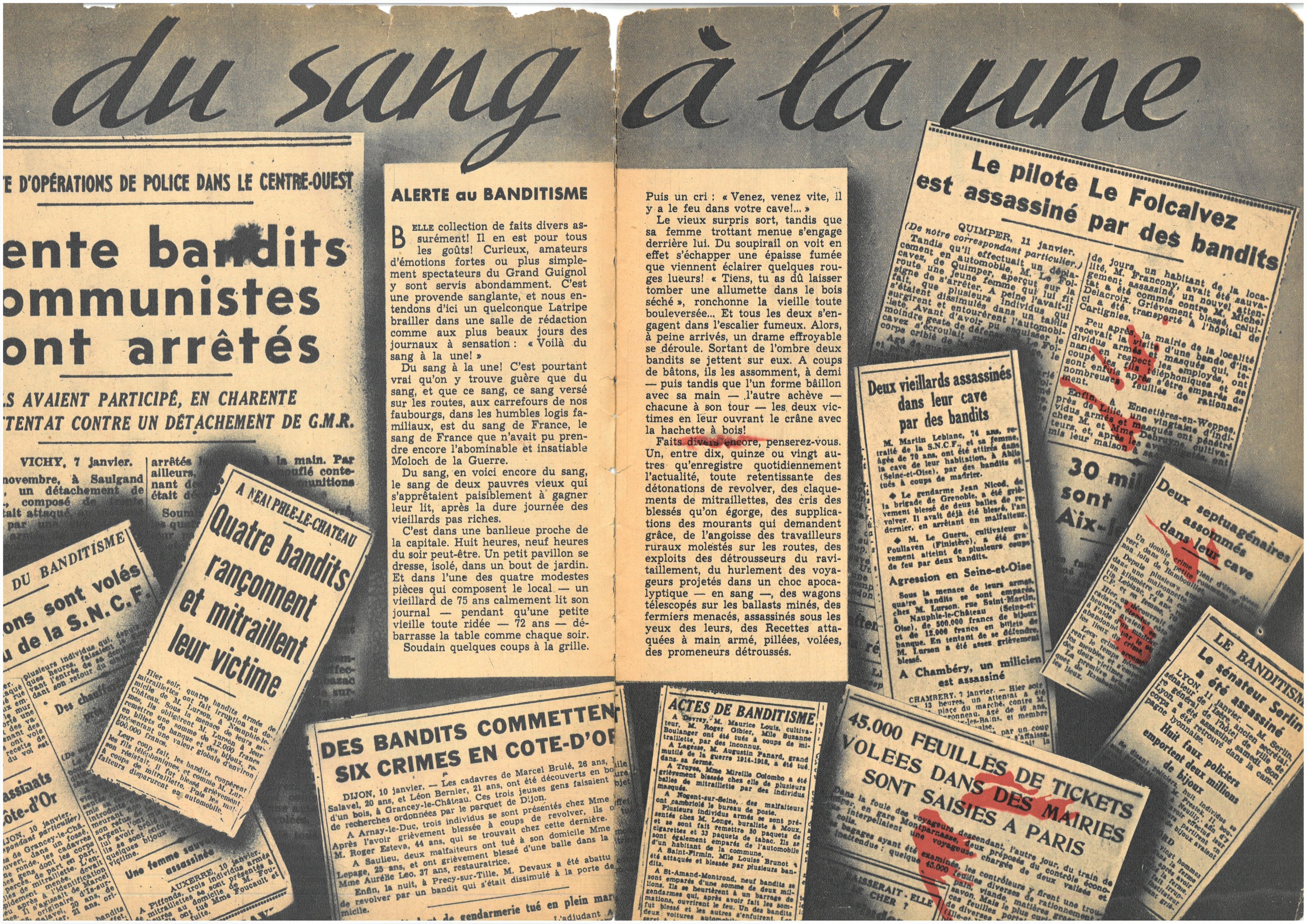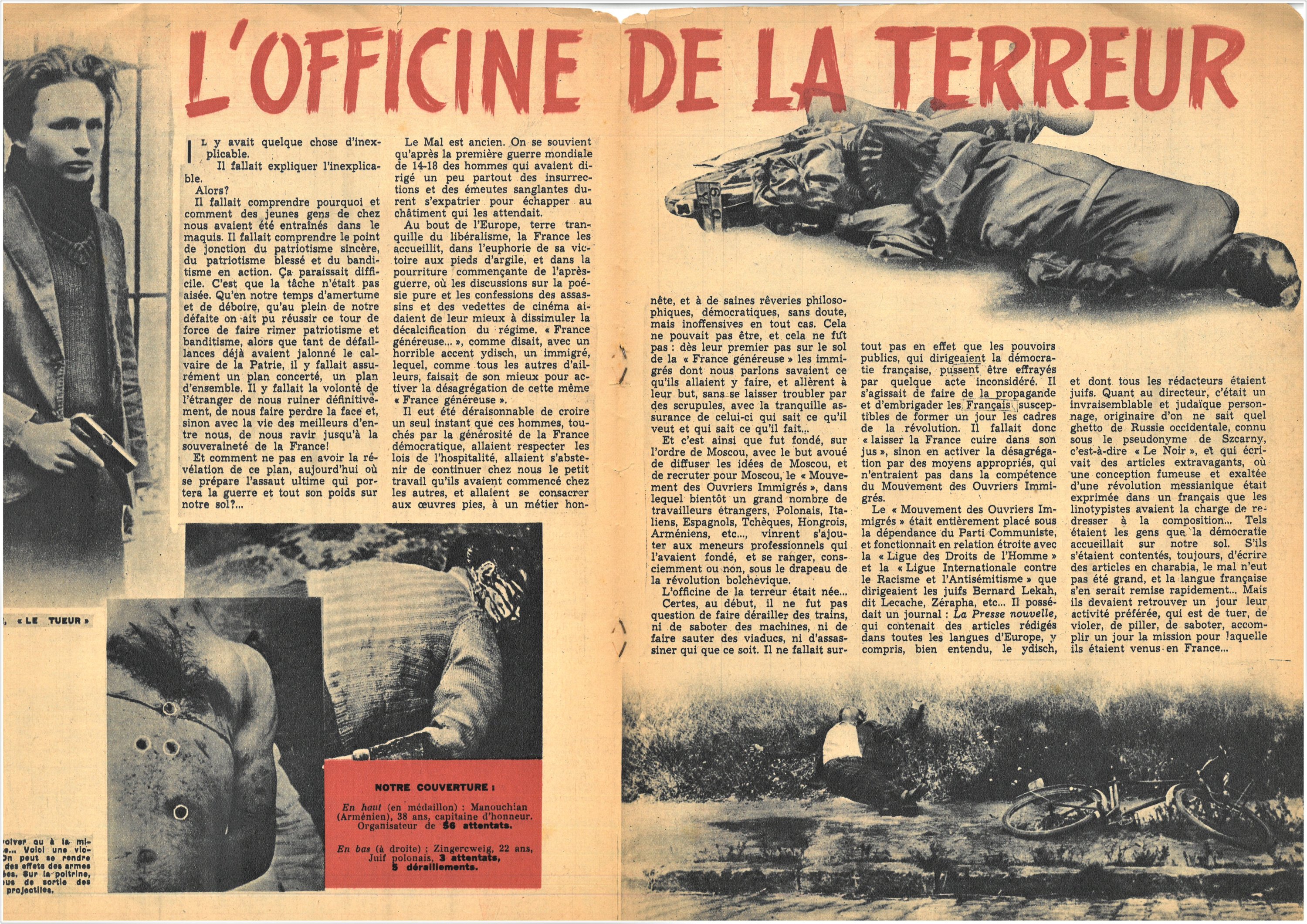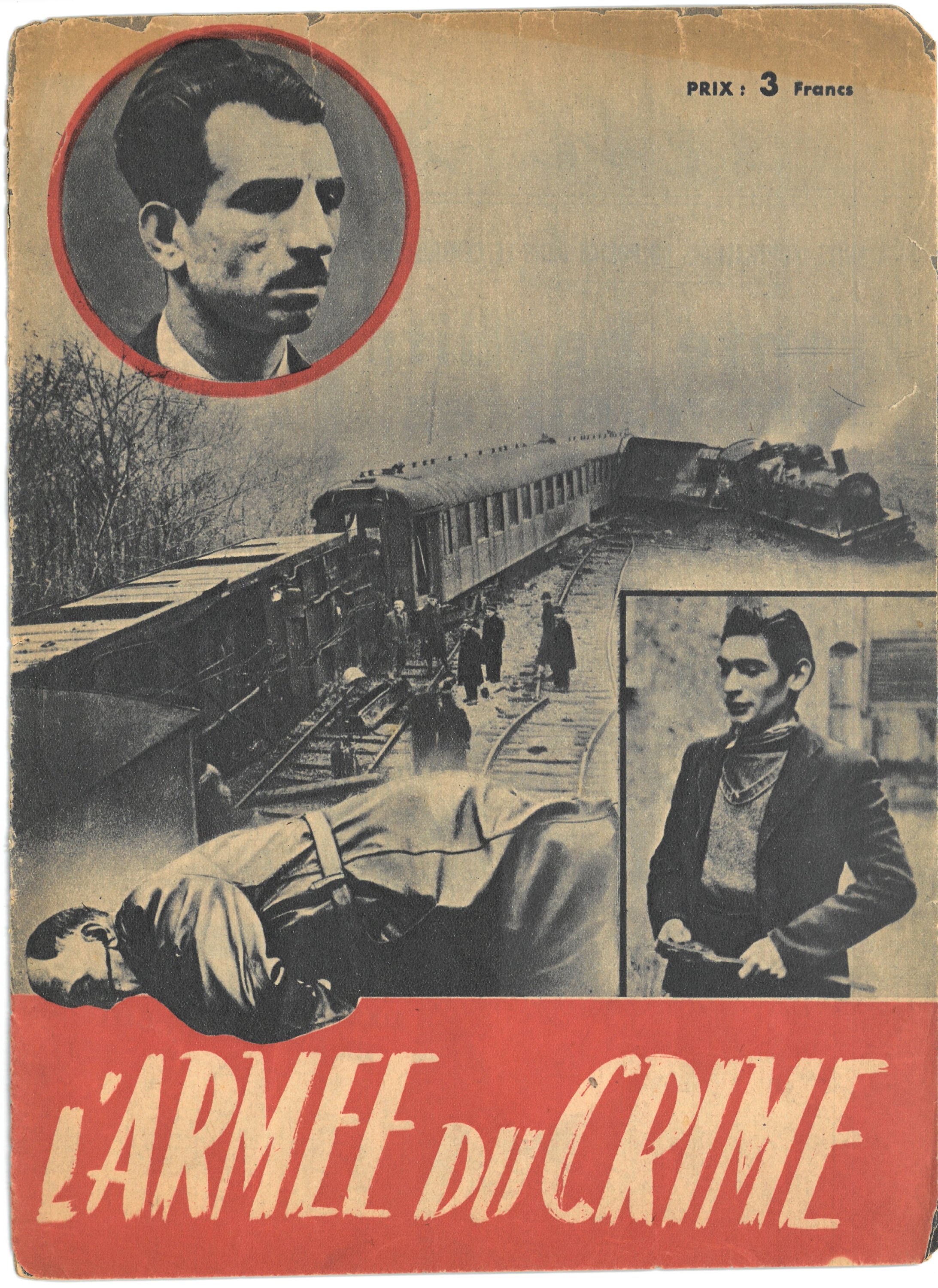 Rare brochure, 16 pages in-4 (petits accdts), diffusée par les services de propagande de l'occupant allemand en janvier 1944. Elle participe au dispositif mis en oeuvre autour du procès des résistants Missak Manouchian et les membres de son réseau, dénoncés comme communistes, juifs ou étrangers, dont l'élément le plus connu est "L'Affiche rouge".