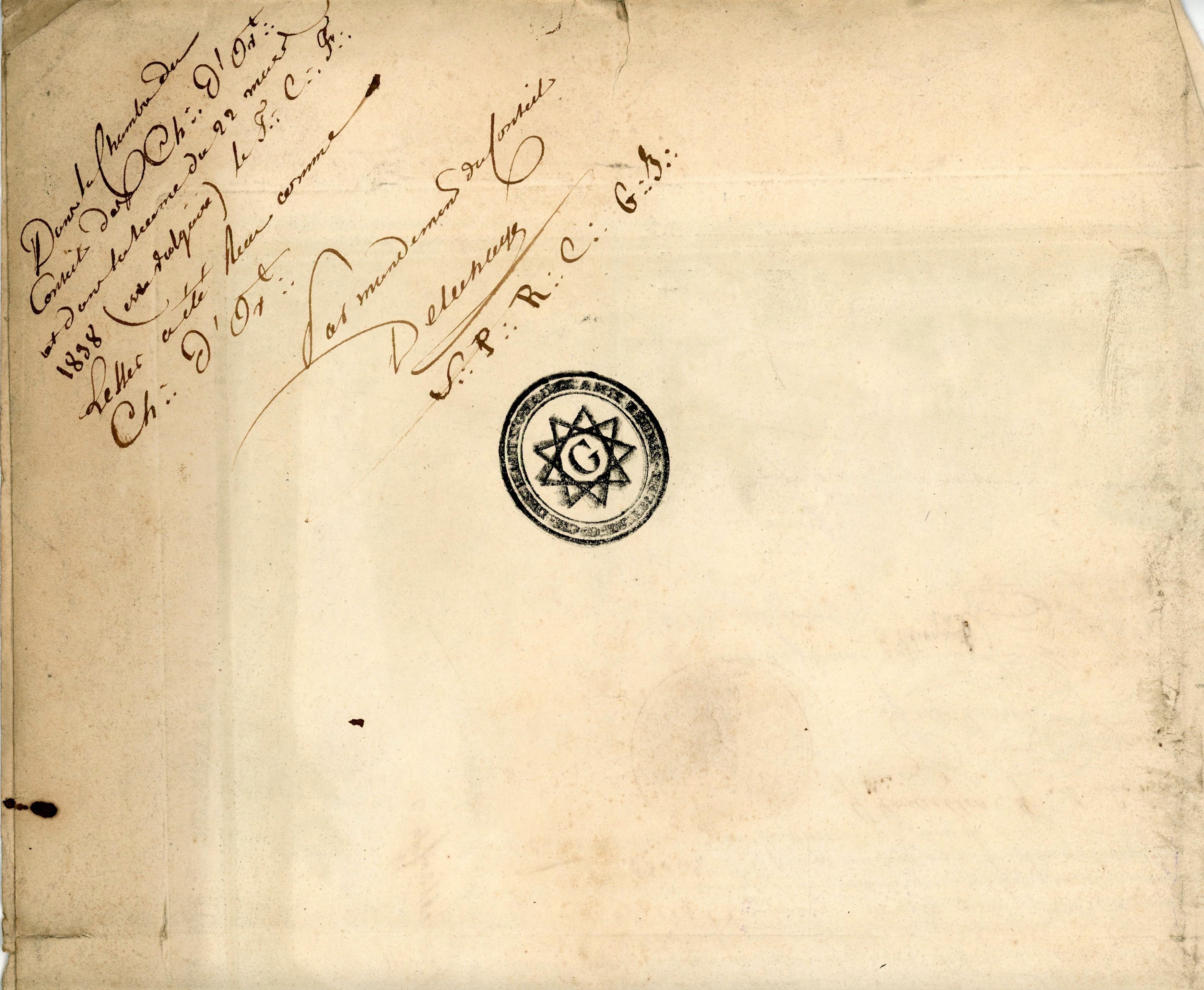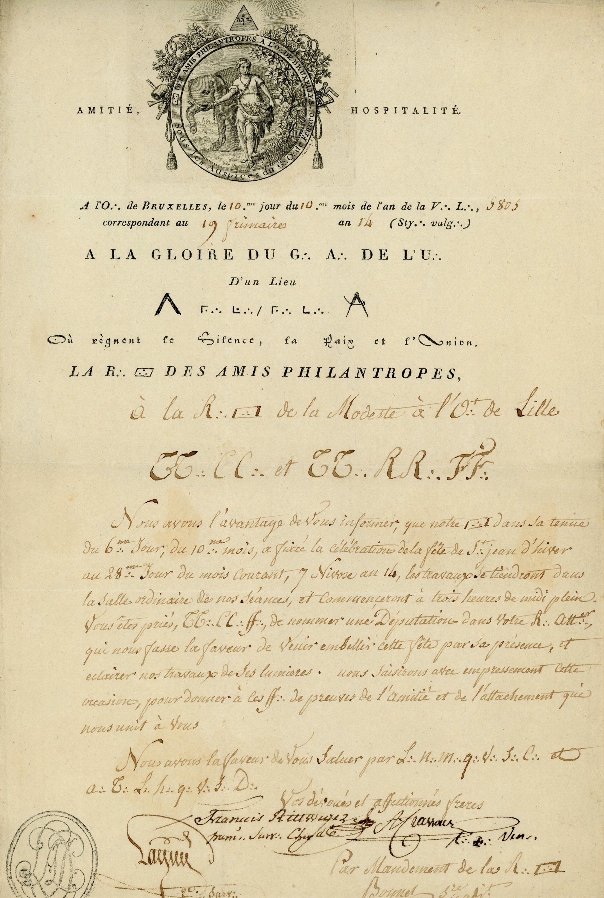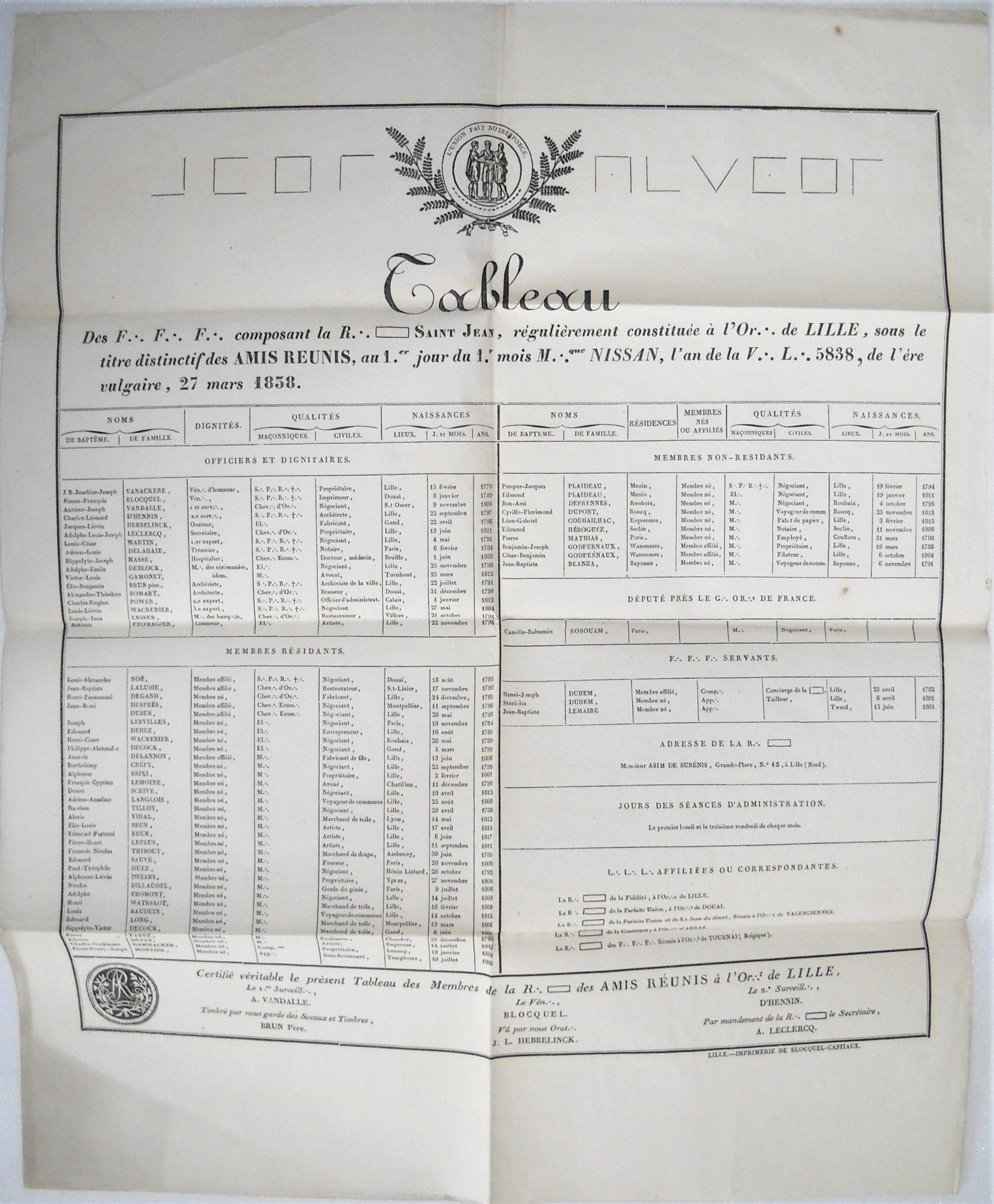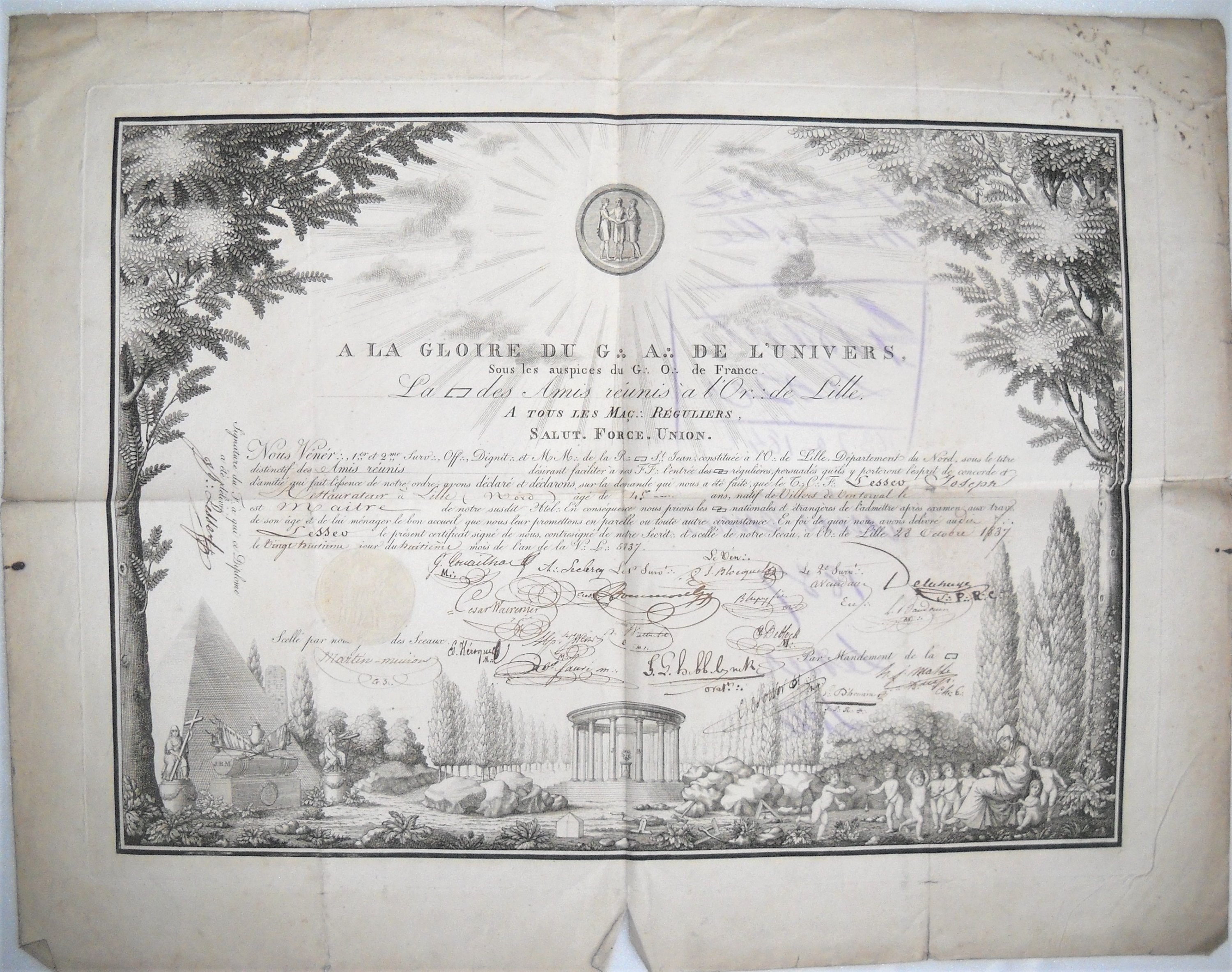 Lot de 4 pièces, 1ère moitié du XIXe siècle : Tableau des frères composant la loge Saint Jean constituée sous l'Orient de Lille sous le titre des Amis Réunis, 28 avril 1803, 67 x 55 cm - L.A.S., 19 frimaire an XIV (1805), des membres de la loge des Amis philanthropes de Bruxelles, adressée à la loge de la Modeste à Lille, 1 page in-4 avec belle vignette à l'éléphant en en-tête : " (…) a fixé la célébration de la fête de St Jean d'Hiver au 28e jour du mois courant, 7 nivose an 14, les travaux se tiendront dans la salle ordinaire de nos séances (…) Vous êtes priés de nommer une députation… " - Diplôme de maître, signé par des maîtres et officiers de la loge des Amis Réunis de Lille, 28 octobre 1837, 1 p. in-fol. en partie imprimée sur papier (accdts) - Tableau des frères composant la loge Saint Jean constituée sous l'Orient de Lille sous le titre des Amis Réunis, 27 mars 1838, imprimé par Blocquel-Castiaux à Lille, 53,5 x 44 cm.