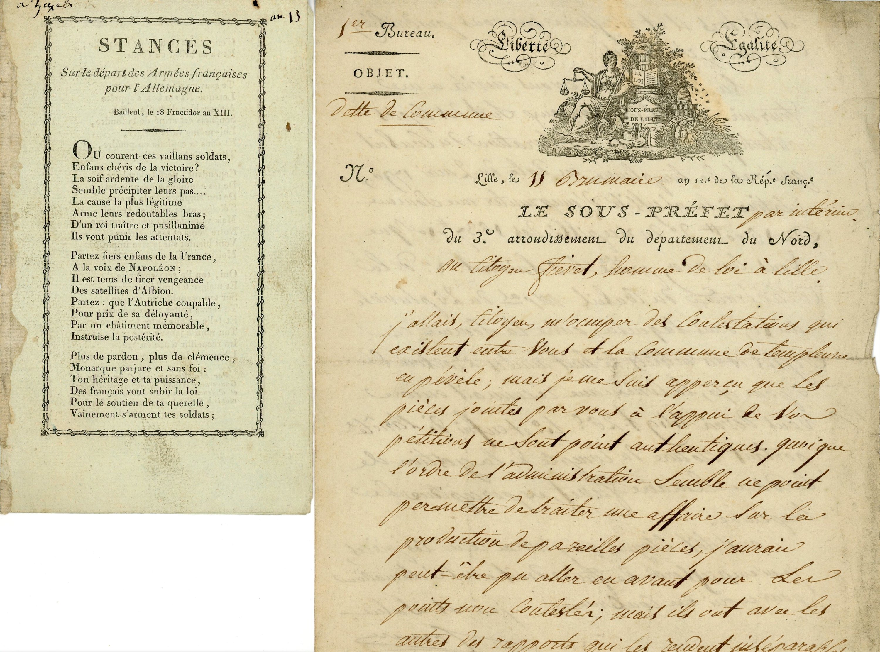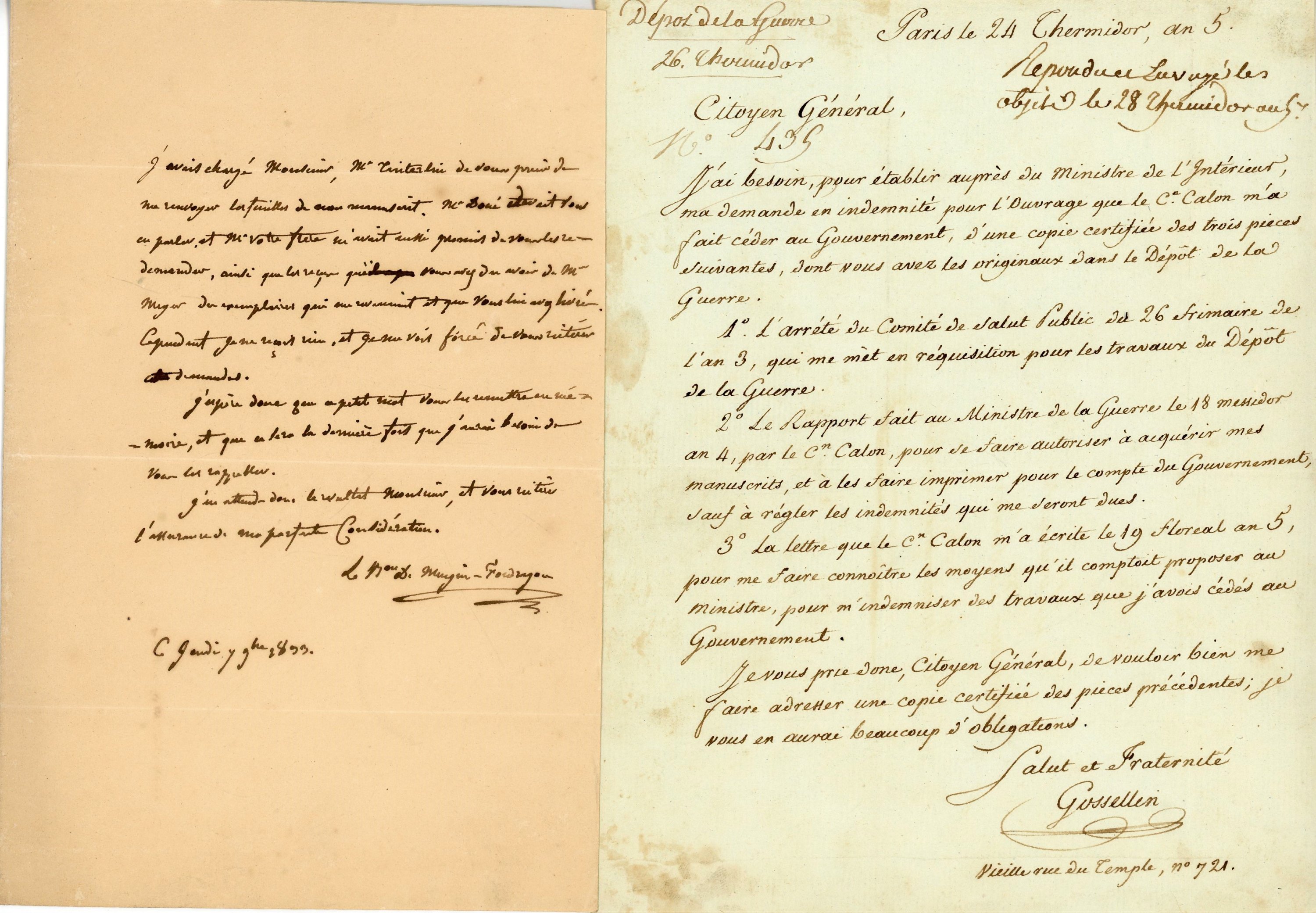 Lot d'env. 40 pièces dont : 8 L.A.S., 1853-1858, Jules GAILHABAUD (1810-1888), homme de lettres et historien d'art lillois, adressées à son éditeur -4 L.A.S. Victor DERODE (1797-1867), historien - 6 L.A.S., 1797-1817, Pascal François Joseph GOSSELIN (Lille 1751-1830), géographe et bibliothécaire, dont L.A.S adressée au directeur général de l'imprimerie impériale - Brouillon de L.A. inachevée, Augsbourg, 2 juin 1800, Claude-Jacques LECOURBE (1759-1815) ...