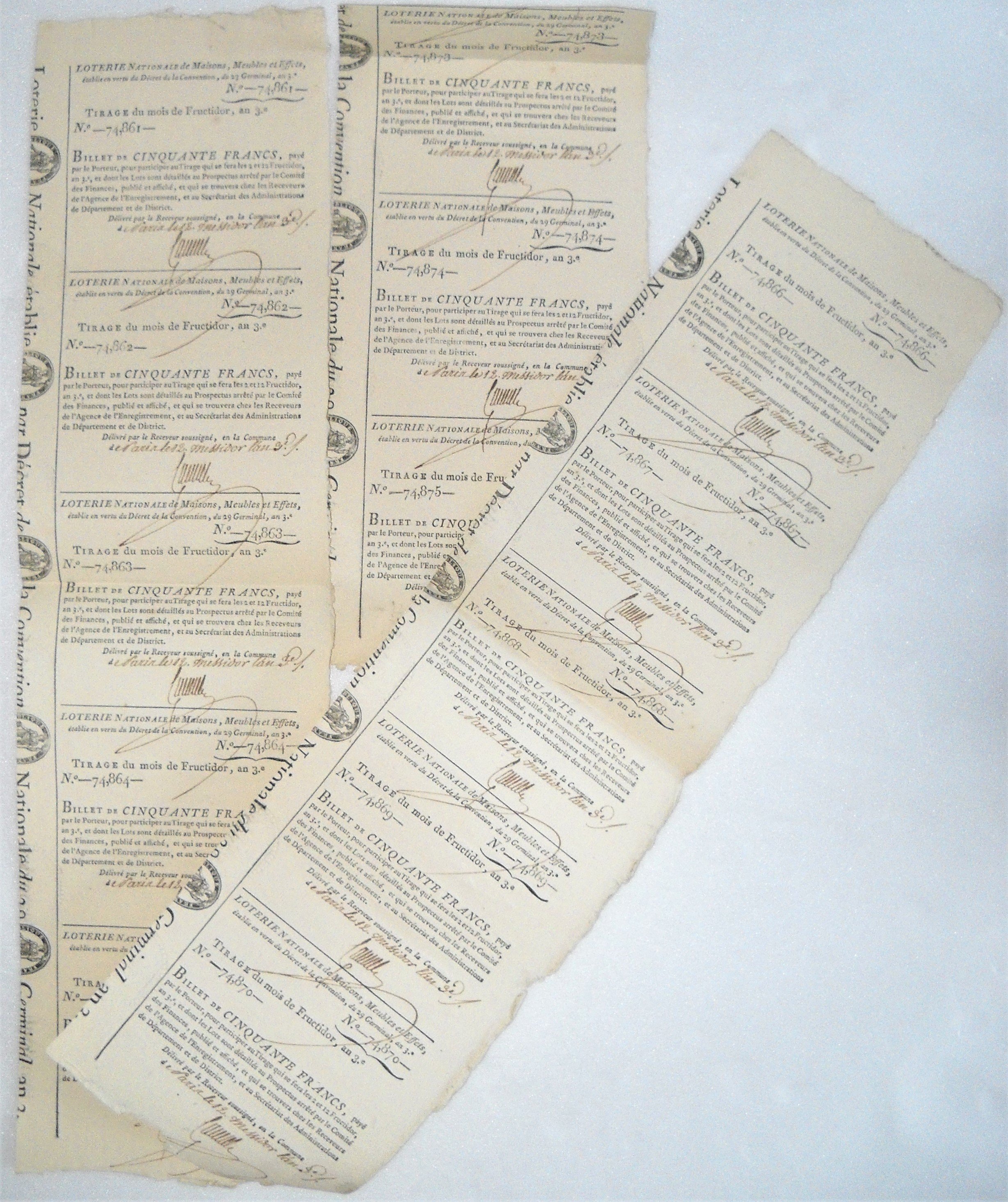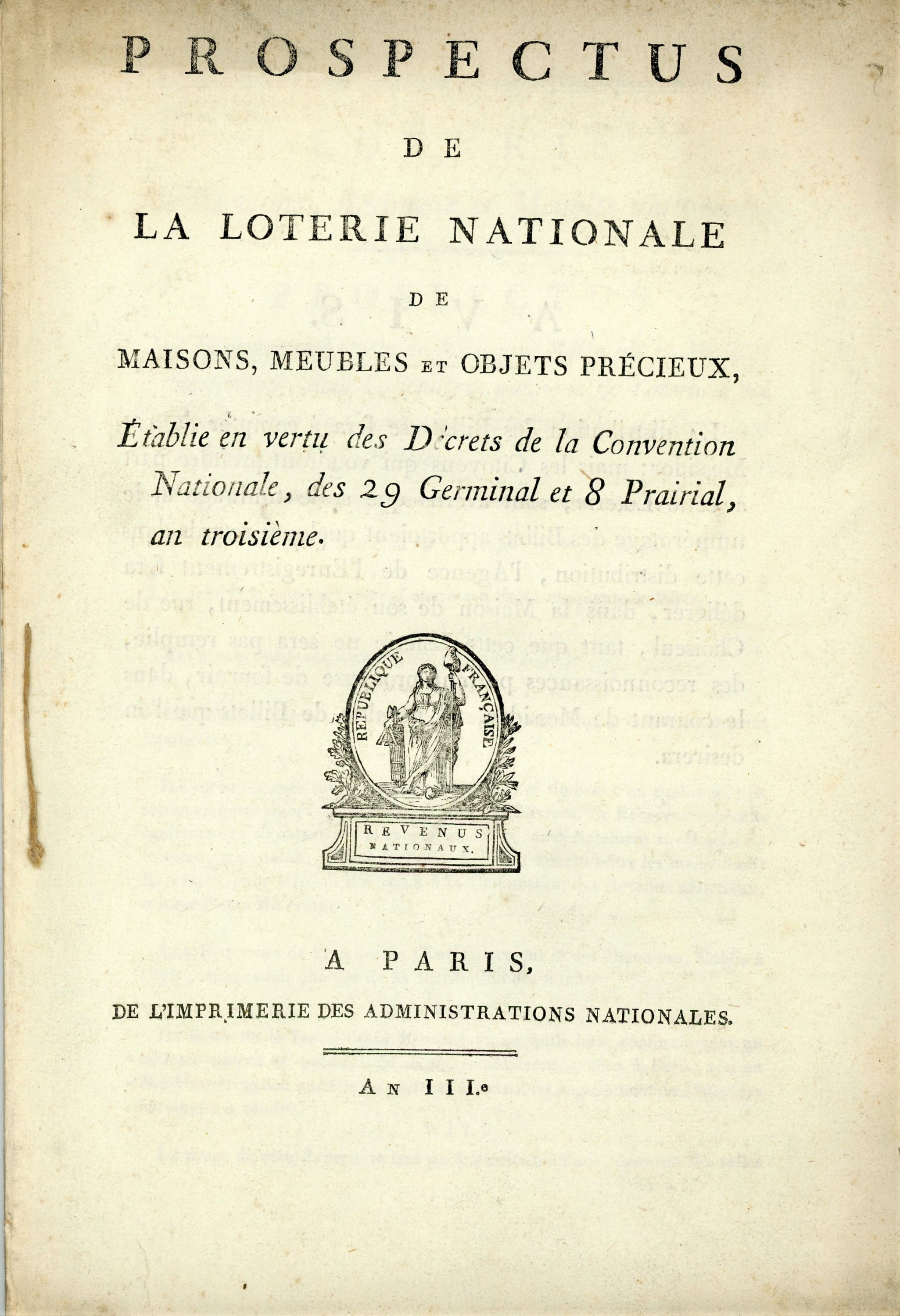 ", an III, 24 pages in-4 ; règlement détaillé du déroulé et liste des lots des biens aliénés à distribuer aux gagnants (50 maisons à Paris, 150 en meubles et 39 800 bons au porteur). Joint suite de 13 billets de 50 francs payés par le porteur pour participer au tirage de la loterie du mois de fructidor an III. Rare ensemble.