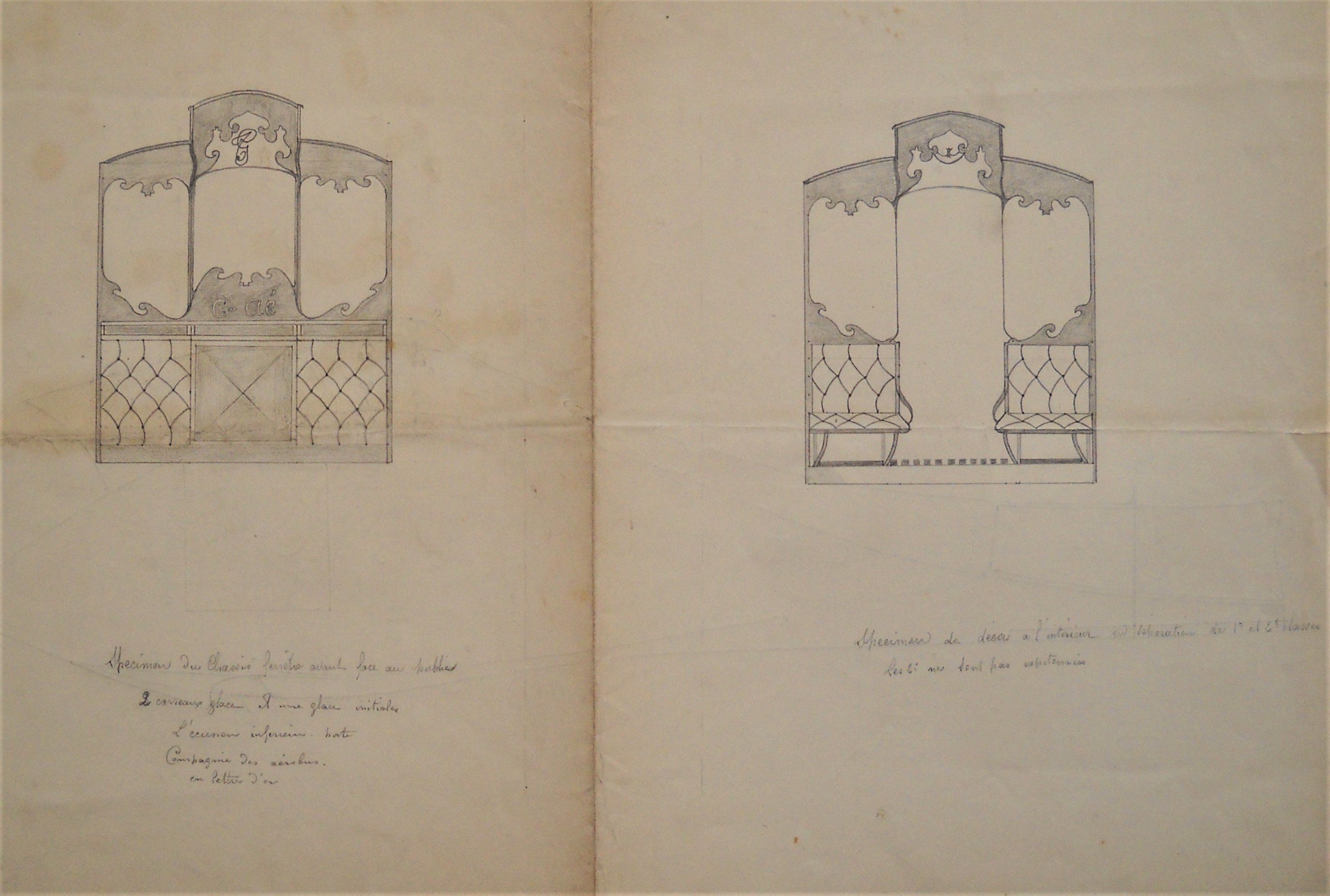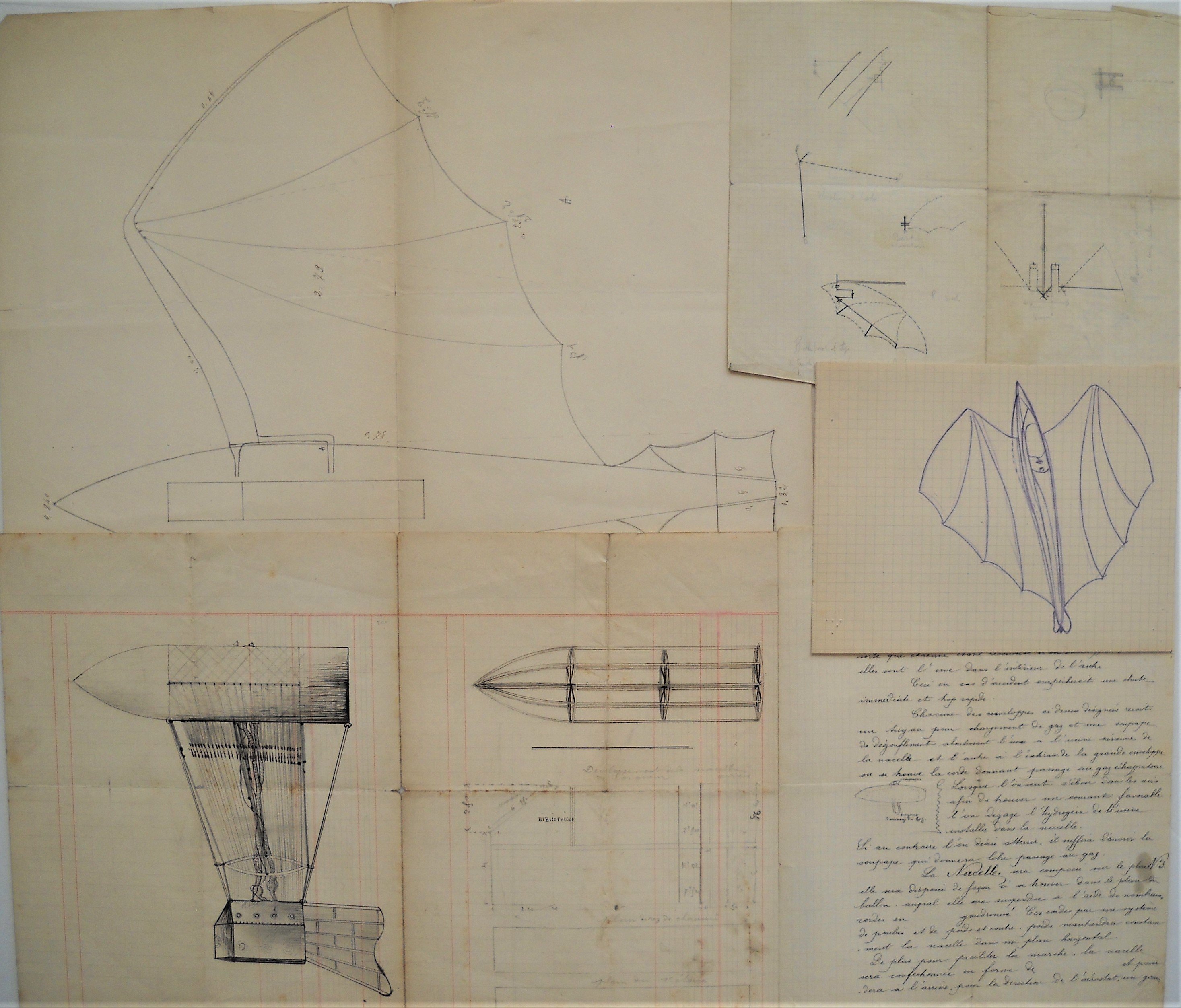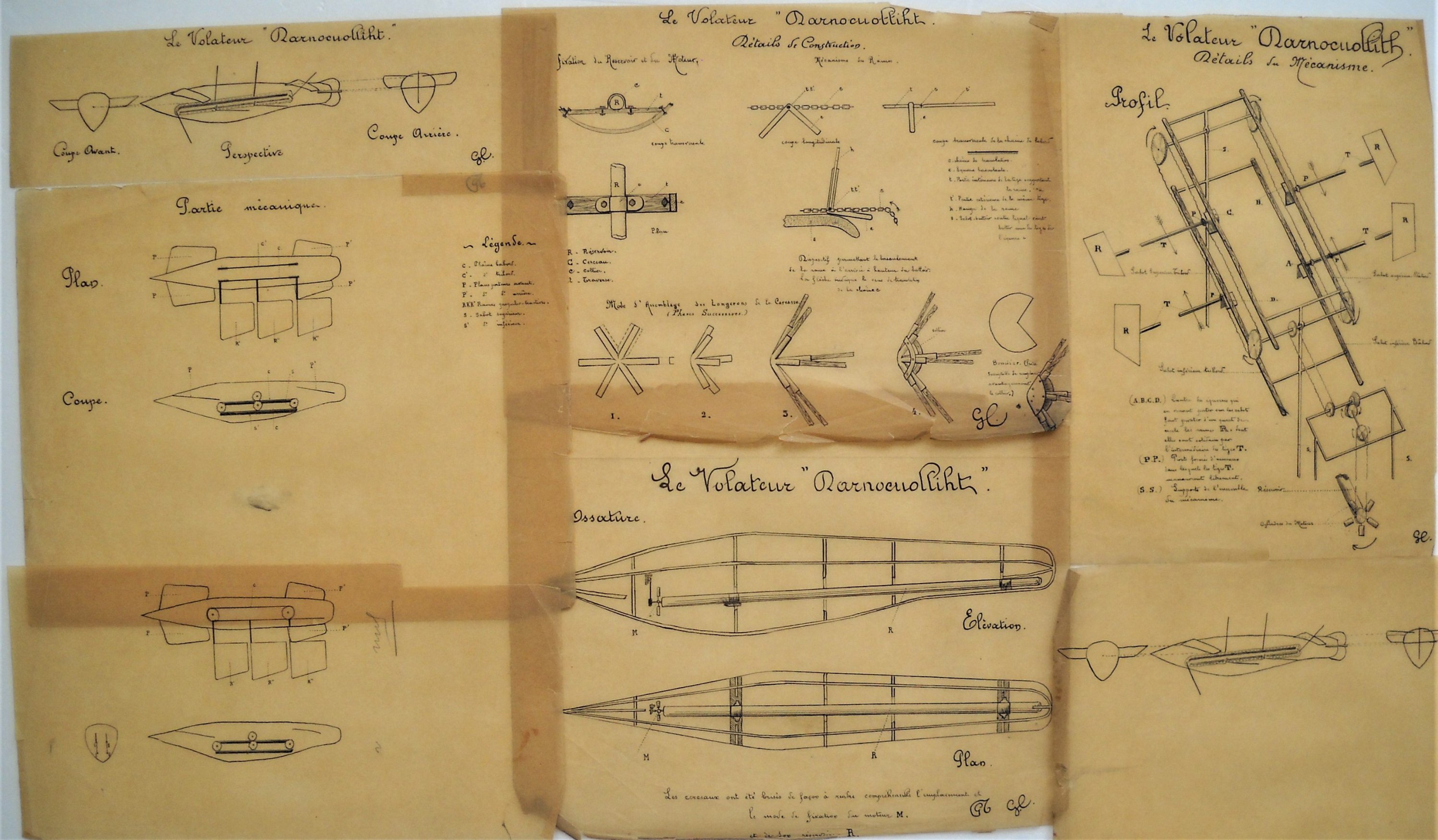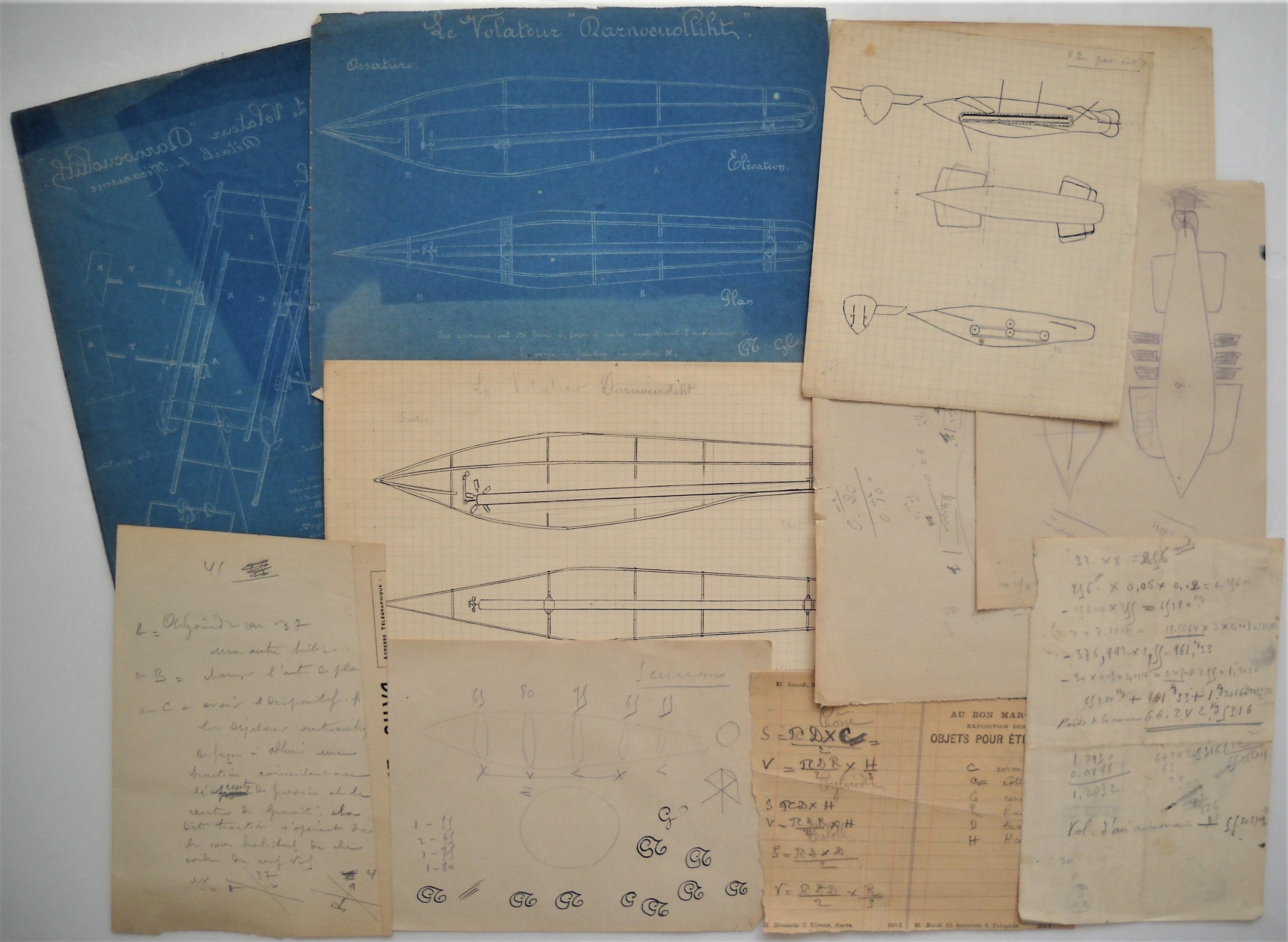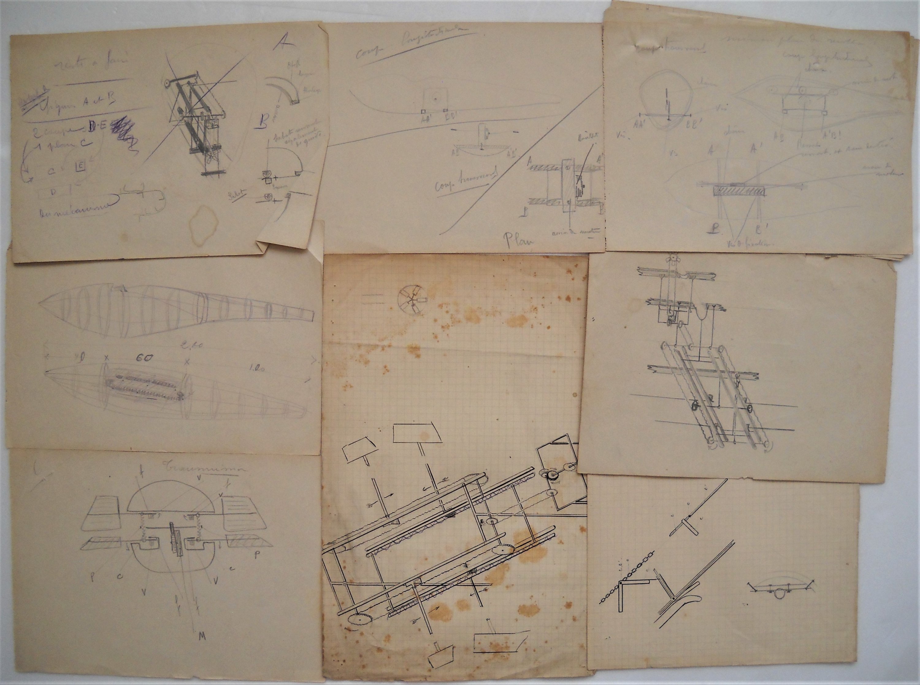 Réunion de plans, croquis, notes, photos et publicités, 1900-1920, dont plans sur calque et bleus d'un volateur dénommé le " Darnocuollith " dont certains signés " G.C. " ; croquis d'inventions d'aéroplanes et d'aérobus ; photos de modèles de monoplans allemands ; etc.