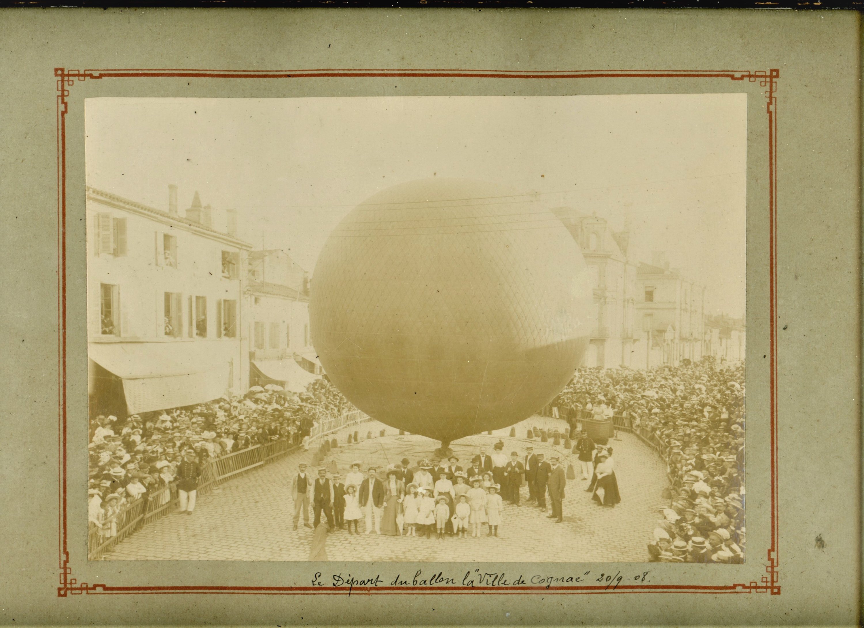 " Le départ du ballon la " Ville de Cognac ", 20/9/1908 ", cliché photographique sur papier salé, 17 x 22 cm, contrecollé sur carton épais et sous cadre (30 x 38 cm) ; vue prise de la place de Cognac lors de la fête du Centre, fête traditionnelle organisée à la mi-septembre au profit des pauvres de la ville.