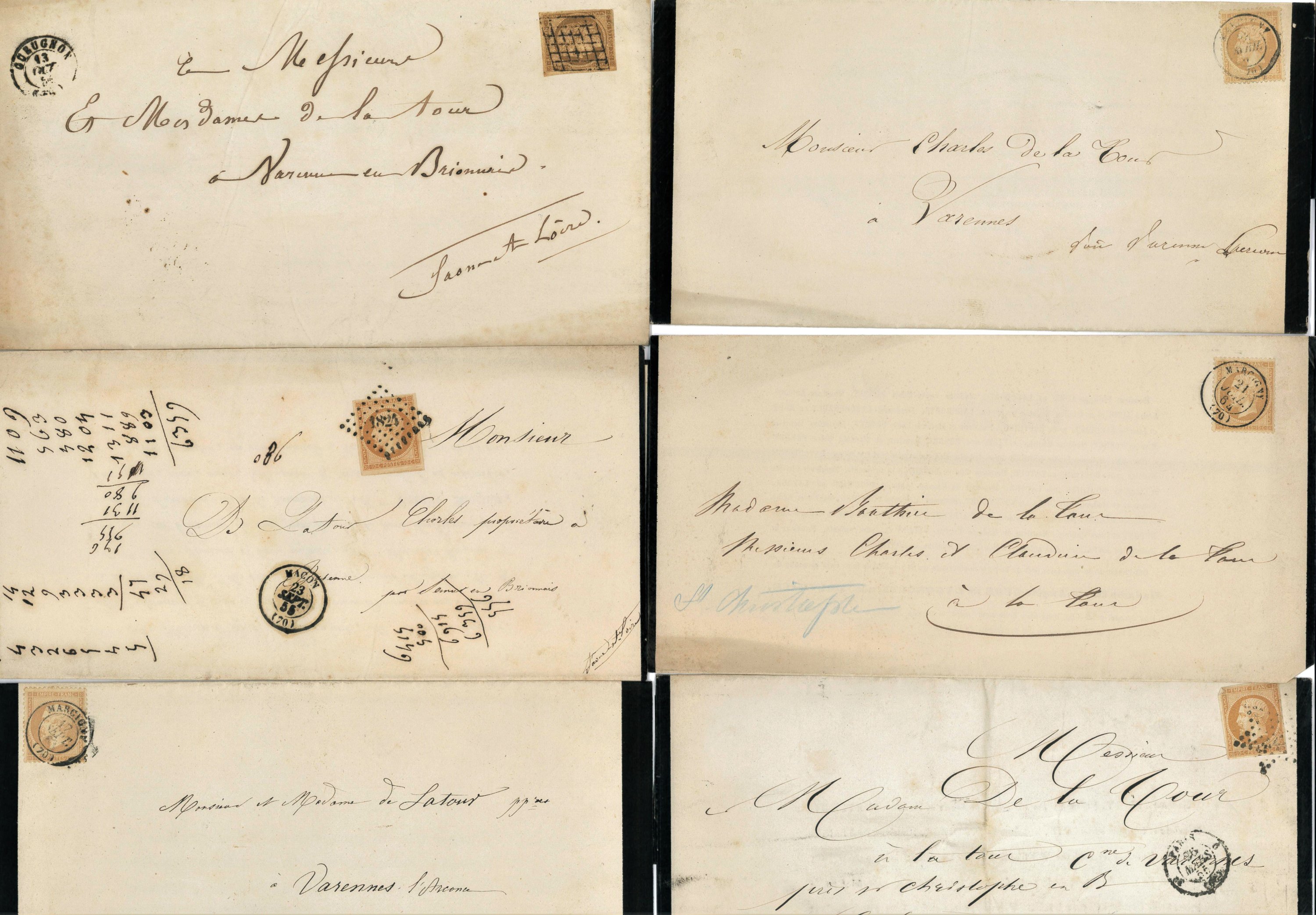 [Bourgogne] Lot de 80 faireparts de naissances, mariages et décès reçus par la famille Bouthier de la Tour, en son château à Varenne-l'Arconce (Saône-et-Loire) entre 1817 et 1868.
