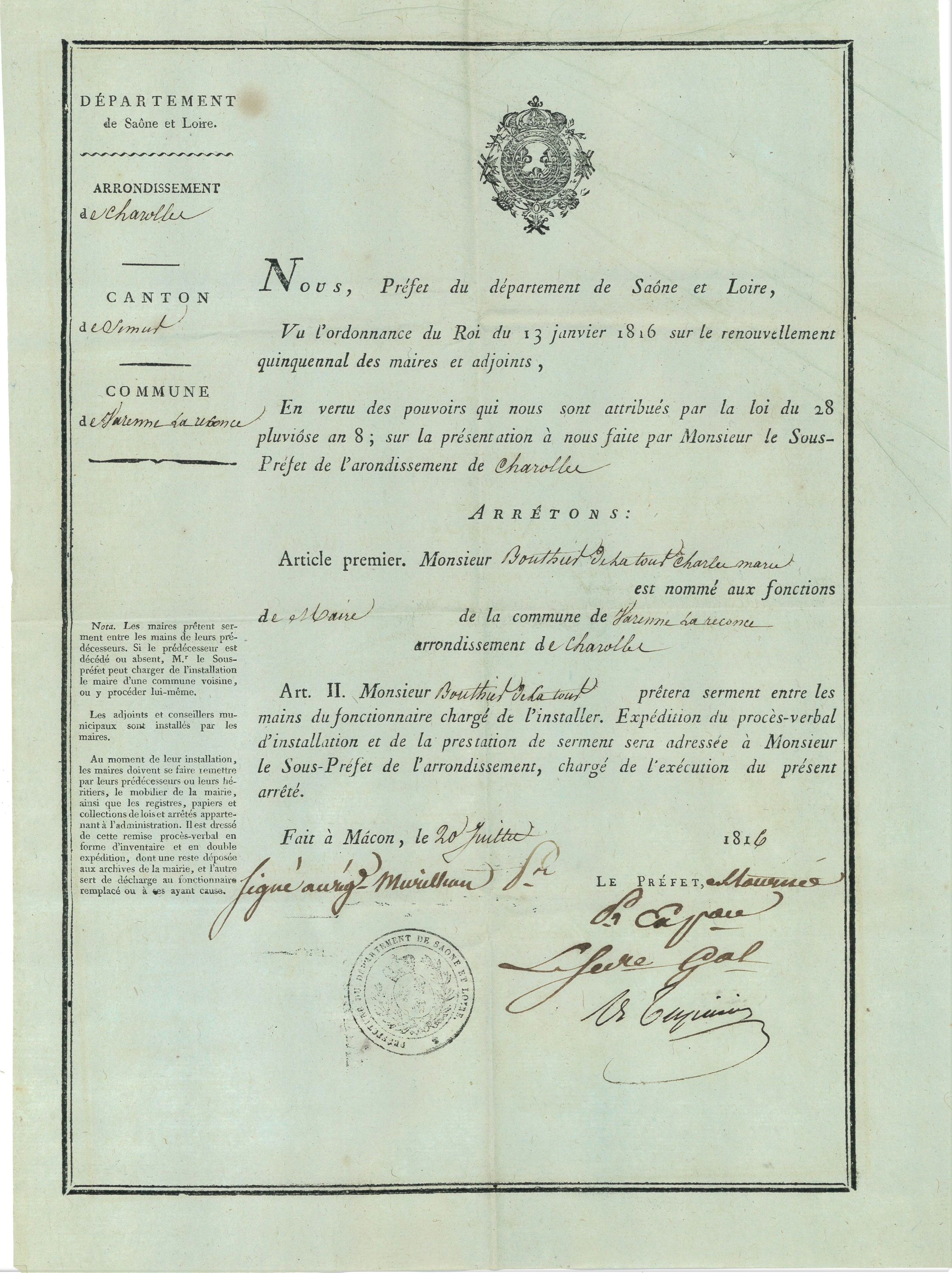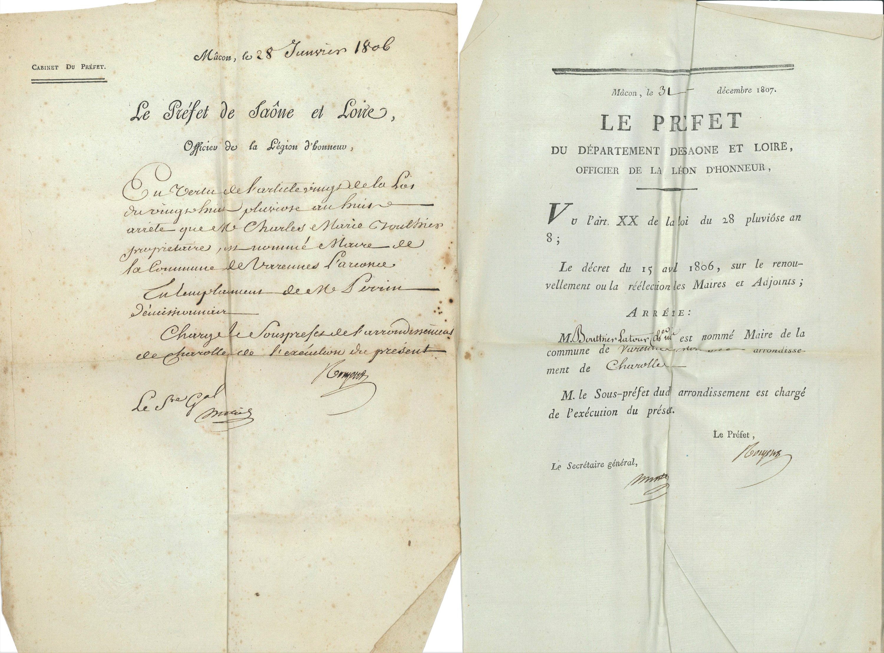 Joint : 4 L.S. signées par le préfet de Saône-et-Loire nommant Charles Marie Bouthier de la Tour, maire de Varenne-l'Arconce en 1806, 1812 et 1816.
