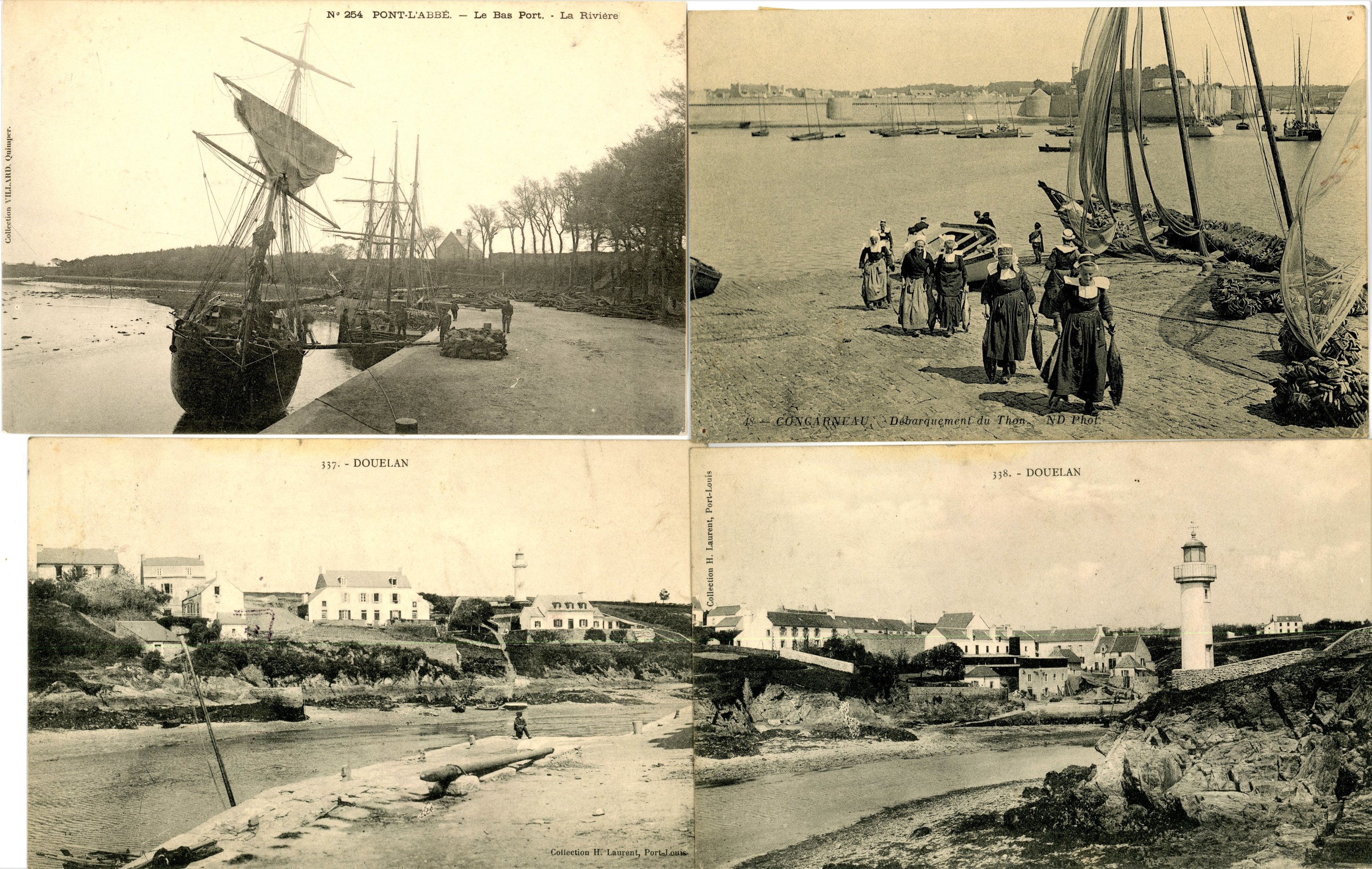[Bretagne] env. 600 cartes postales anciennes et cpsm (Morbihan, Côtes d'Armor, Finistère, Ille et Vilaine), dont scènes et types [env. 30 cp], l'industrie sardinière bretonne [12 cp], et villes, qqs villages, ports, plages, animations, etc. Qqs doubles.