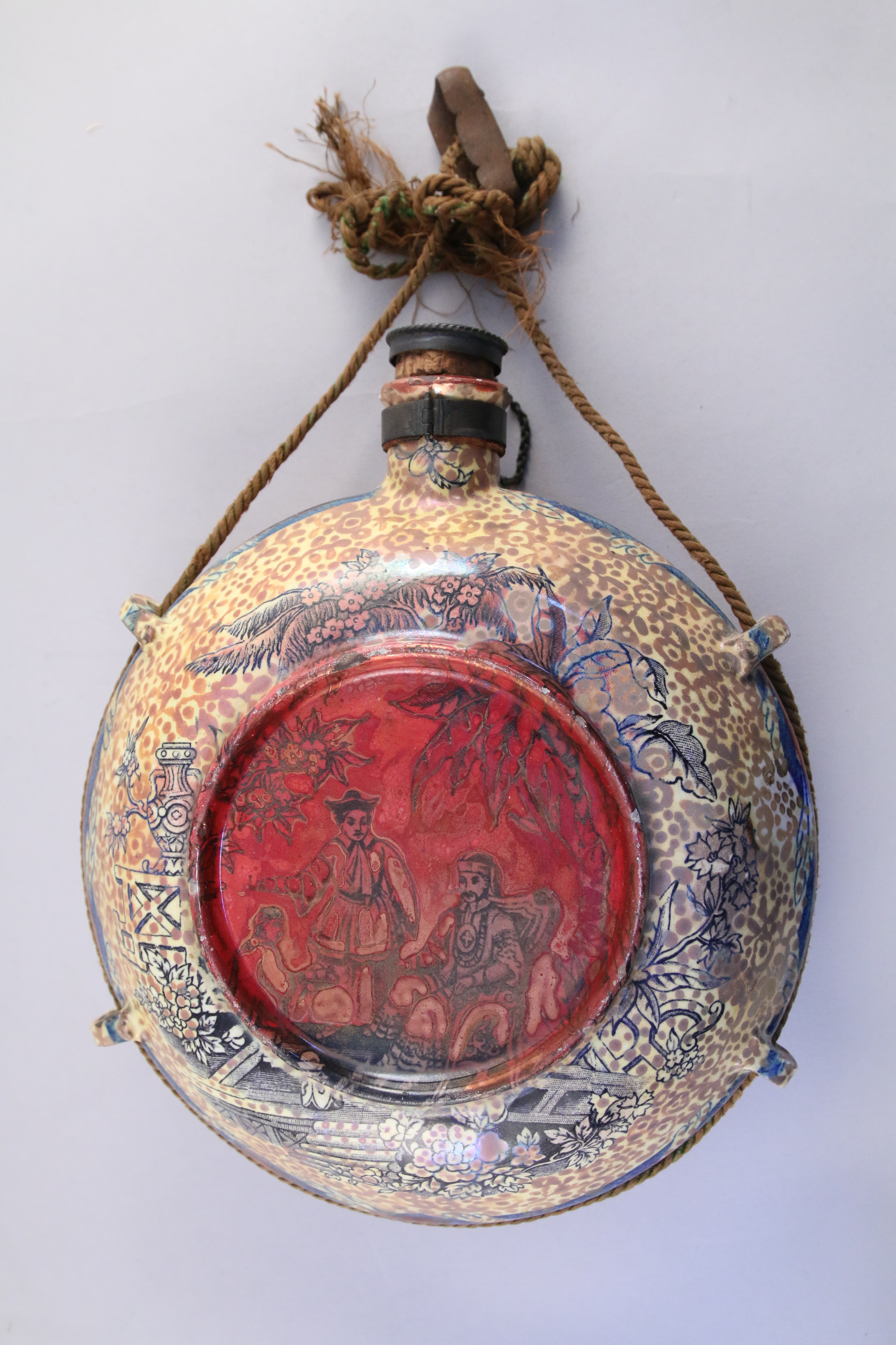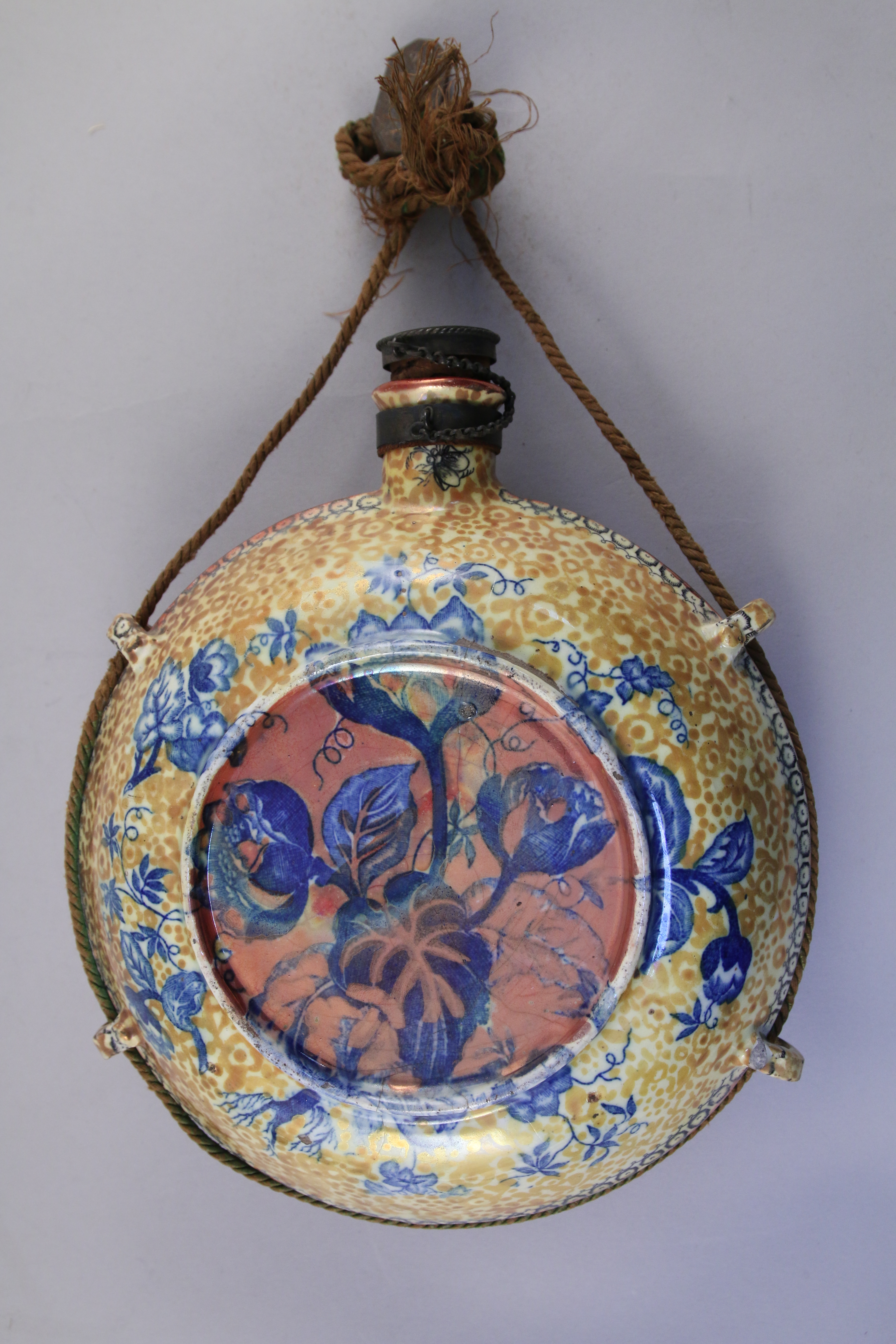 POIRE à POUDRE en céramique émaillée à reflets métalliques,de forme circulaire à décor de fleurs et feuillage stylisés sur fond jaune. Au centre scène représentant un dignitaire et ses serviteurs, le bouchon retenu par une chainette formé par une pièce de monnaie des Pays-Bas avec la légende "DEVS FORTITVDO ET SPES NOSTRA" (La force et l'espoir).