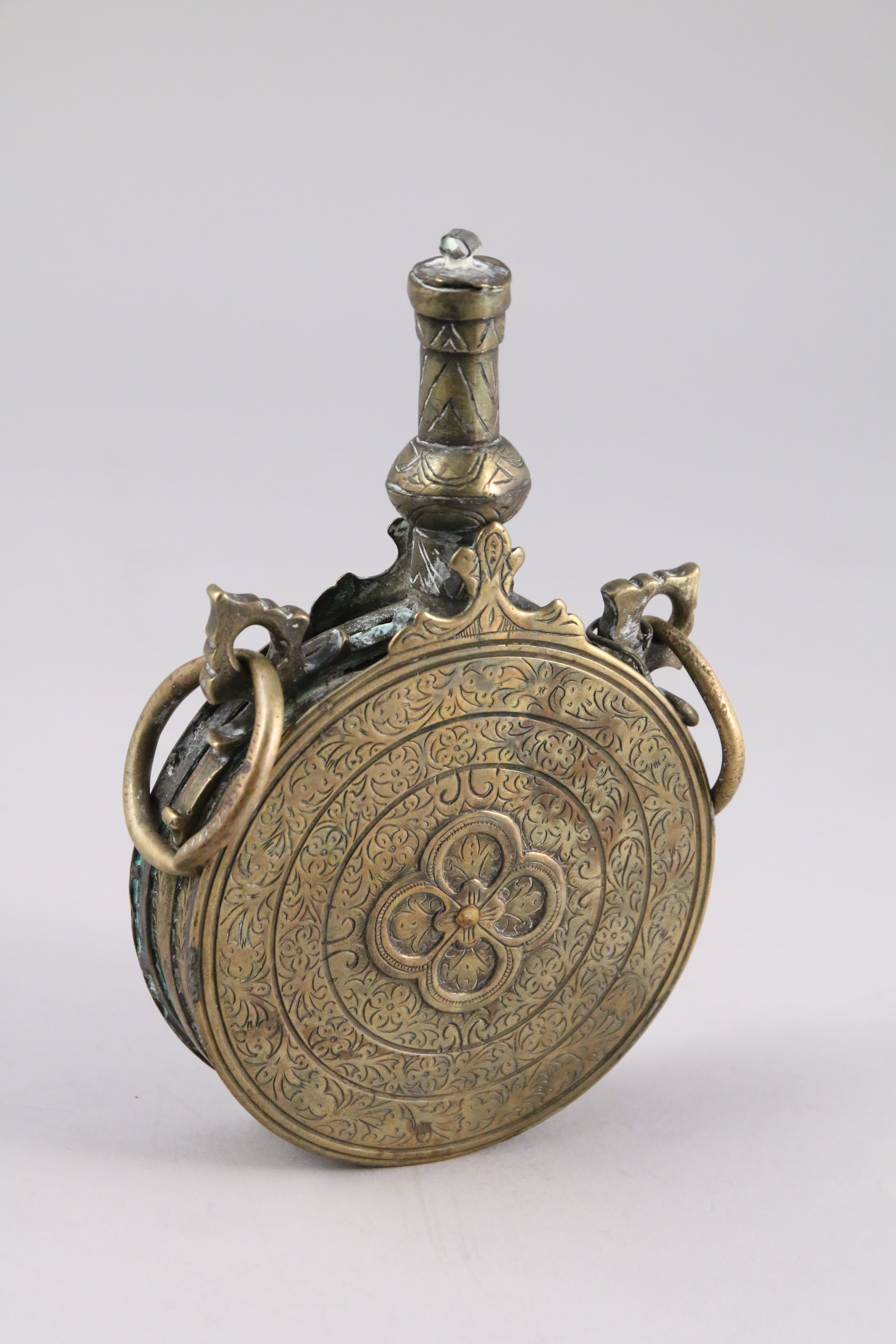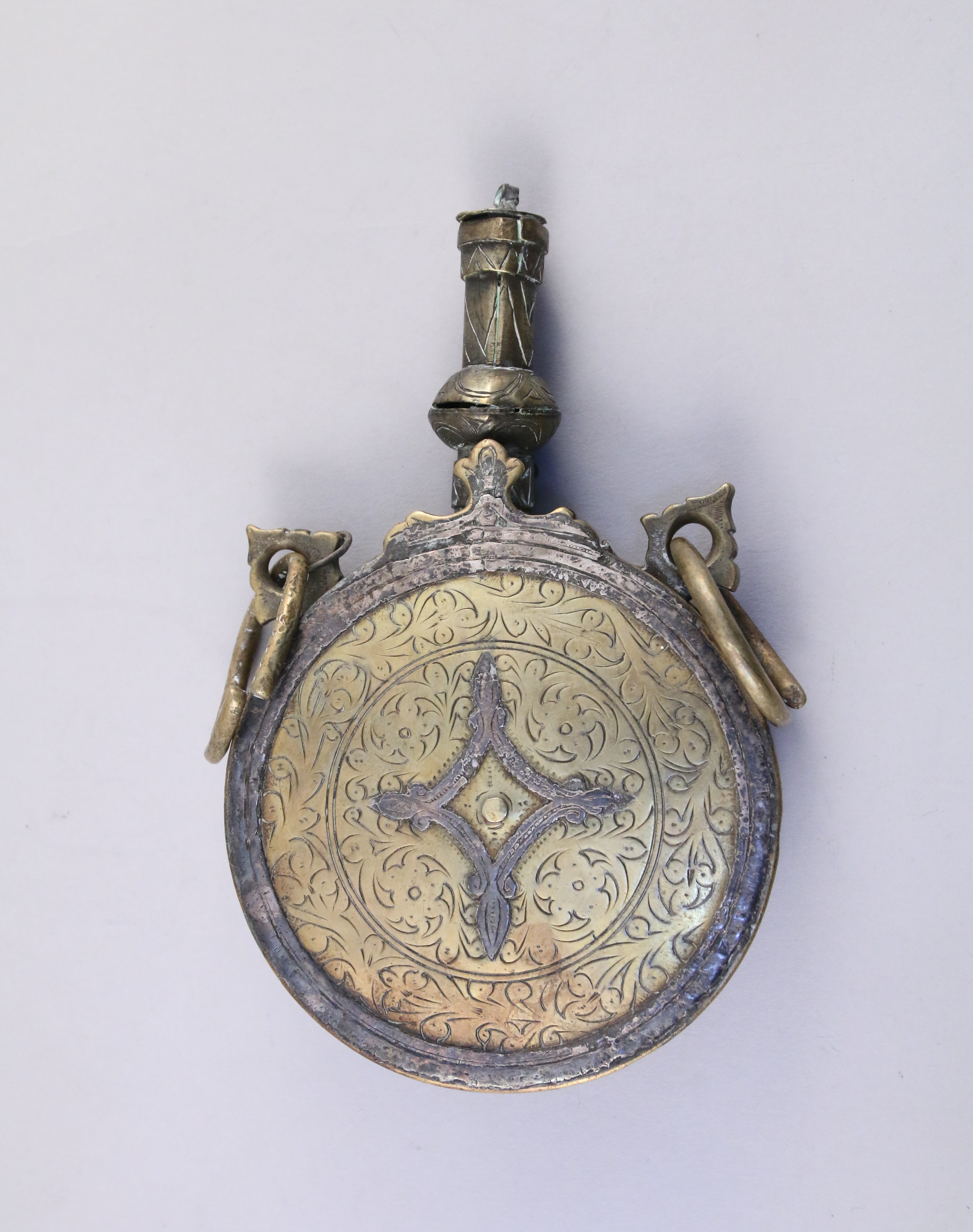 JOINT : POIRE POUDRE en laiton et métal argenté, de forme circulaire à décor ciselé de rinceaux.Travail Ottoman de la fin du XIXe. Haut. 16,5, Diam. 9,5 cm (accidents).