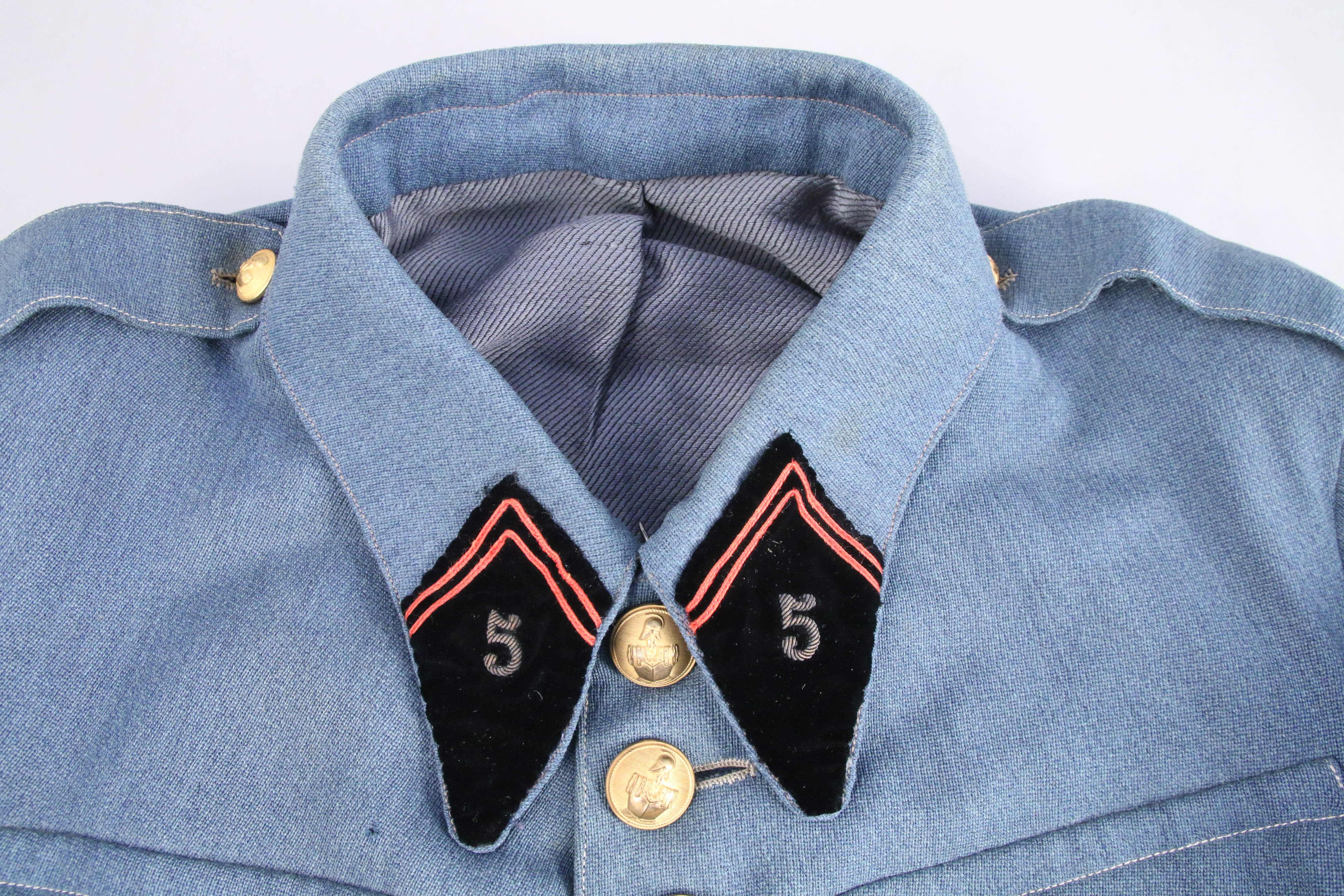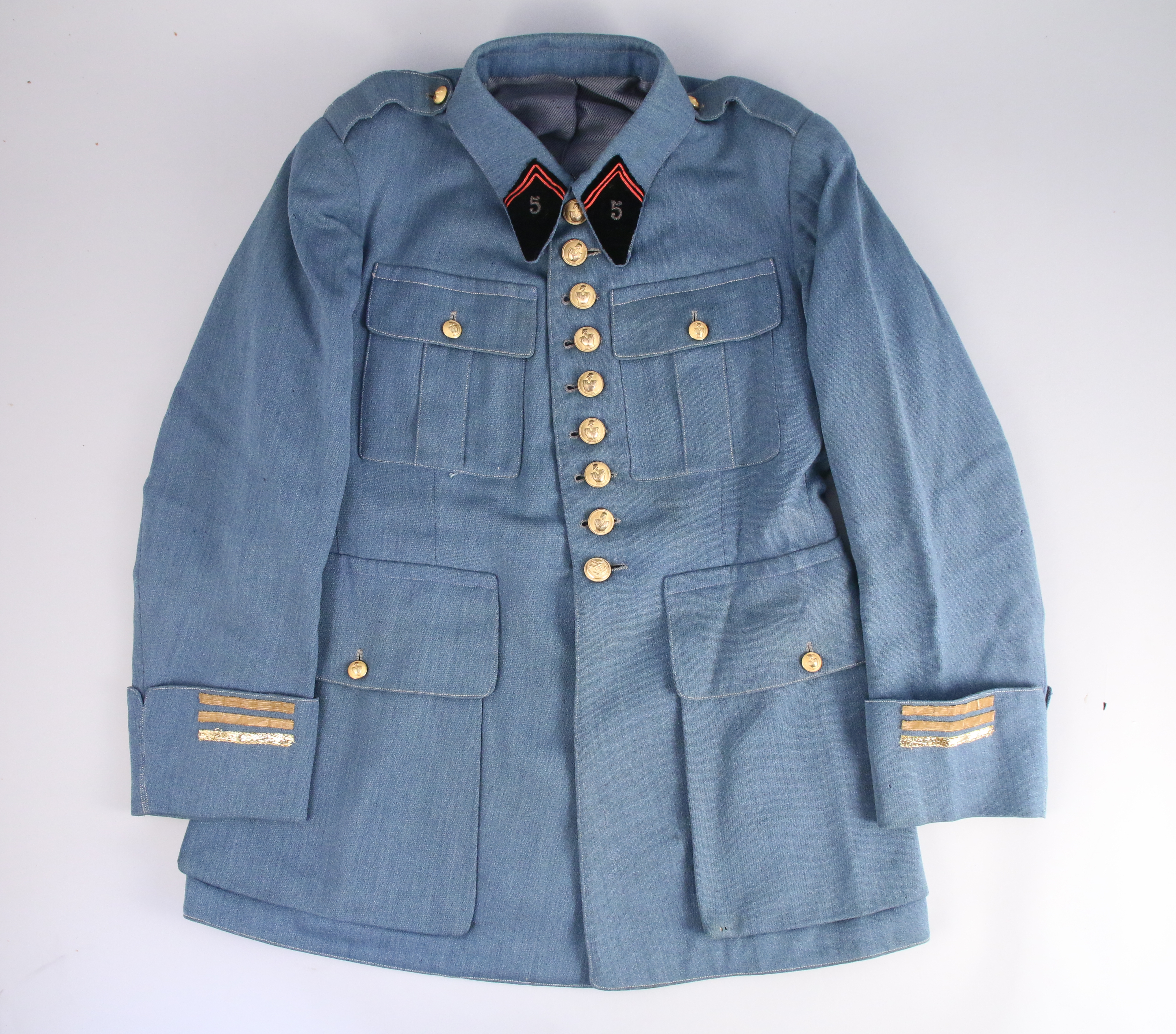 Uniforme quatre poches en drap de laine bleu azur. Pattes de col au chiffre "5" (pour le régiment de Tours ?). Les boutons portant emblème du génie (une cuirasse sommée d'un casque), un bouton changé.