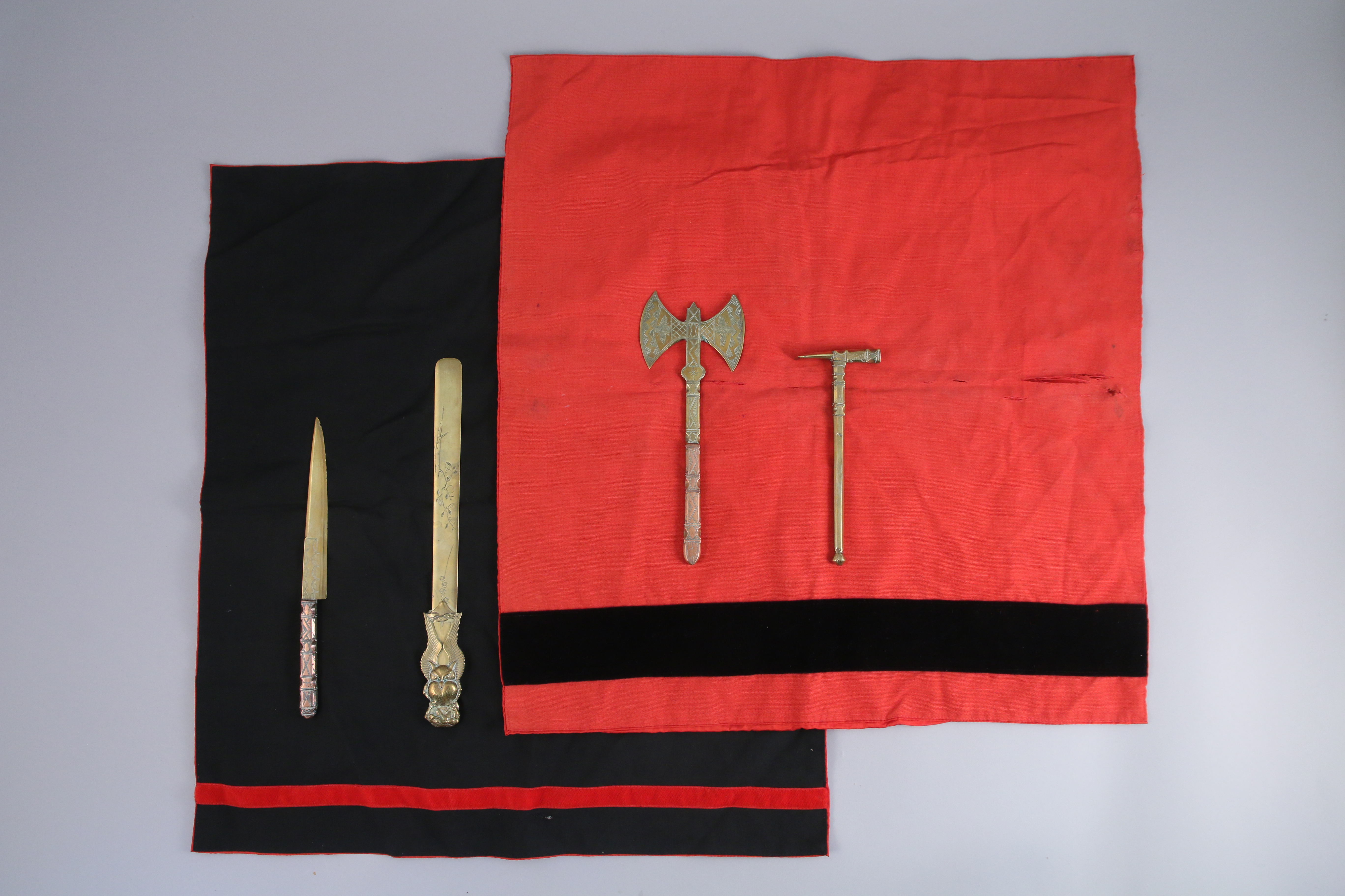 - Quatre objets symboliques en métal doré, un couteau, un coupe-papier, une hâche double-face, un marteau.