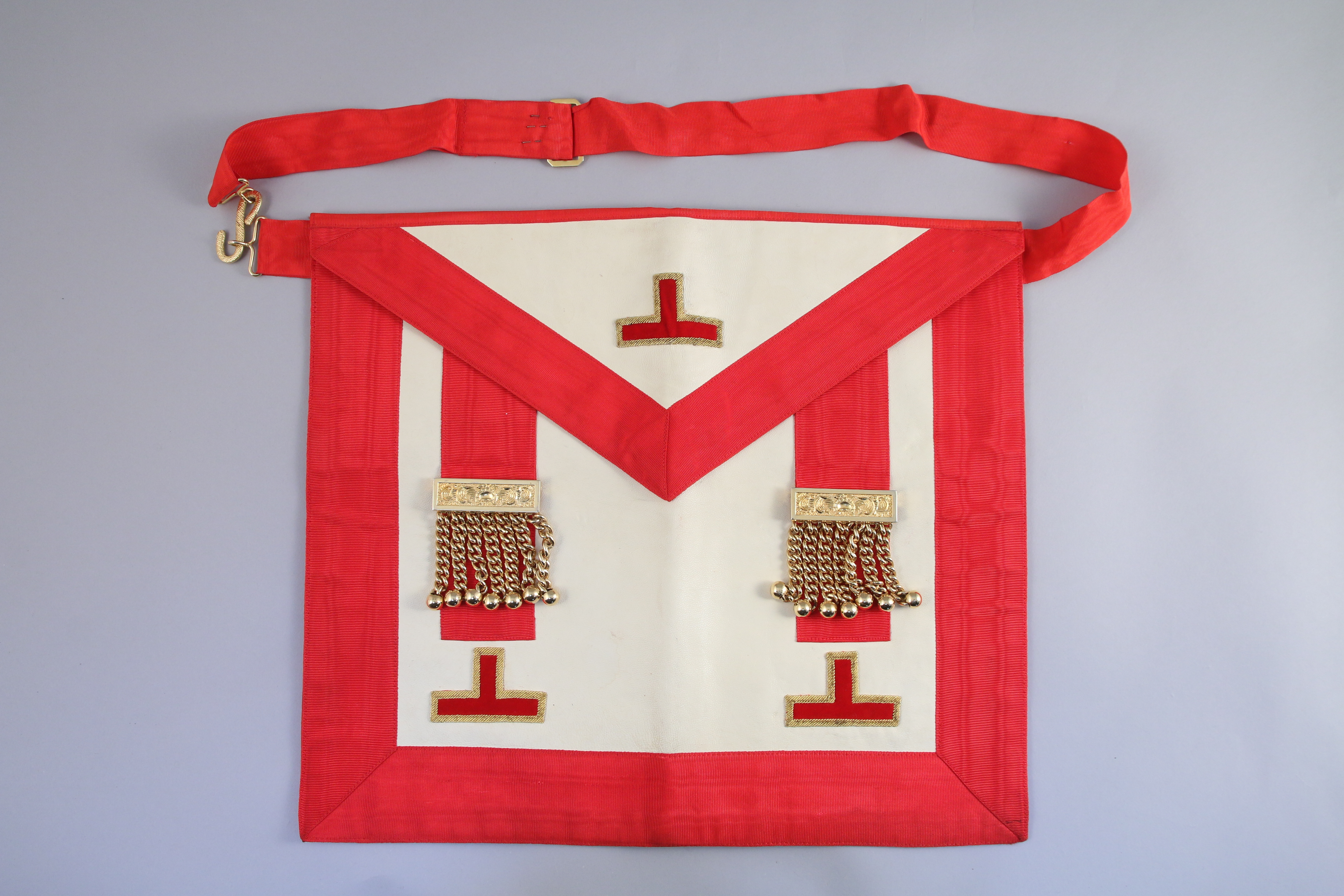 - Tablier orné de grelots et de trois Tau, deux colliers, pochettes, étuis, vêtement.