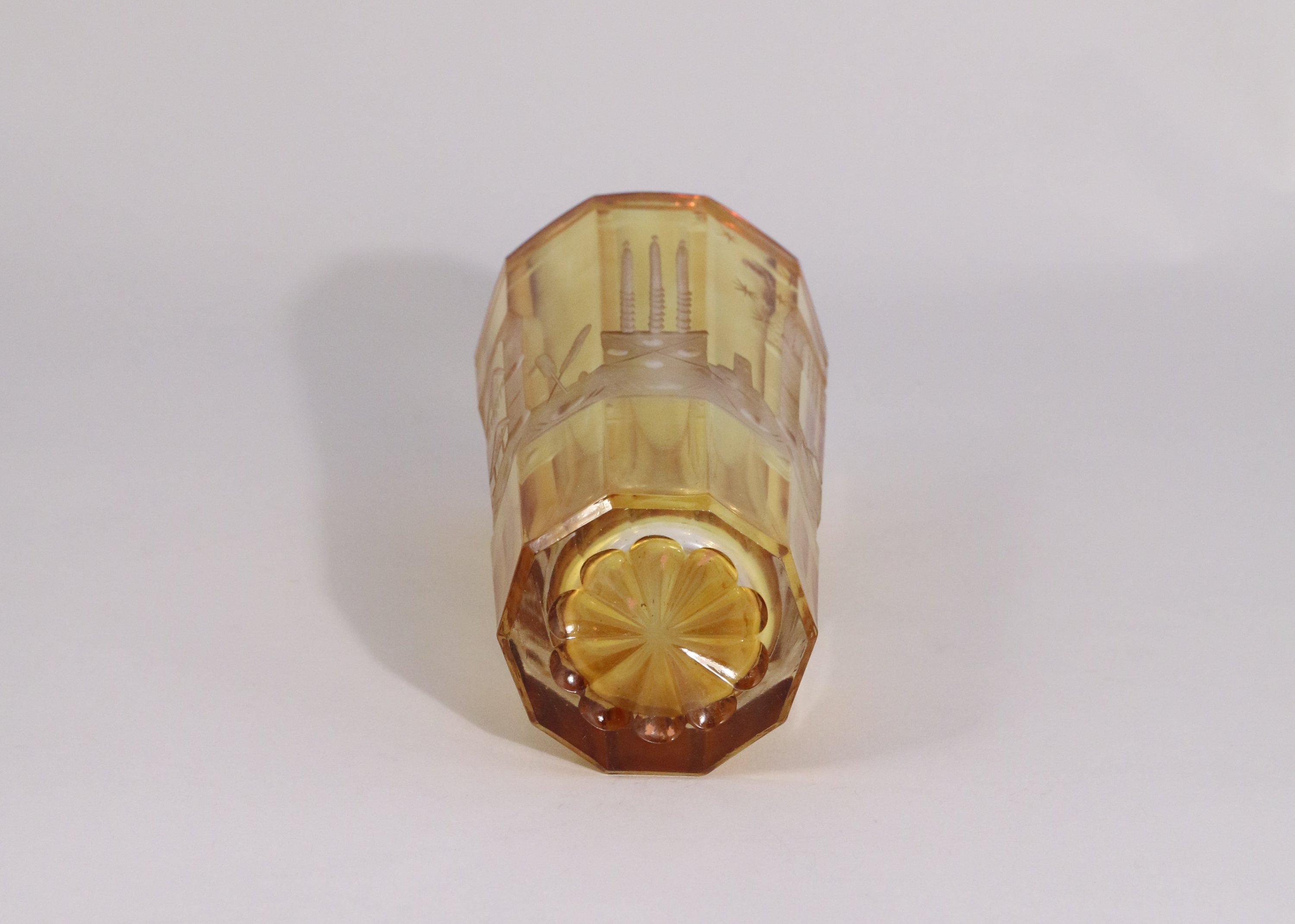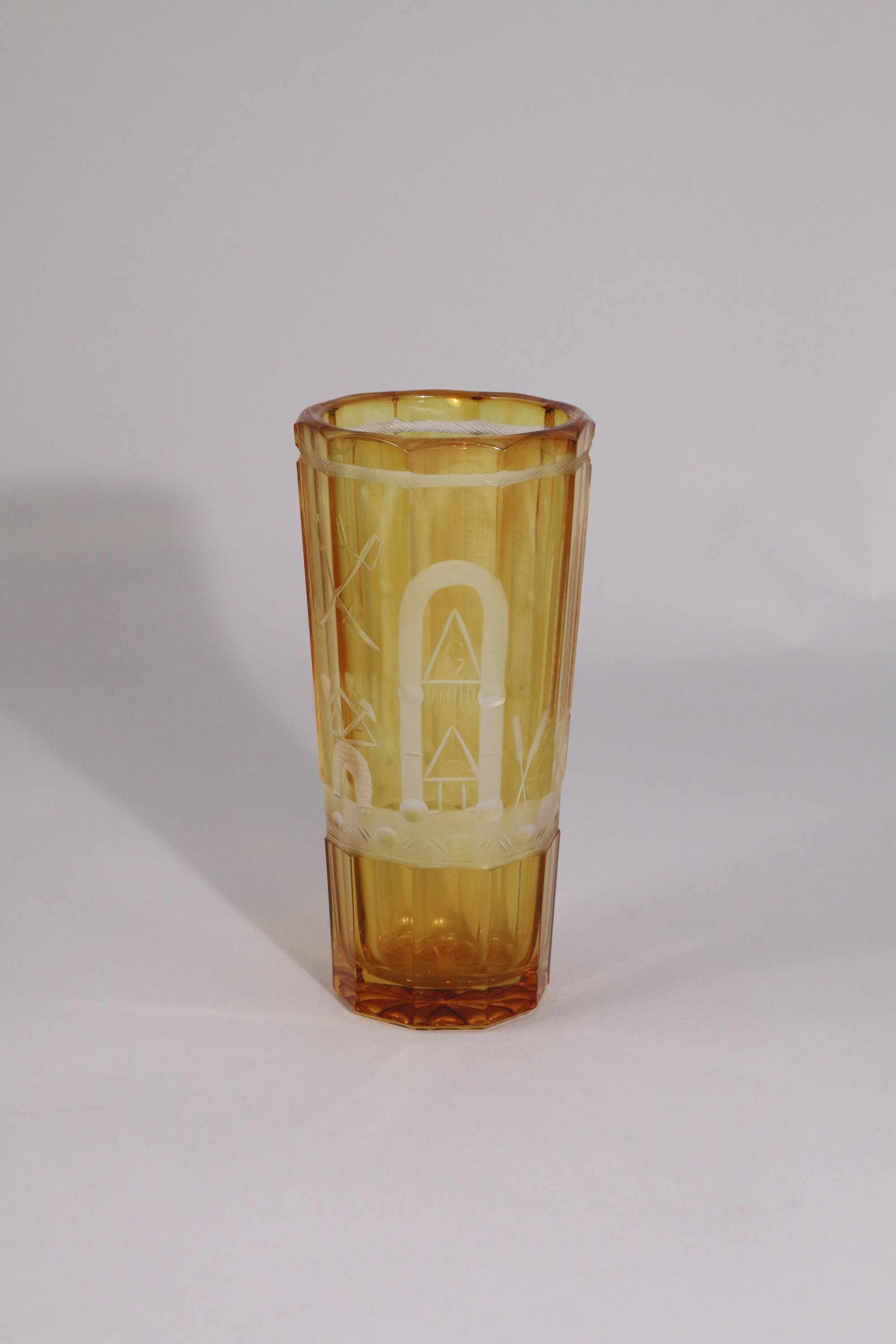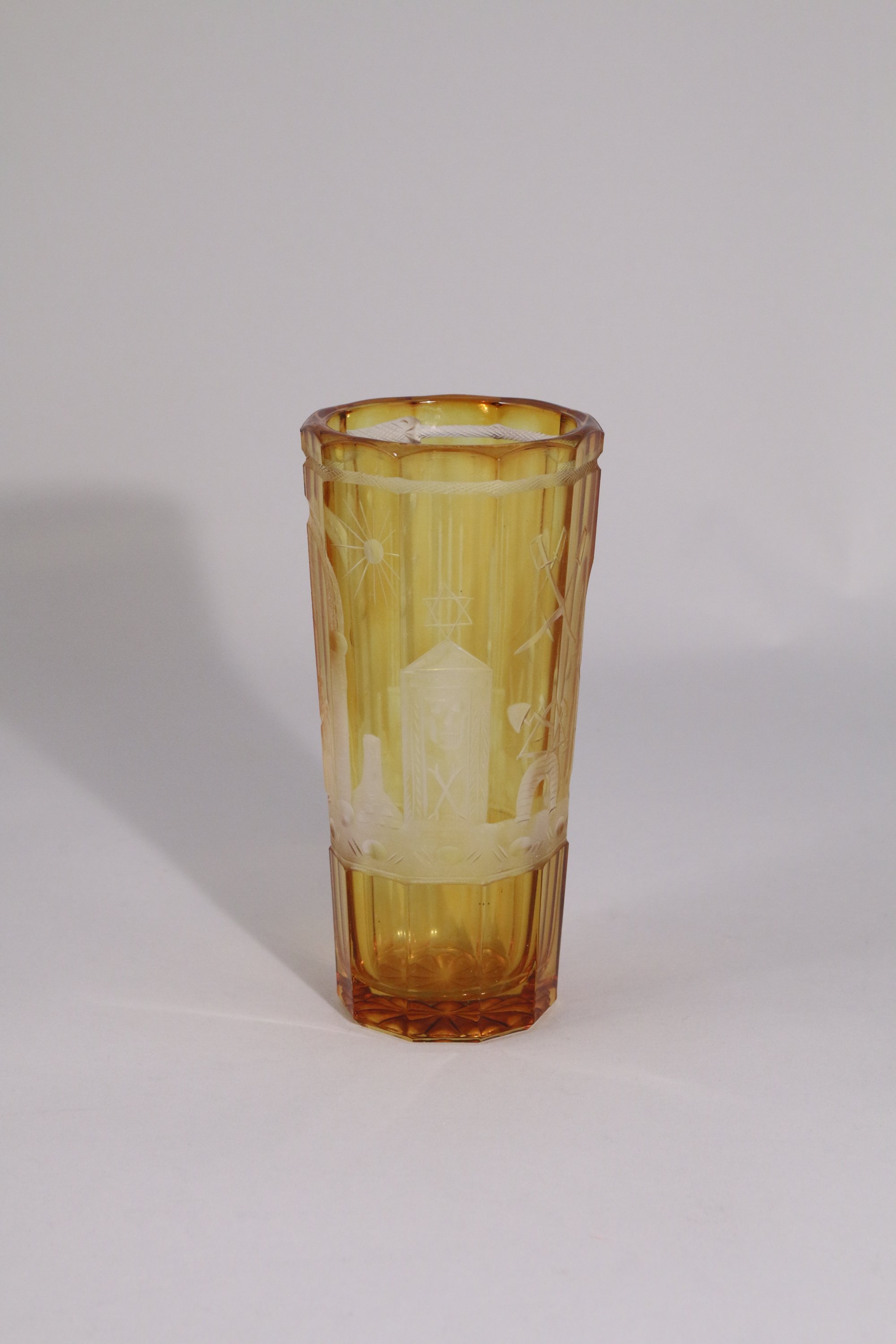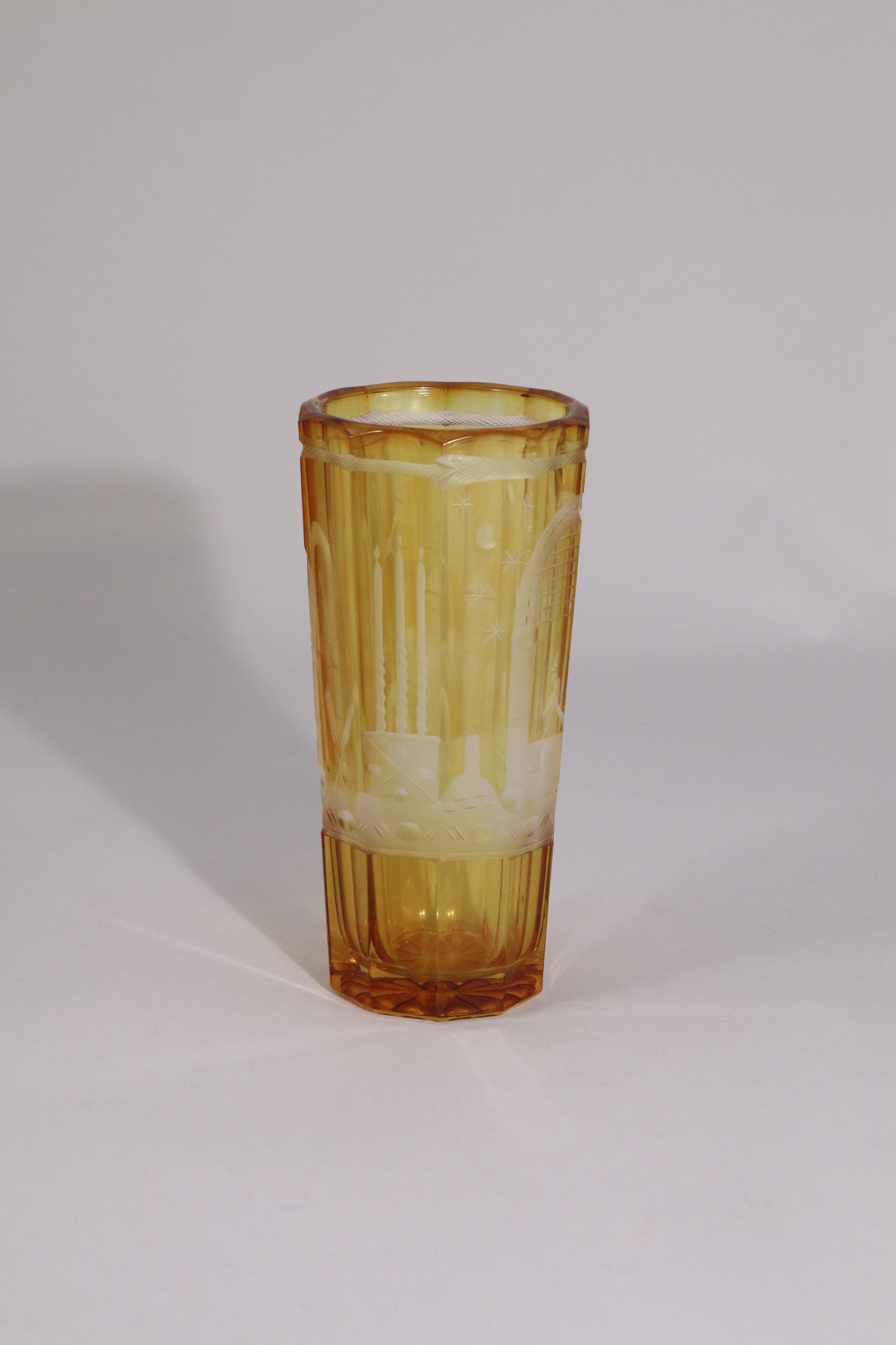 En cirstal de Bohême gravé tienté jaune. De forme droite, il est orné dans un registre ceint d'un serpent se mordant la queue : d'épées croisées, marteau et truelle dans une équerre, colonnes formant arche, de l'oeil de la providence, étoile de David, lune, astre solaire, et autres symboles maçonniques.