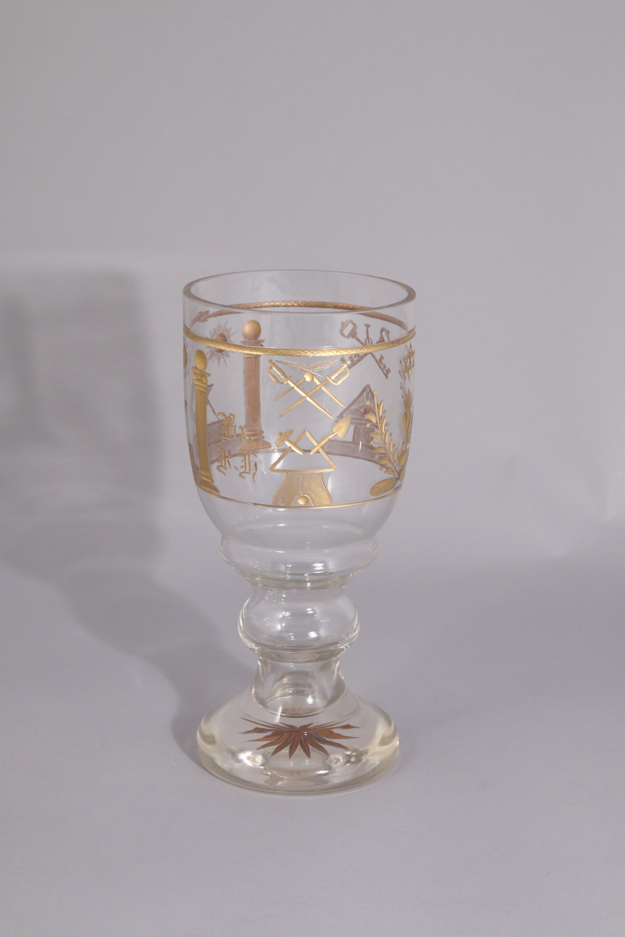 Gravé et doré. En forme de calice, il est orné dans un registre ceint de deux fils d'or : d'épées croisées, de clés croisés, marteau et truelle dans une équerre, colonnes, de l'oeil de la providence, étoile de David, lune, astre solaire et compas. Il repose sur un piédouche, la base gravé et doré d'une étoile.
