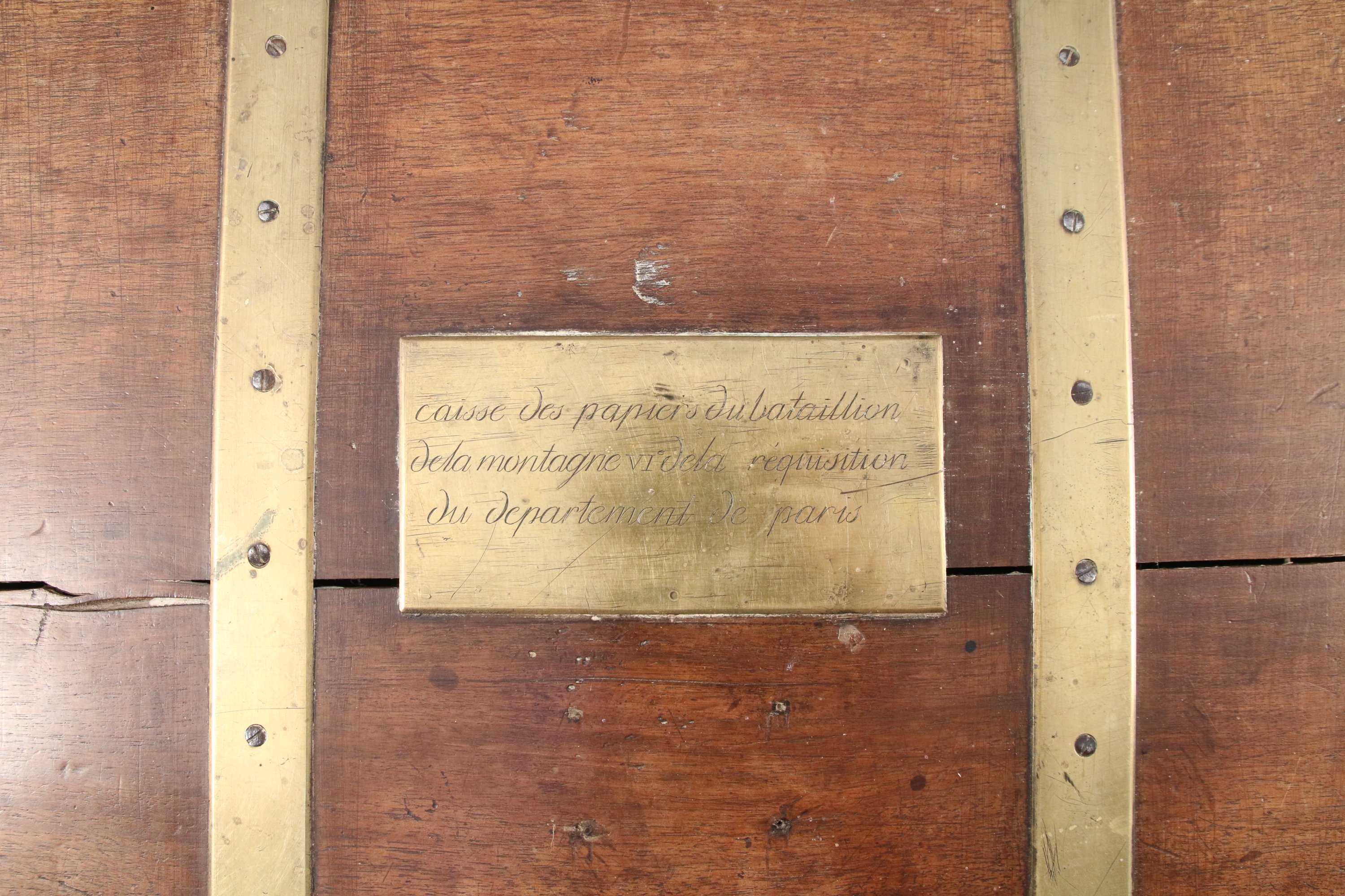 de forme quadrangulaire en acajou agrémenté de pentures en bronze/laiton? doré et de deux poignées latérales amovibles. Sur le couvercle une plaque en bronze gravée "caisse des papiers du bataillion de la montagne VI de la requisition du departement de paris".