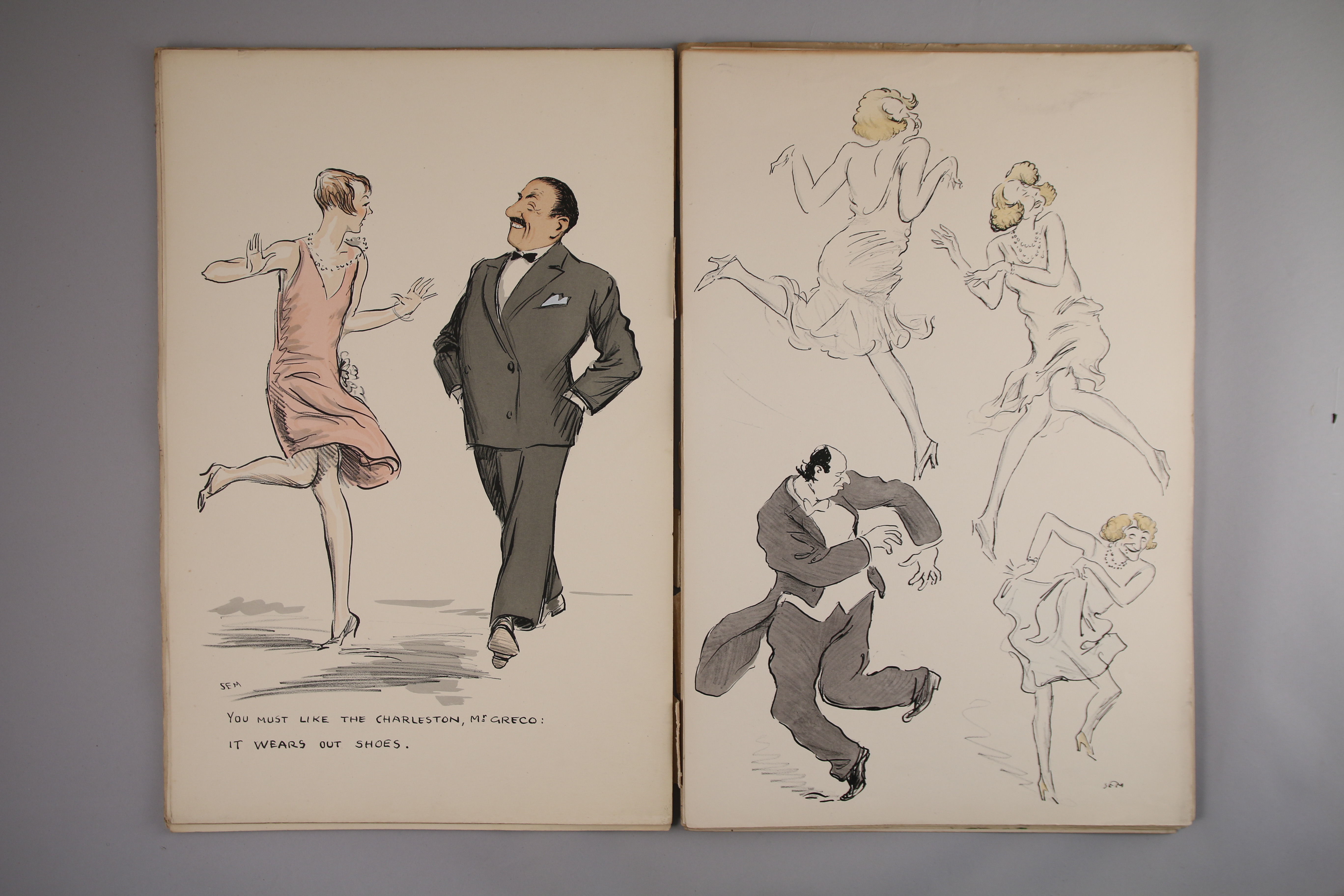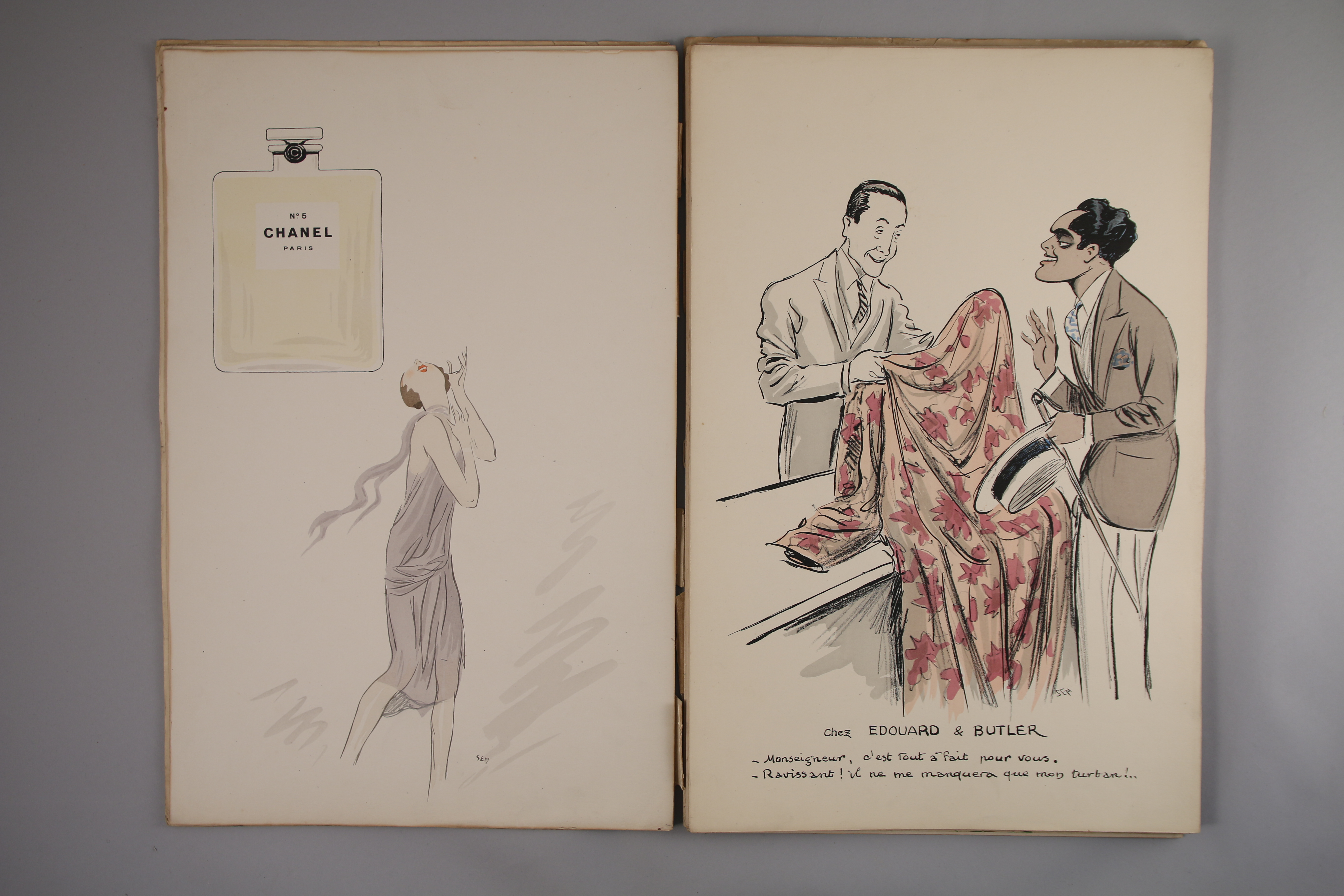 Suite de 40 planches en couleurs, dont deux de couverture (abimées) représentant des personages célèbres des années 1920 et des situations cocasses autour du Charleston, de la revue nègre et autres orchestres de jazz. Sont également présentes des planches publicitaires pour Chanel n°5, Patou, les champagnes Heidsieck Monopole, les cigarettes Chesterfield, Gelot, les automobiles Fiat, Cinzano ou l'eau de Perrier.