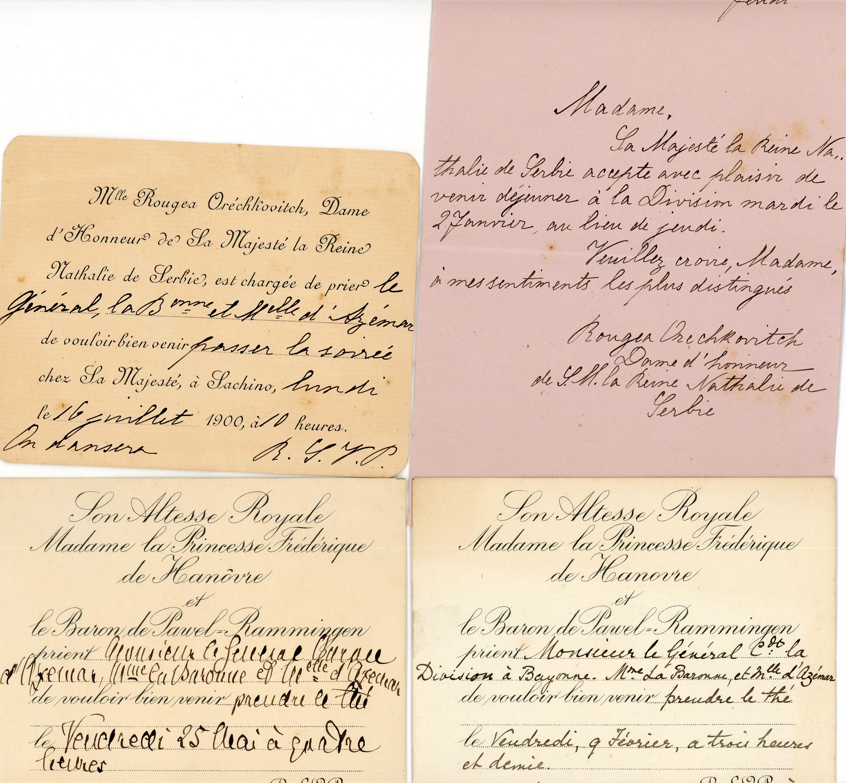 Lot de + de 235 pièces, principalement correspondance de la famille, amis, officiers et sous-officiers, cartons d'invitations, cartes postales reçues, etc ; 1841-1917.