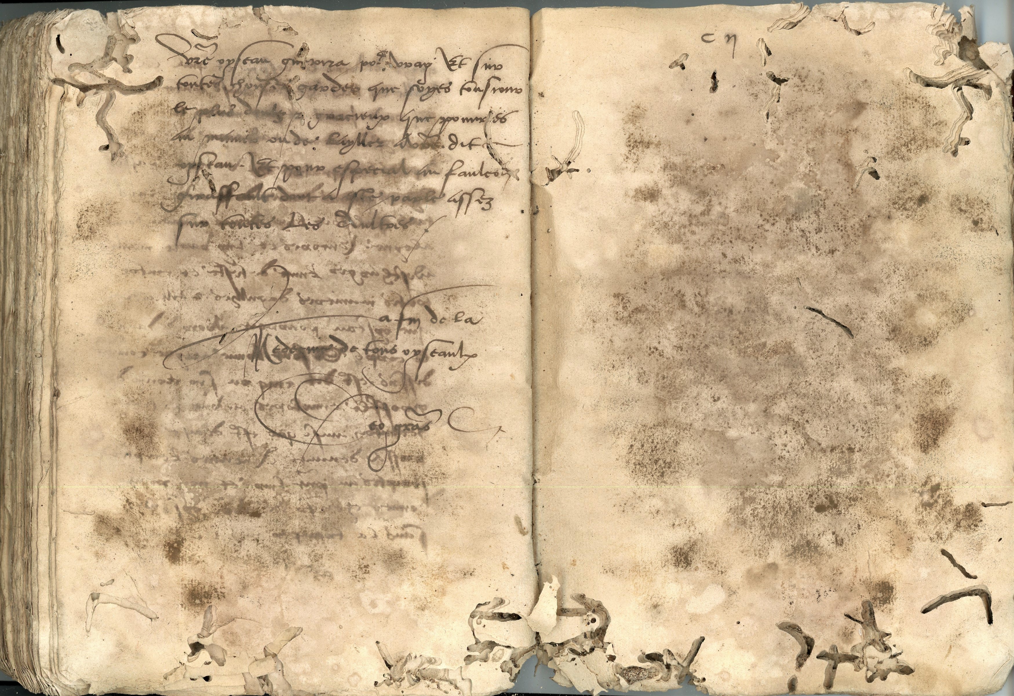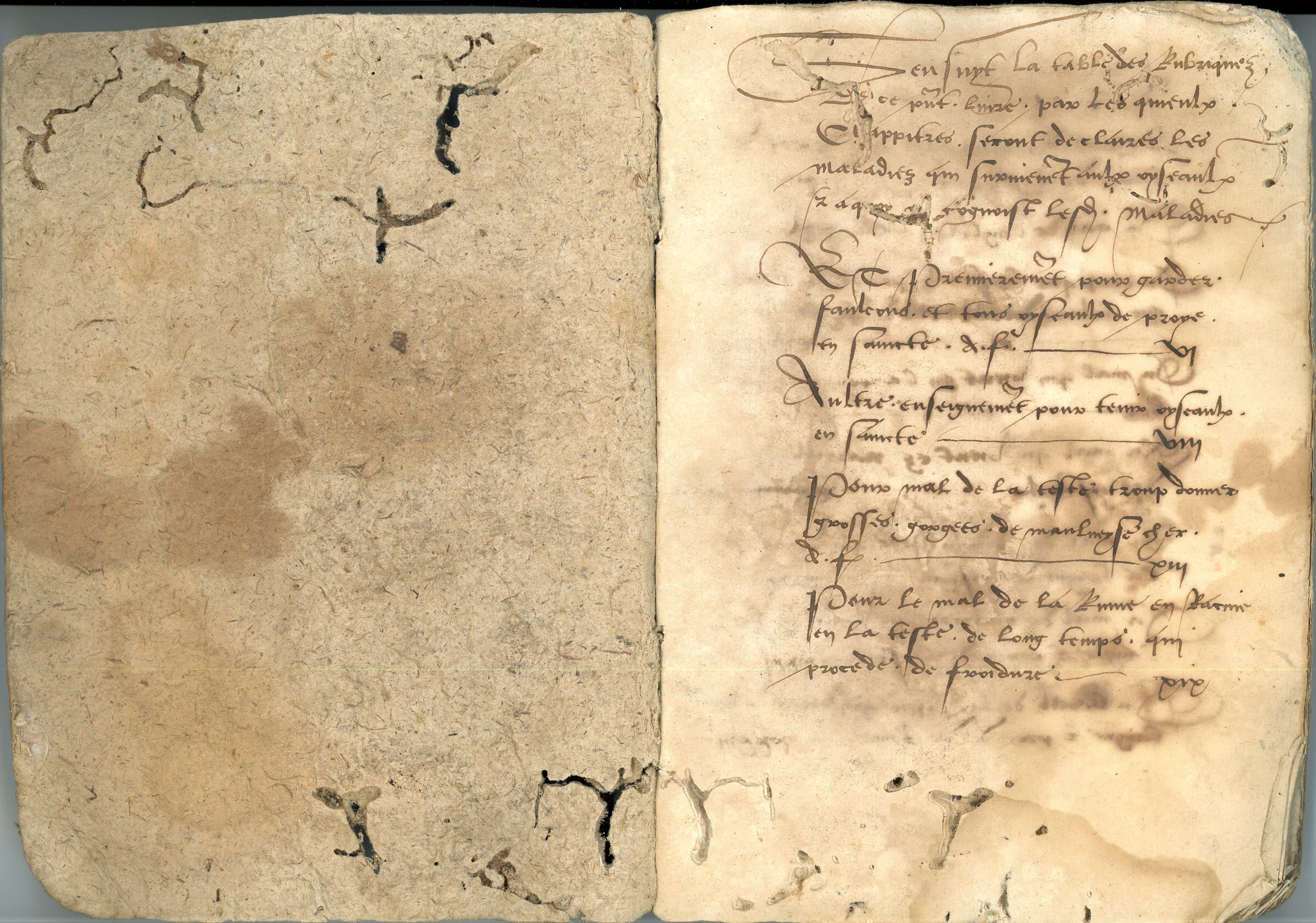 Rarissime manuscrit en français, 2nde moitié du XVIe siècle, encre brune, écrit d'une seule main, 105 ff., cahiers reliés et couverture de papier épais " végétal " ; 21 x 14 cm. En l'état, avec de nombreux trous de vers du livre, mais qui affectent peu le texte.