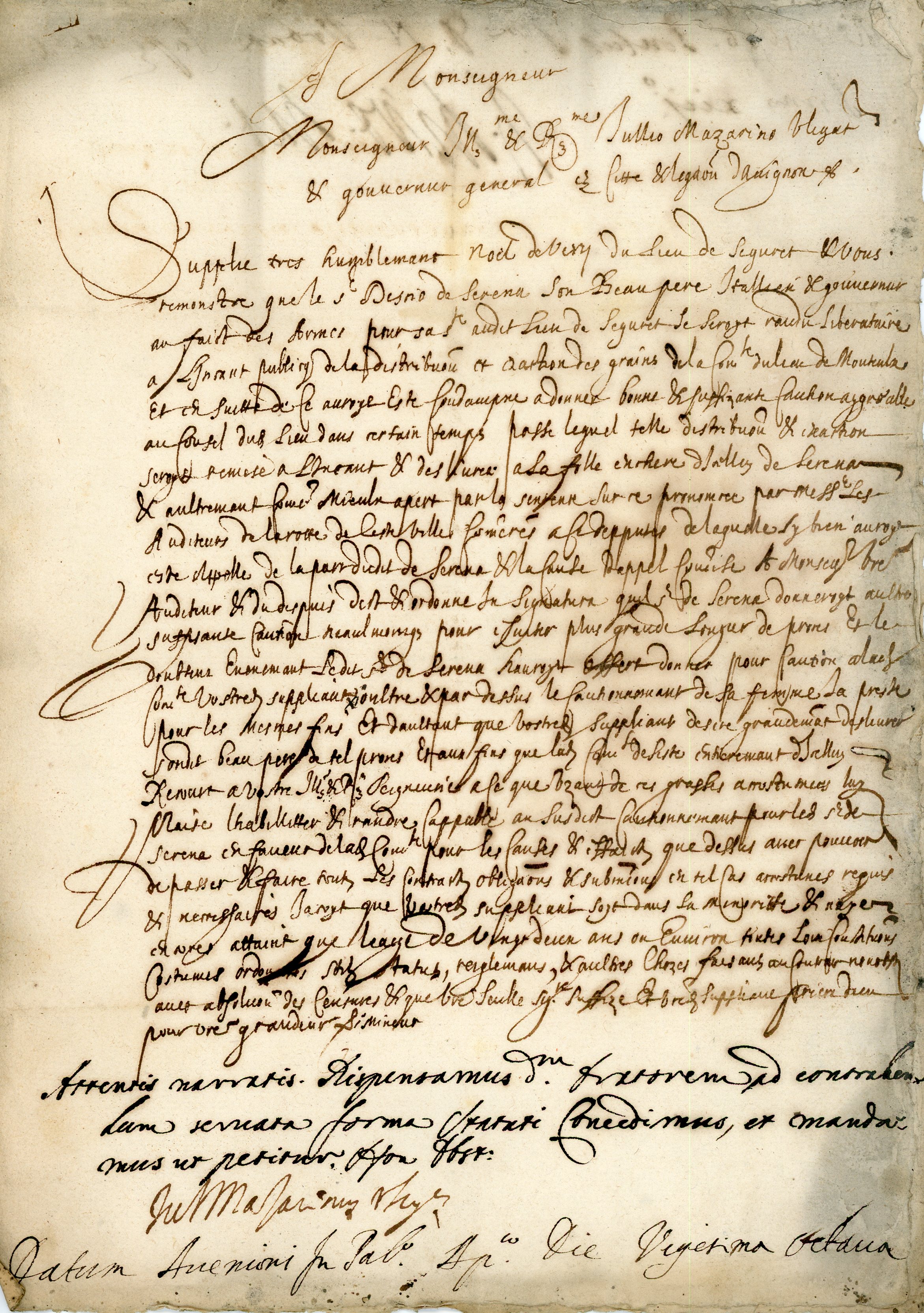 P.S., mai 1636, commençant par " Monseigneur Illme Julles Mazarino V.légat & gouverneur général en cette légation d'Avignon " et signée en bas à gauche " Jul. Mazarino V. Légt ".