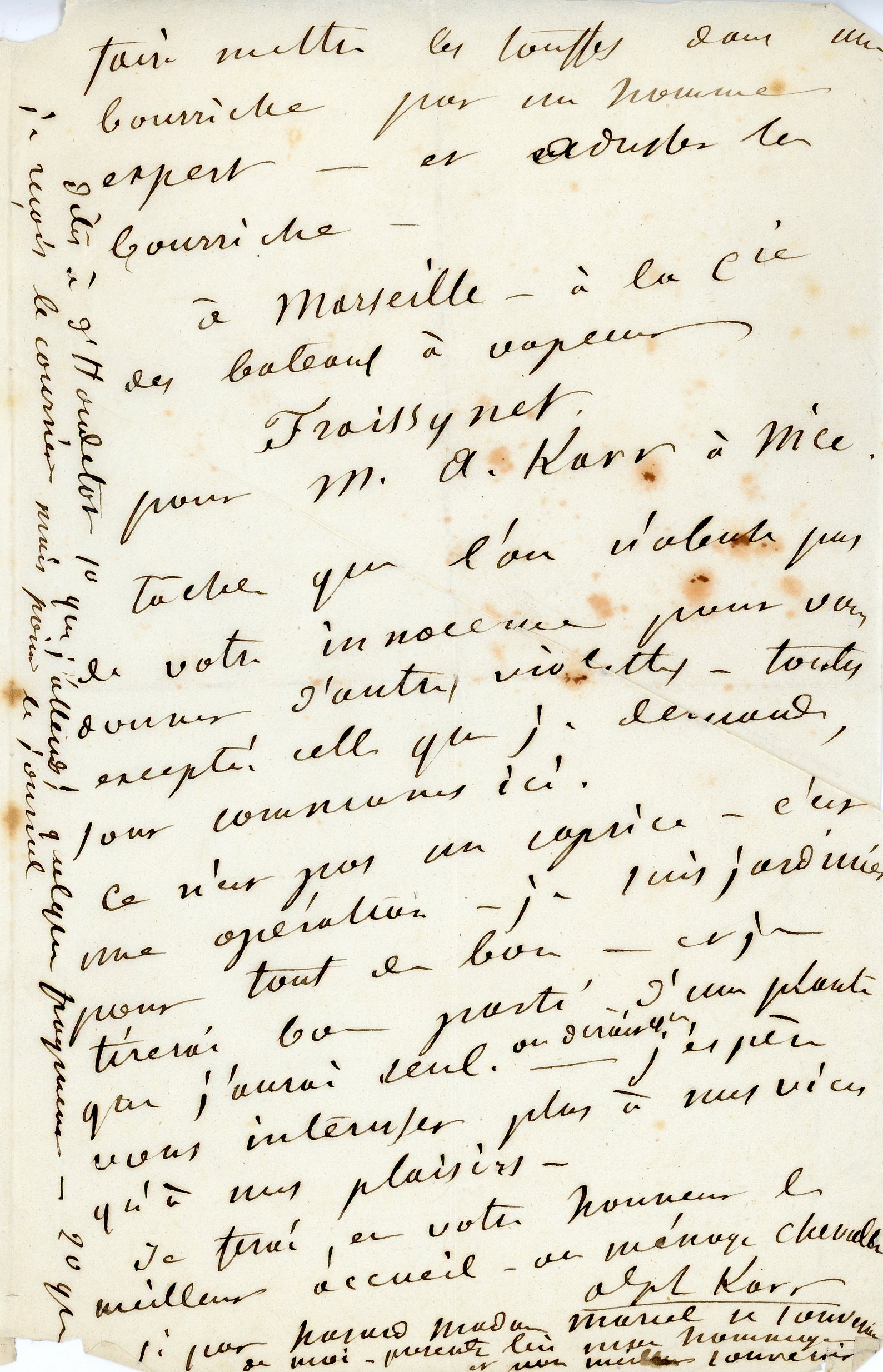 o L.A.S., s.d., Alphonse KARR (1808-1890), écrivain, 2 pages in-8 ; au sujet de son intérêt le jardinage ;