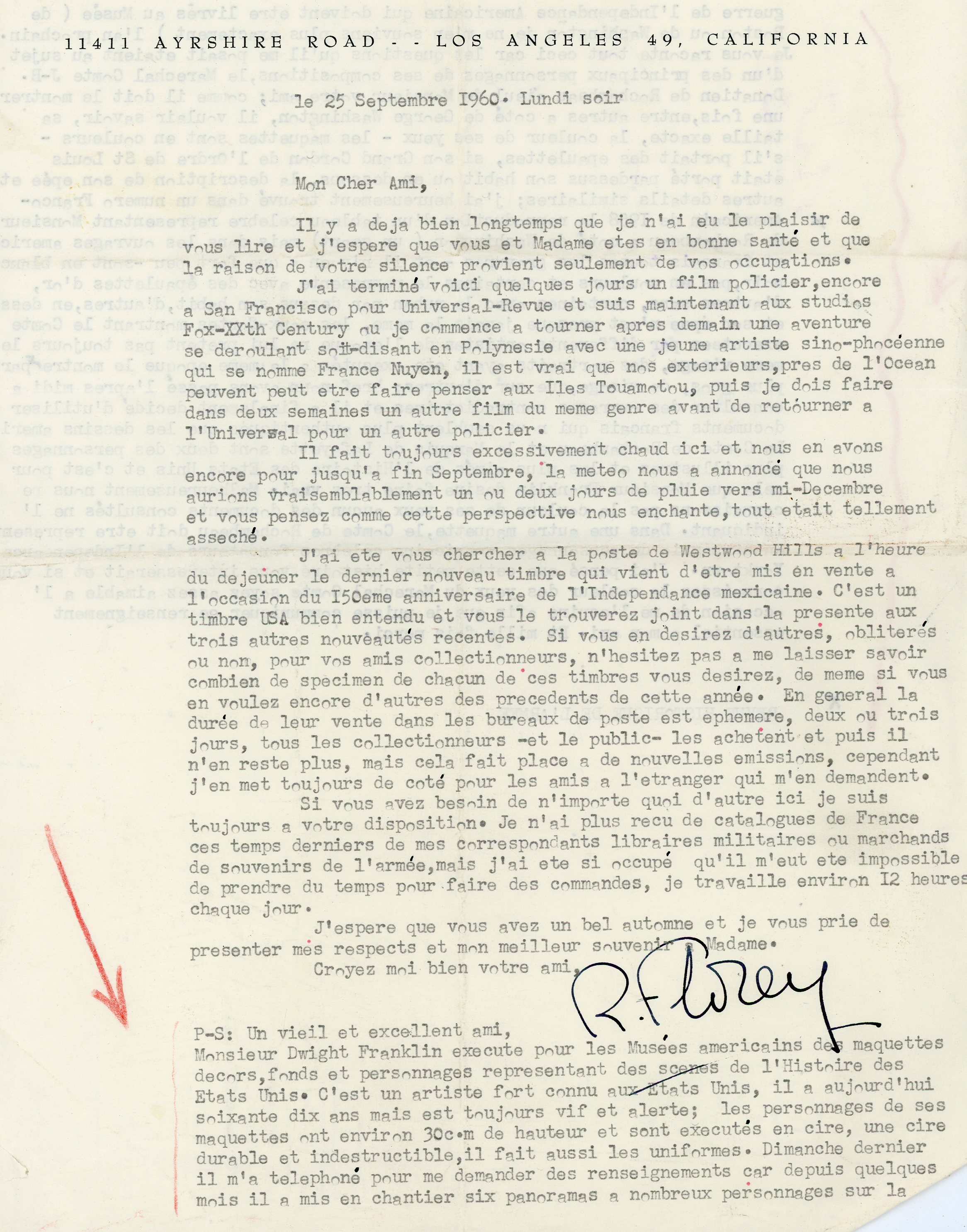 o Robert Gustave Fuchs dit Robert FLOREY (1900-1979), réalisateur, acteur et producteur de cinéma à Hollywood, 2 L.S., 25 septembre et 12 octobre 1960 ;