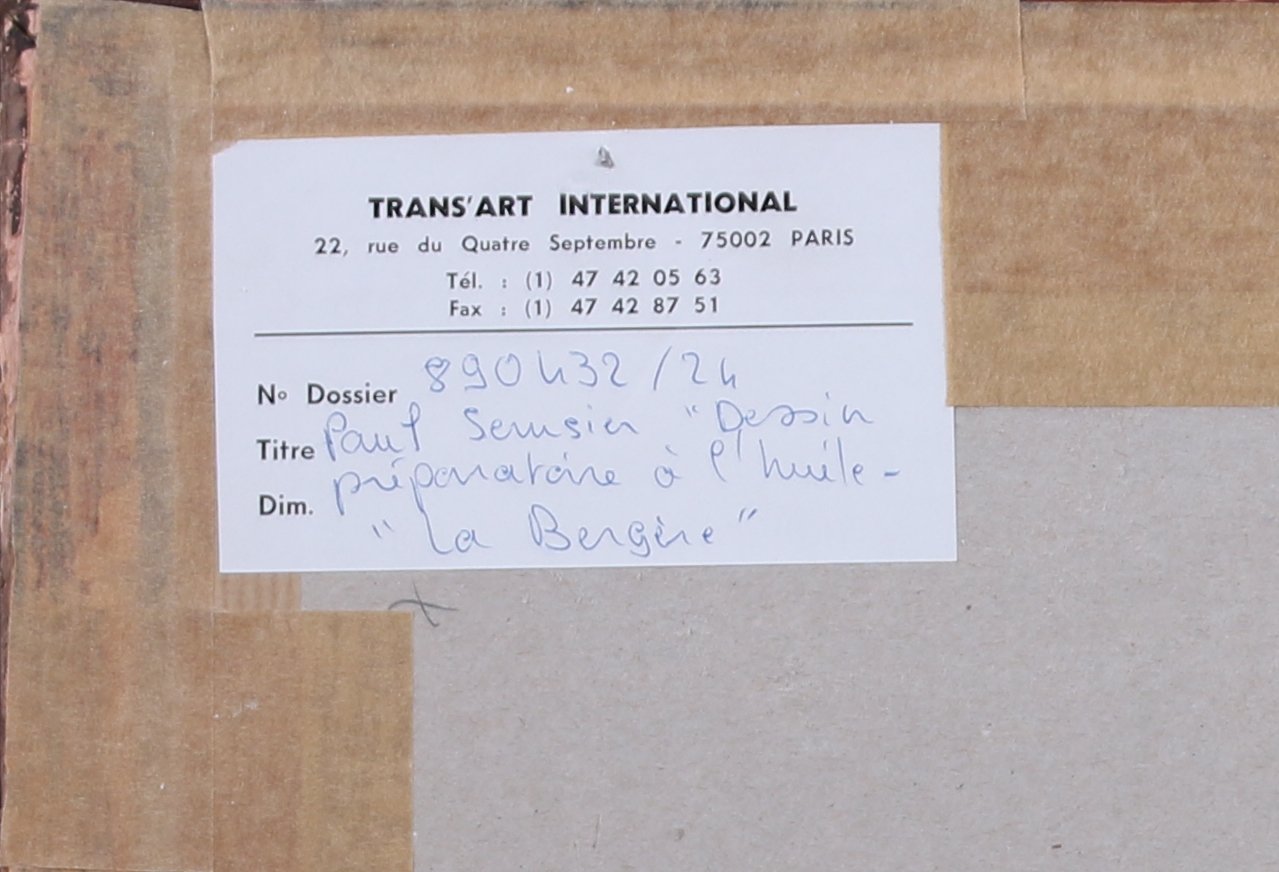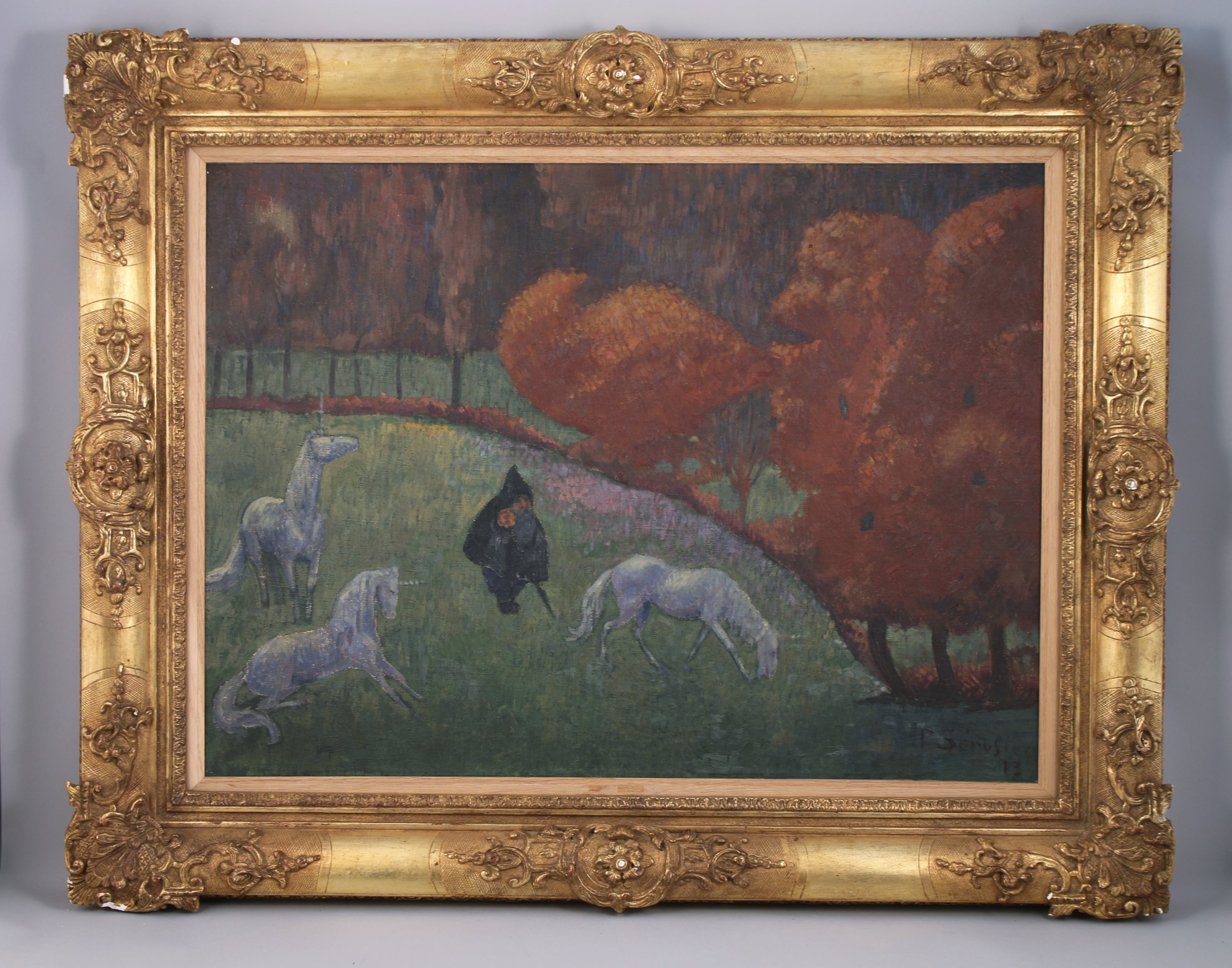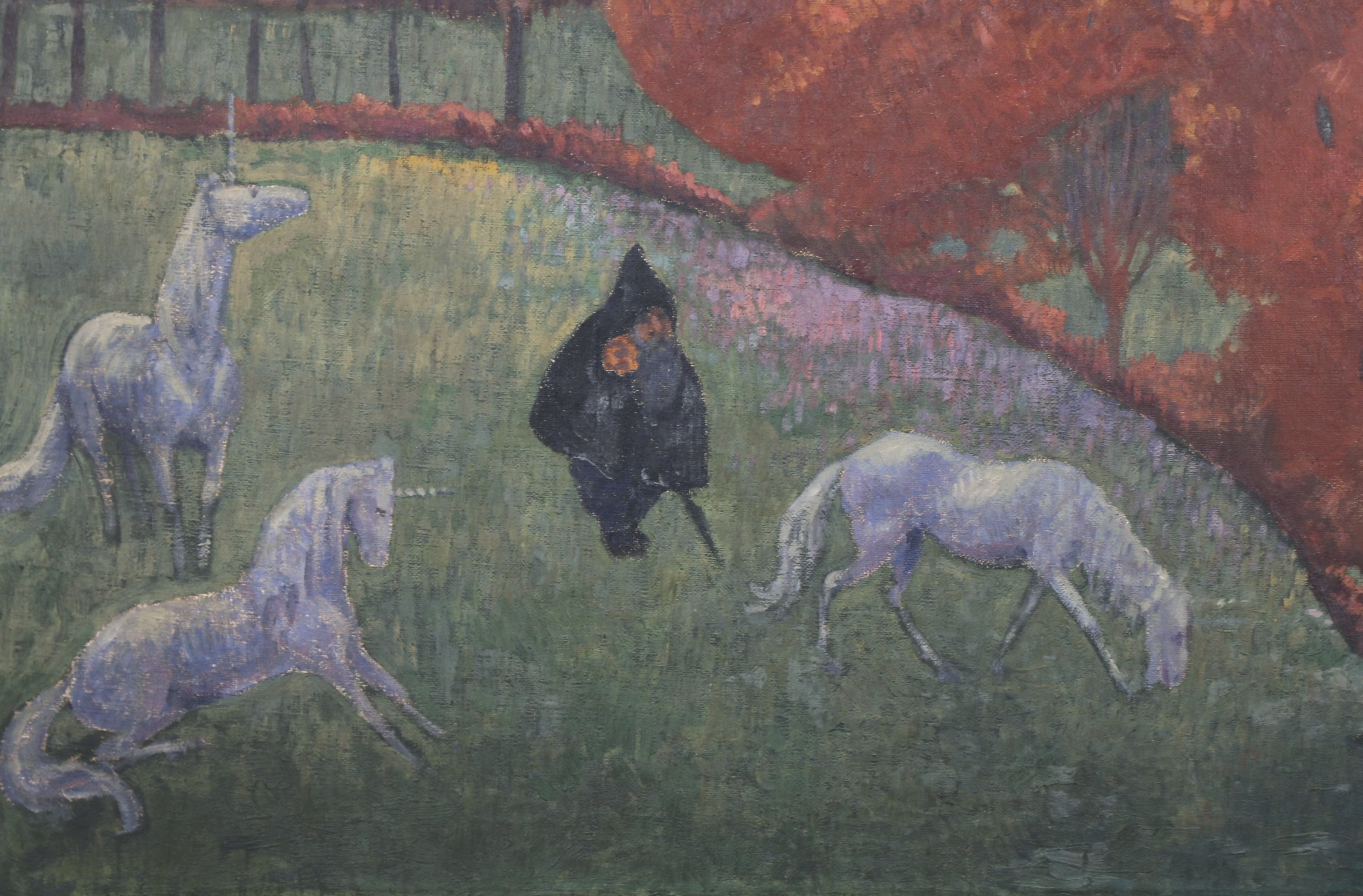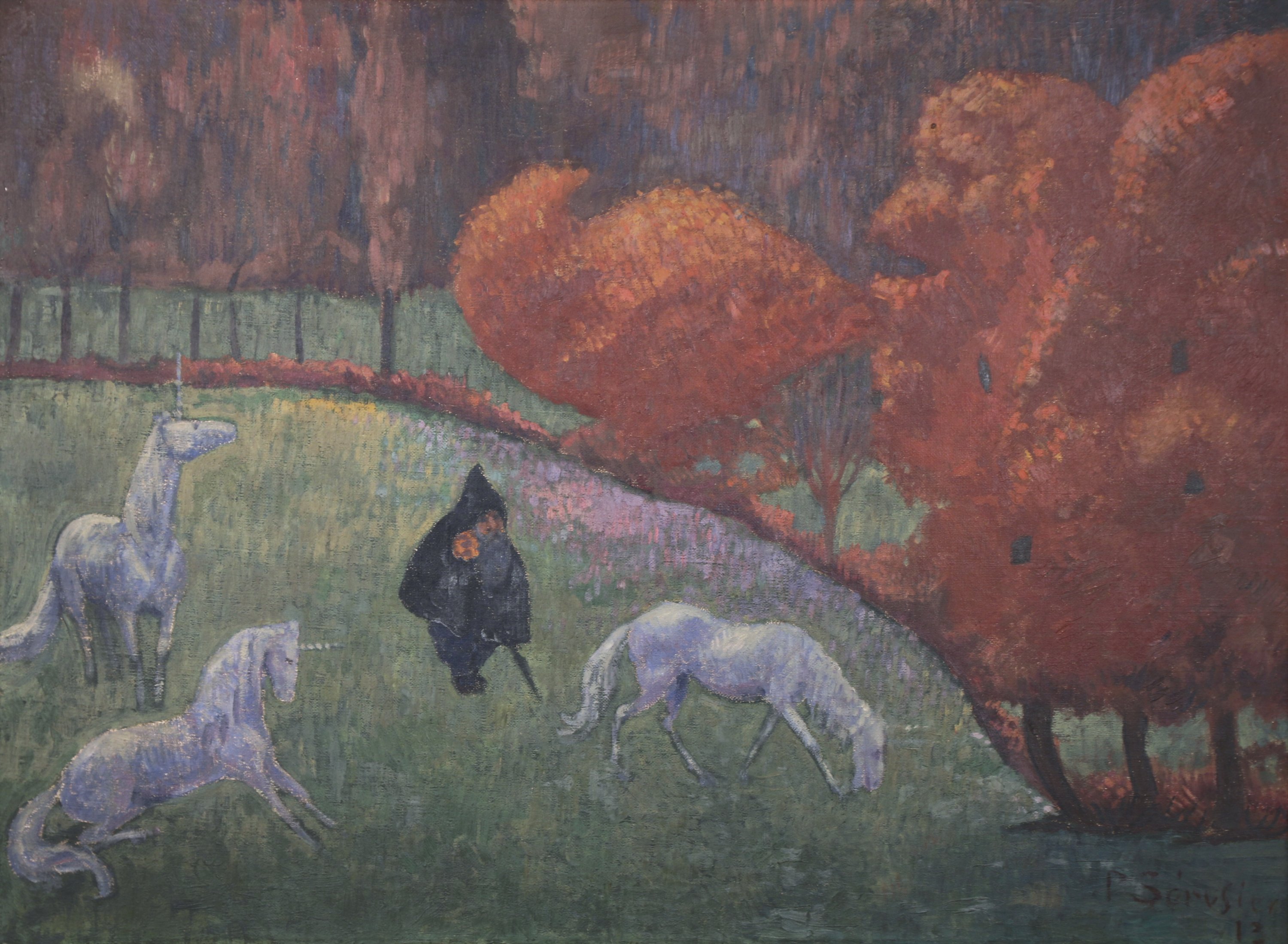 Au Musée de Cluny, Sérusier passe des heures devant la célèbre « Dame à la Licorne » chef duvre du XVIe siècle. Lhuile sur toile que nous présentons date de 1913, un an après le mariage de Paul et de Marguerite. Exceptionnellement accompagnée de son dessin préparatoire, un personnage moitié mage moitié berger est entouré de trois licornes dans un paysage aux couleurs typiquement nabis. On y lit le symbole de la pureté qui unit deux artistes et la référence absolue à une tapisserie chérie.
