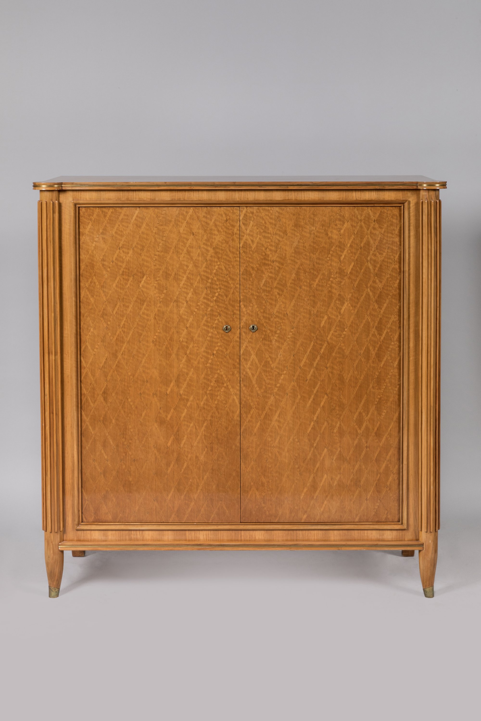 en érable et placage d'érable ouvrant à deux portes à marqueterie losangée découvrant des étagères. Les portes sont flanquées de deux colonnes cannelées en relief. Ornée de filets de laiton dencadrement et sabots antérieurs.