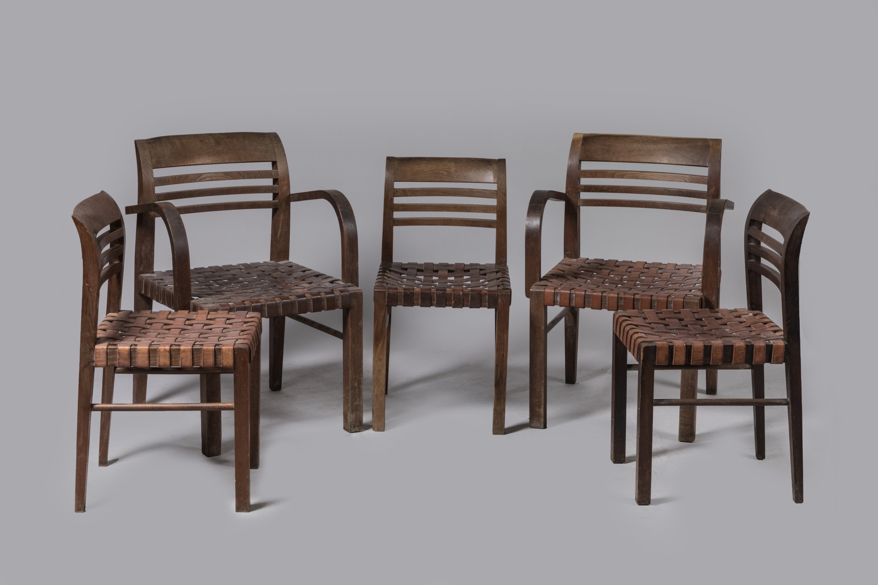 - Trois CHAISES en chêne à dossier renversé et composé de trois barreaux épousant la forme du dos, l'assise garnie de lanières de cuir entrecroisées. Quatre pieds, les antérieurs droits et les postérieurs gaines réunis par une entretoise circulaire. (H. 78, L. 41, P. 42,5 cm.)