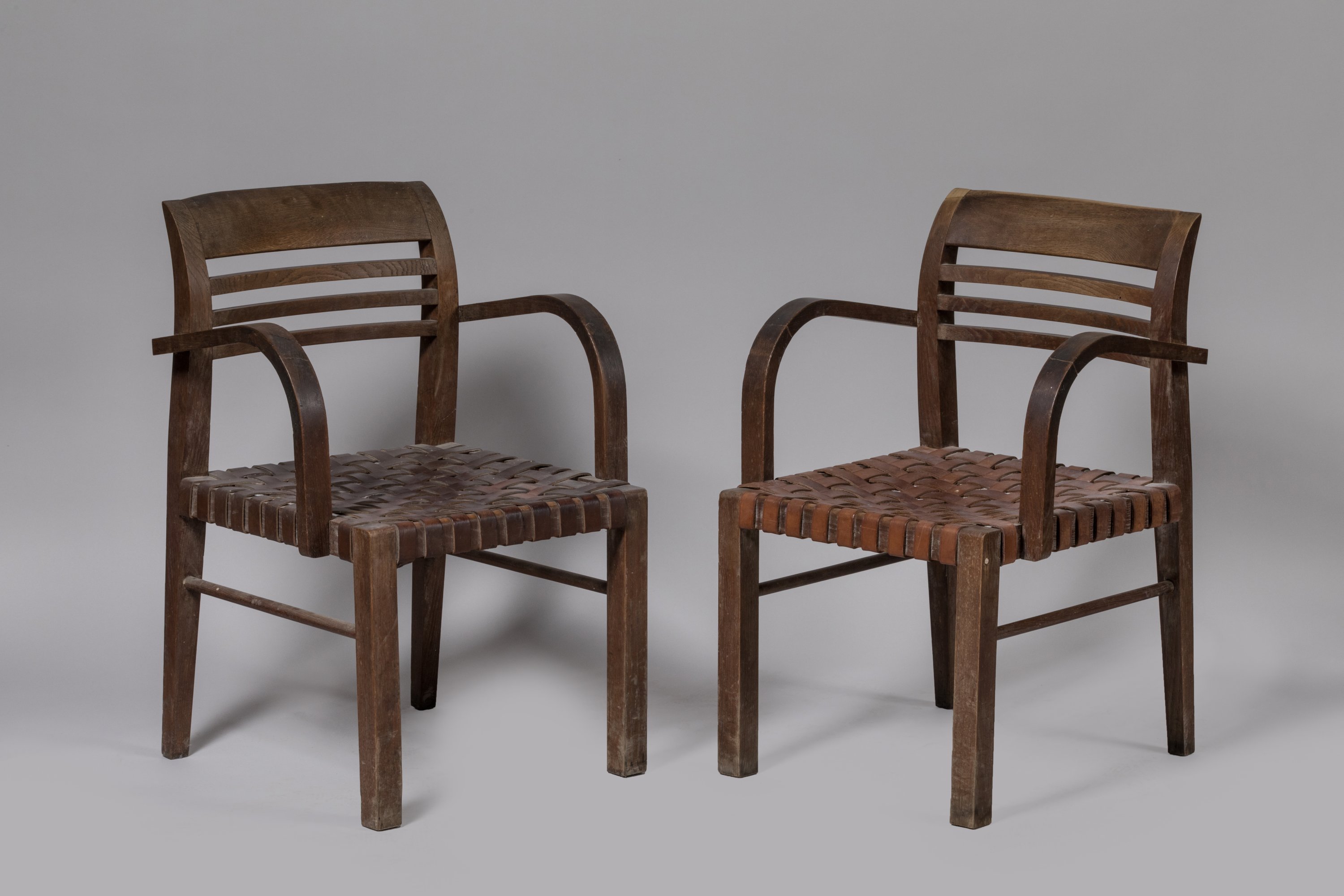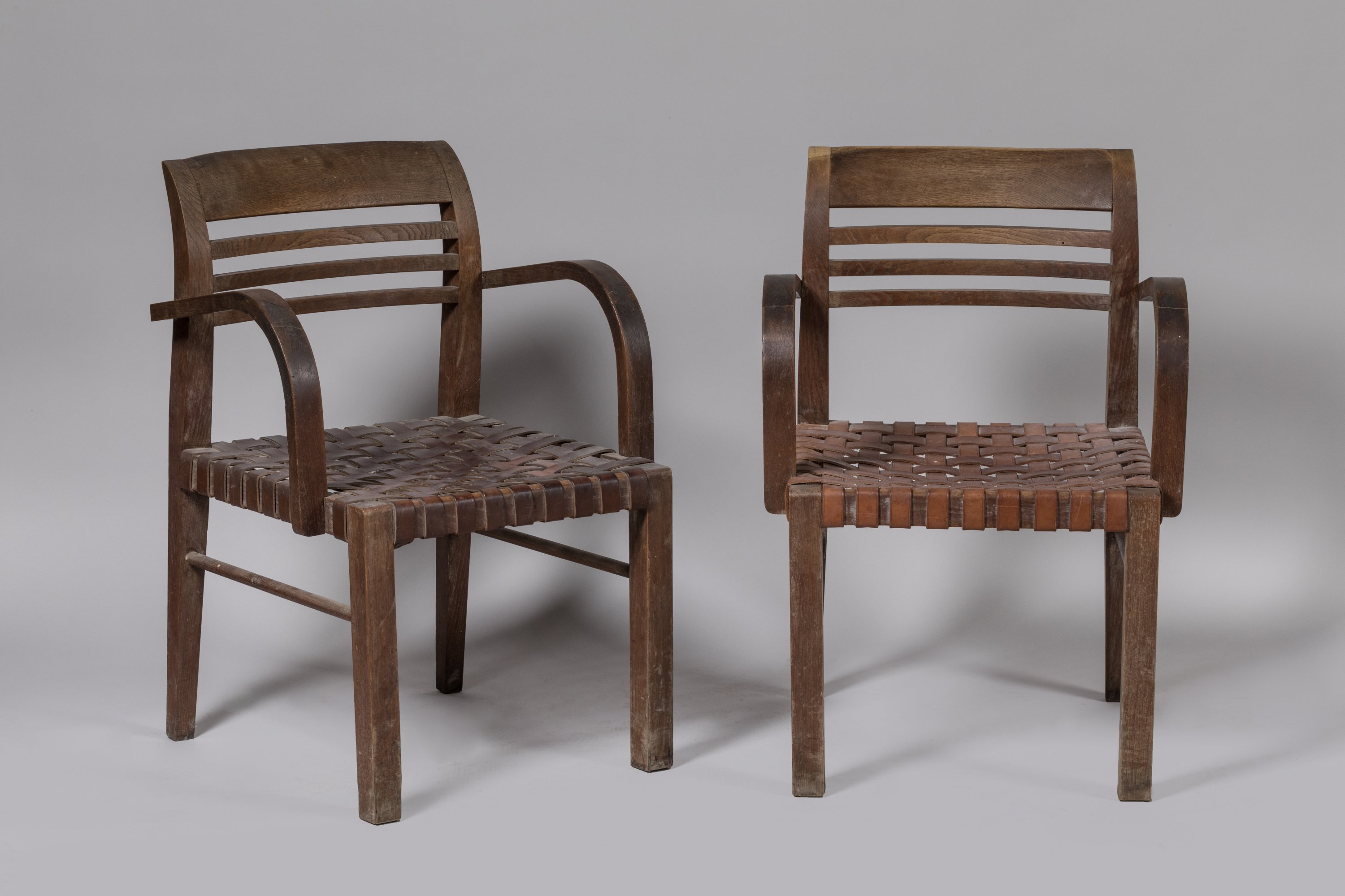 Diplômé de l'École des arts décoratifs en 1917 après une formation initiale à l'École Germain Pilon de Paris, René Gabriel s'engage dès les années 1930 en tant que défenseur d'un mobilier moderne pour tous. Son mobilier solide à prix modeste tend à répondre aux besoins d'ameublement de ses contemporains. Pour entreprendre cette réduction des coûts, il conçoit ses meubles à partir de matériaux économiques tels que le chêne ciré ou le hêtre verni découpés mécaniquement et assemblés par modules pour une " fabrication d'éléments de mobilier divers ". Il propose au Salon des artistes décorateur de 1934 un modèle de fauteuil très similaire à celui que nous défendons. Il use ainsi des accotoirs à enroulement et des lanières de cuir tressées. Mais son attachement à la production de meubles populaires prend tout son sens lors de la Reconstruction. En effet, il prend part à l'ameublement des immeubles d'habitation d'Auguste Perret au Havre. Les salles à manger comprennent ainsi un " buffet, une table rectangulaire, des chaises et des fauteuils dont " l'assise est tendue de lanières de cuir entrecroisées " (in BRUNHAMMER, Yvonne, Le mobilier français 1930-1960, Massin, p. 104). Notre chaise et notre fauteuil s'inscrivent pleinement entre le modernisme et " style Reconstruction " des années 1945-1950 de René Gabriel.