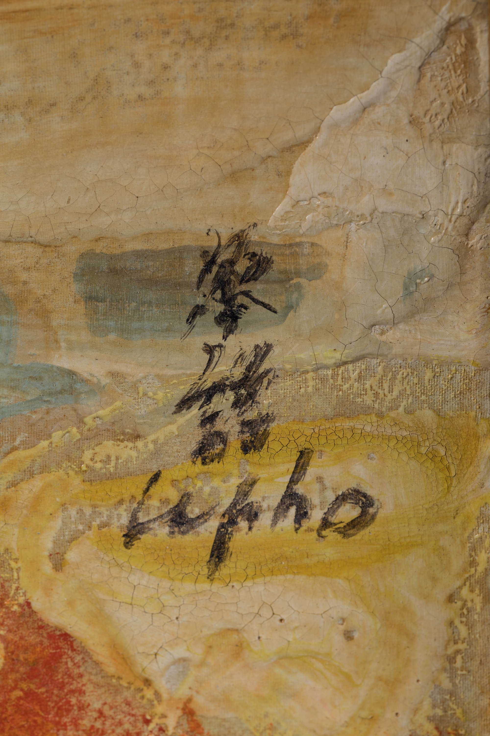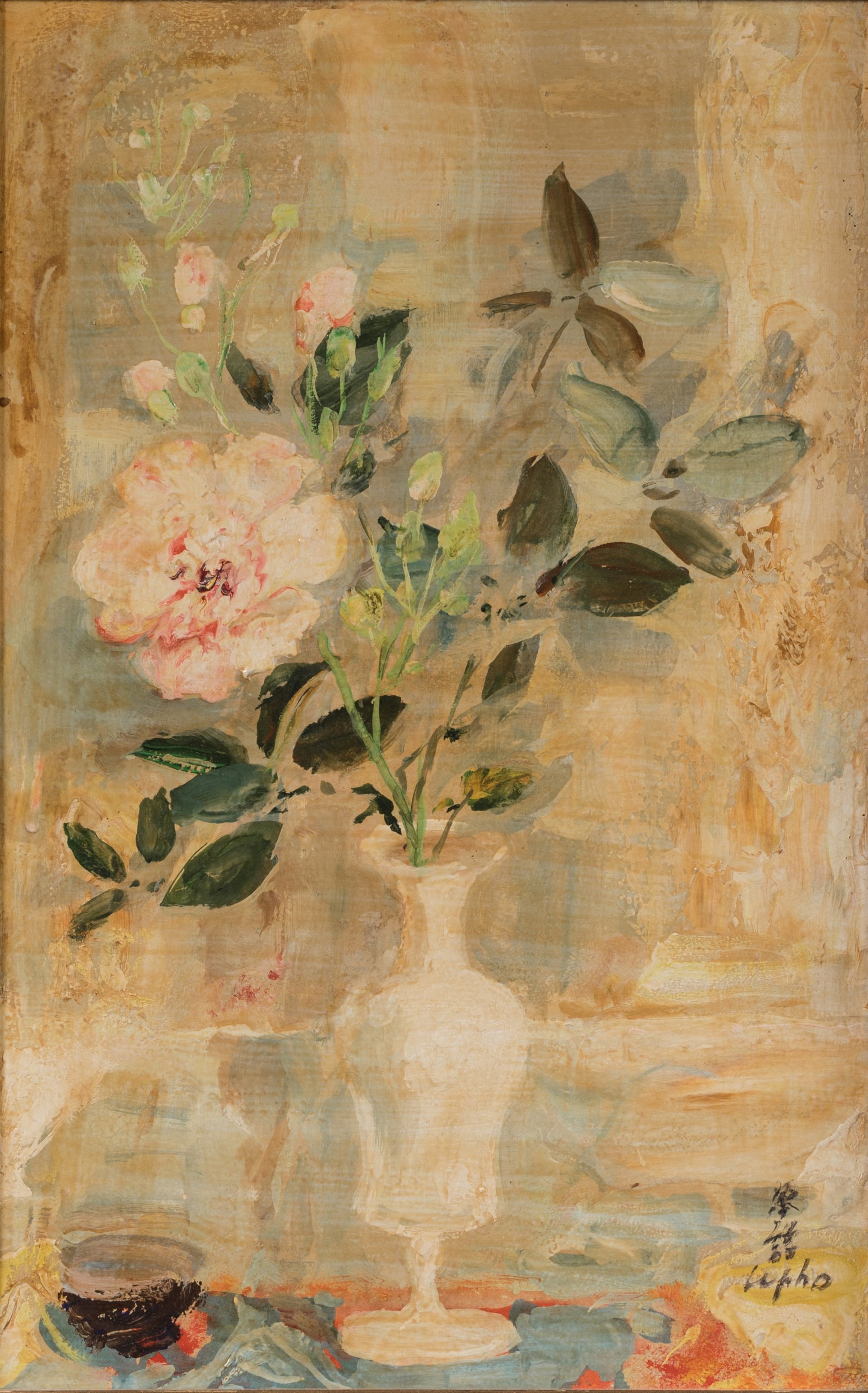 Nourri de l'influence de Matisse par l'intermédiaire de Victor Tardieu, Lê Pho livre des bouquets de fleurs aux compositions étudiées. Nos deux uvres nous frappent par leur support, deux toiles de soie contrecollées sur isorel, la fibre accrochant la peinture d'une façon singulière. Avec leur double signature, cachet en idéogramme et lettres latines, Lê Pho s'installe entre les deux mondes.